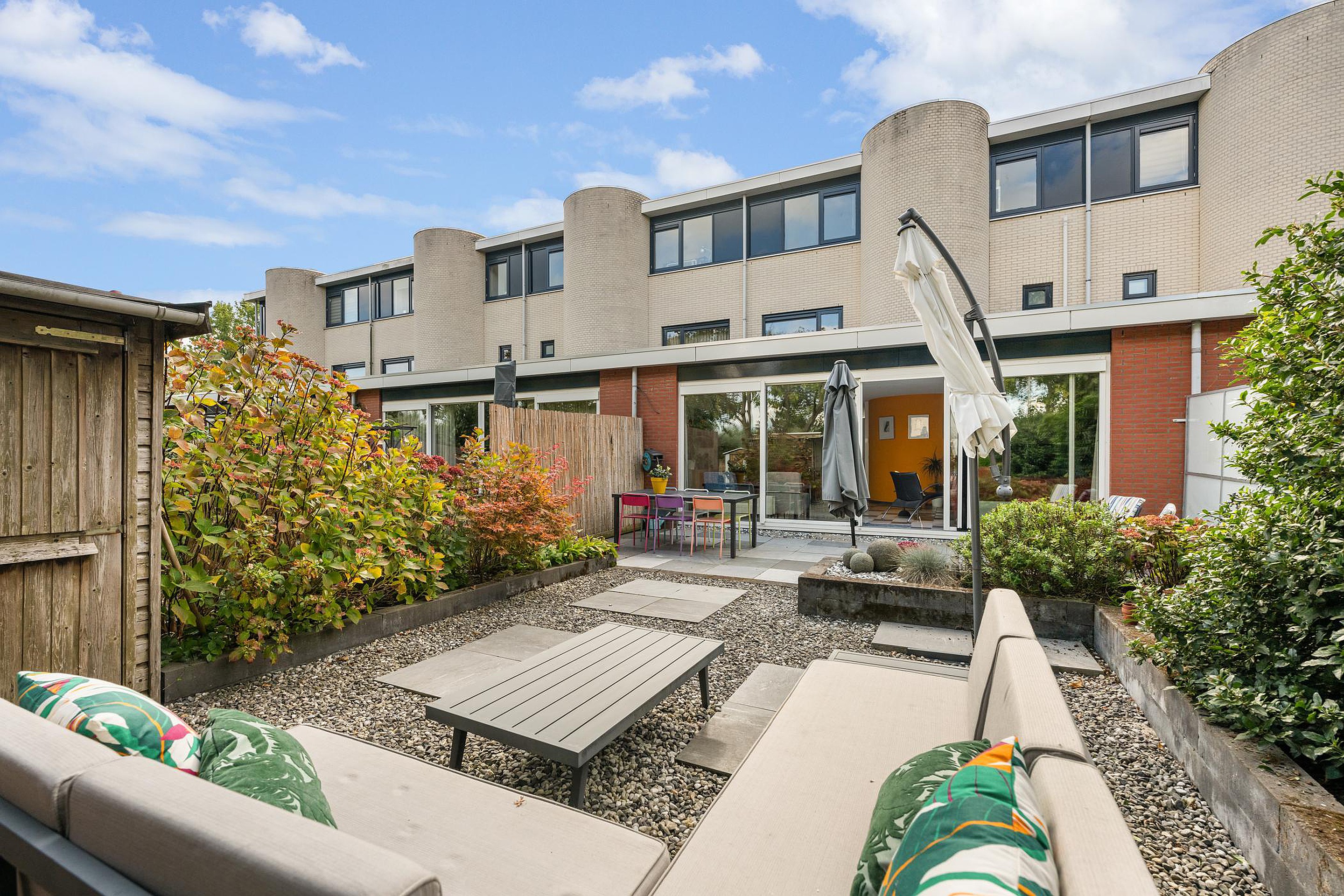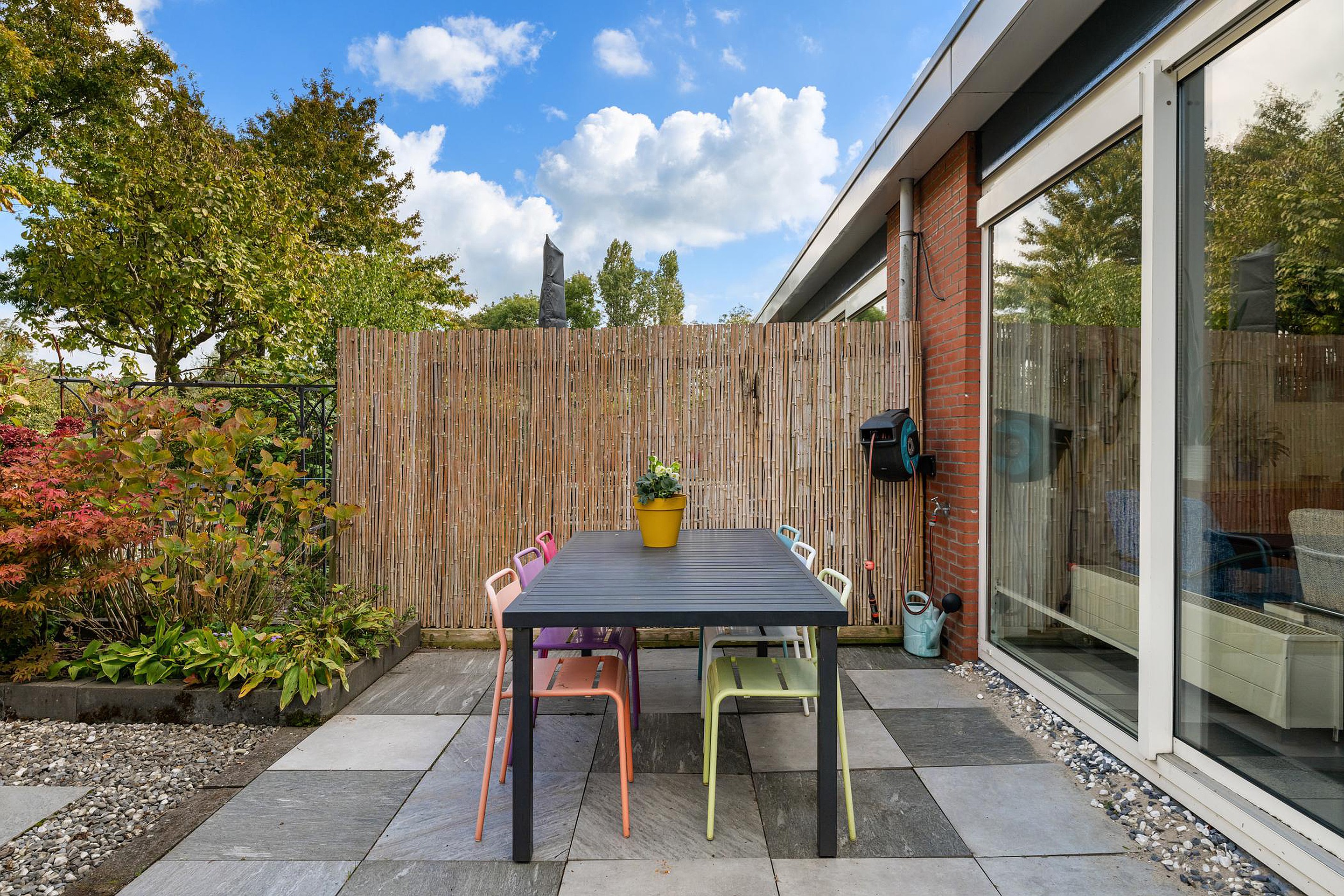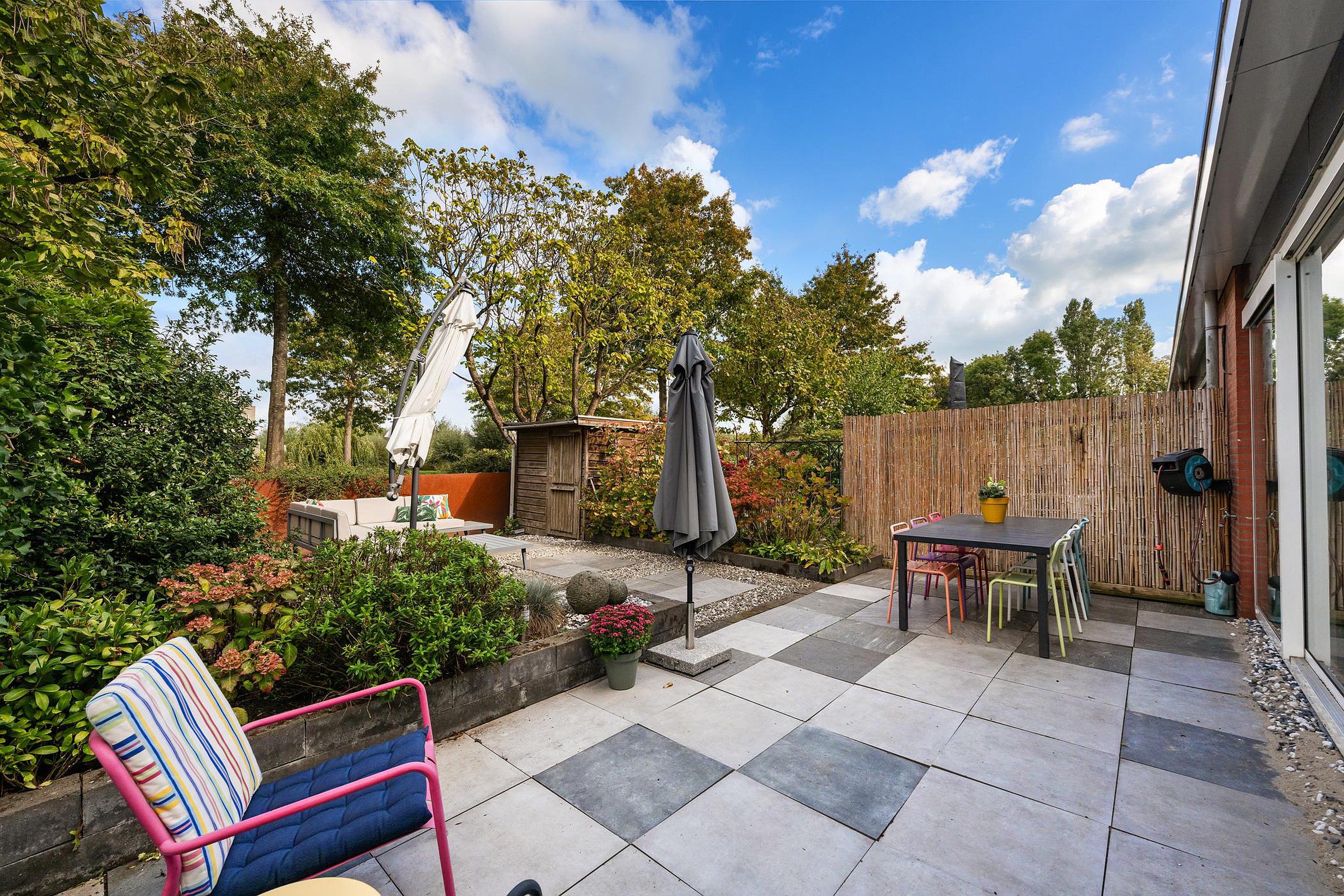 De brede en zonnige achtertuin heeft een open ligging en grenst aan een groenstrook.