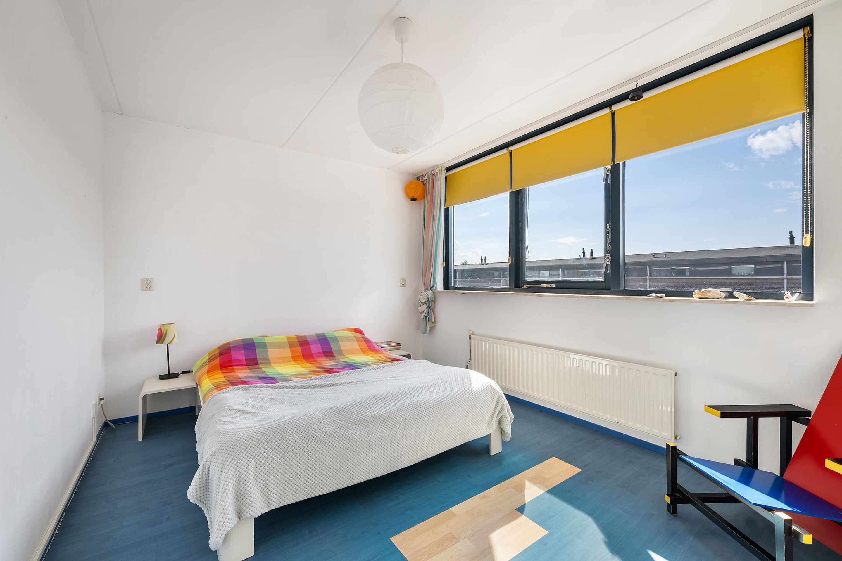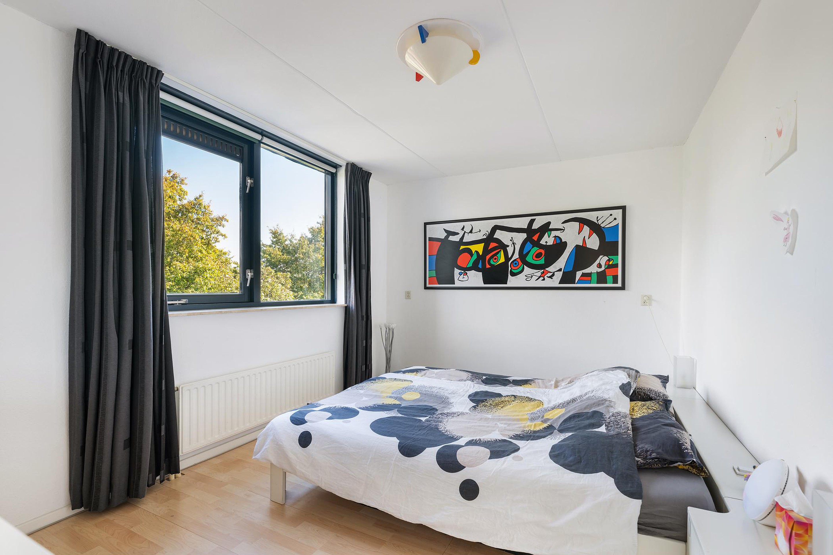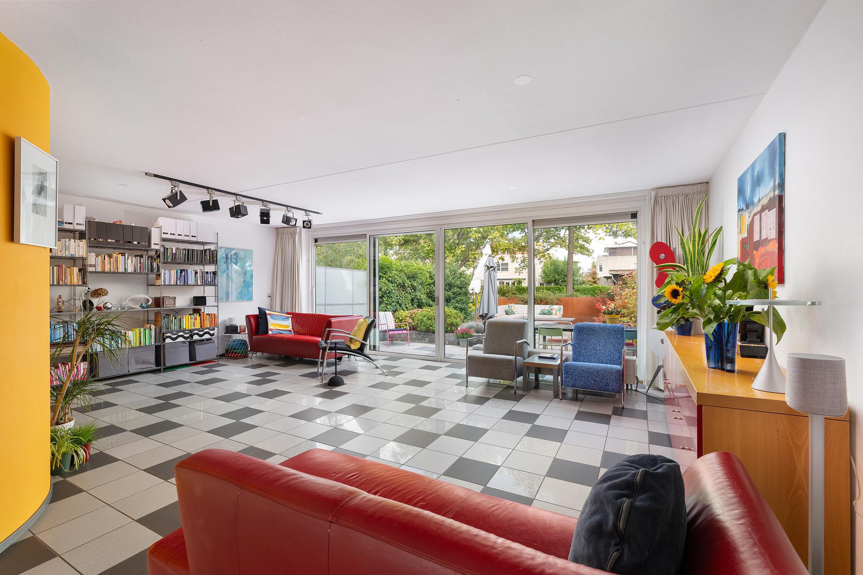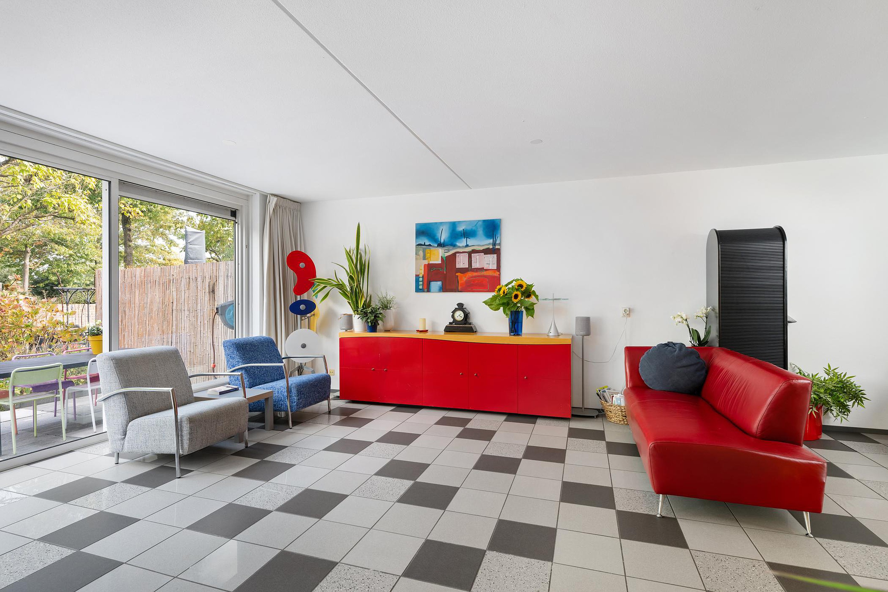 Wat direct opvalt als je de lichte kamer binnenstapt, is de enorme ruimte en de mooie kamerbrede pui.