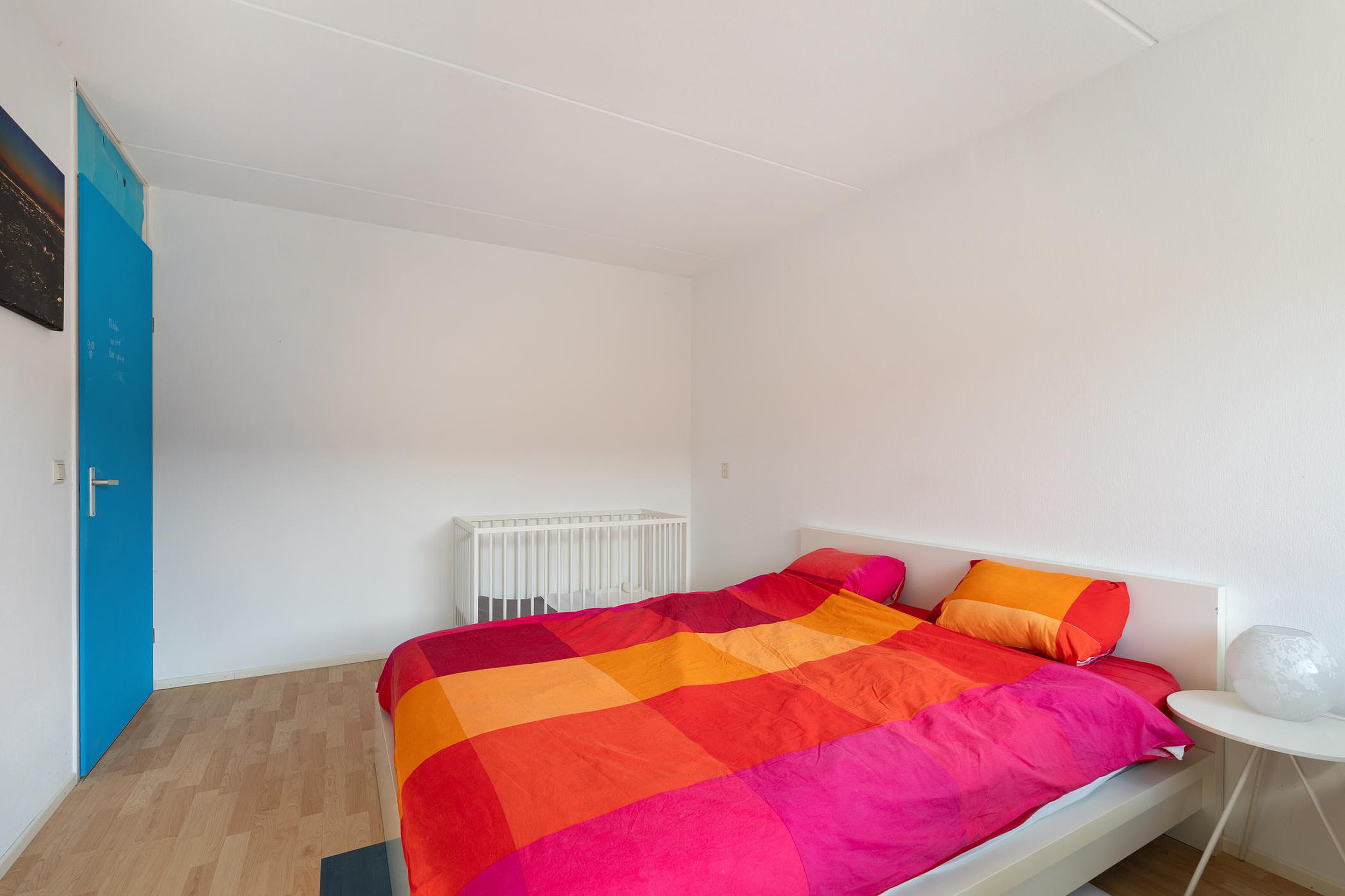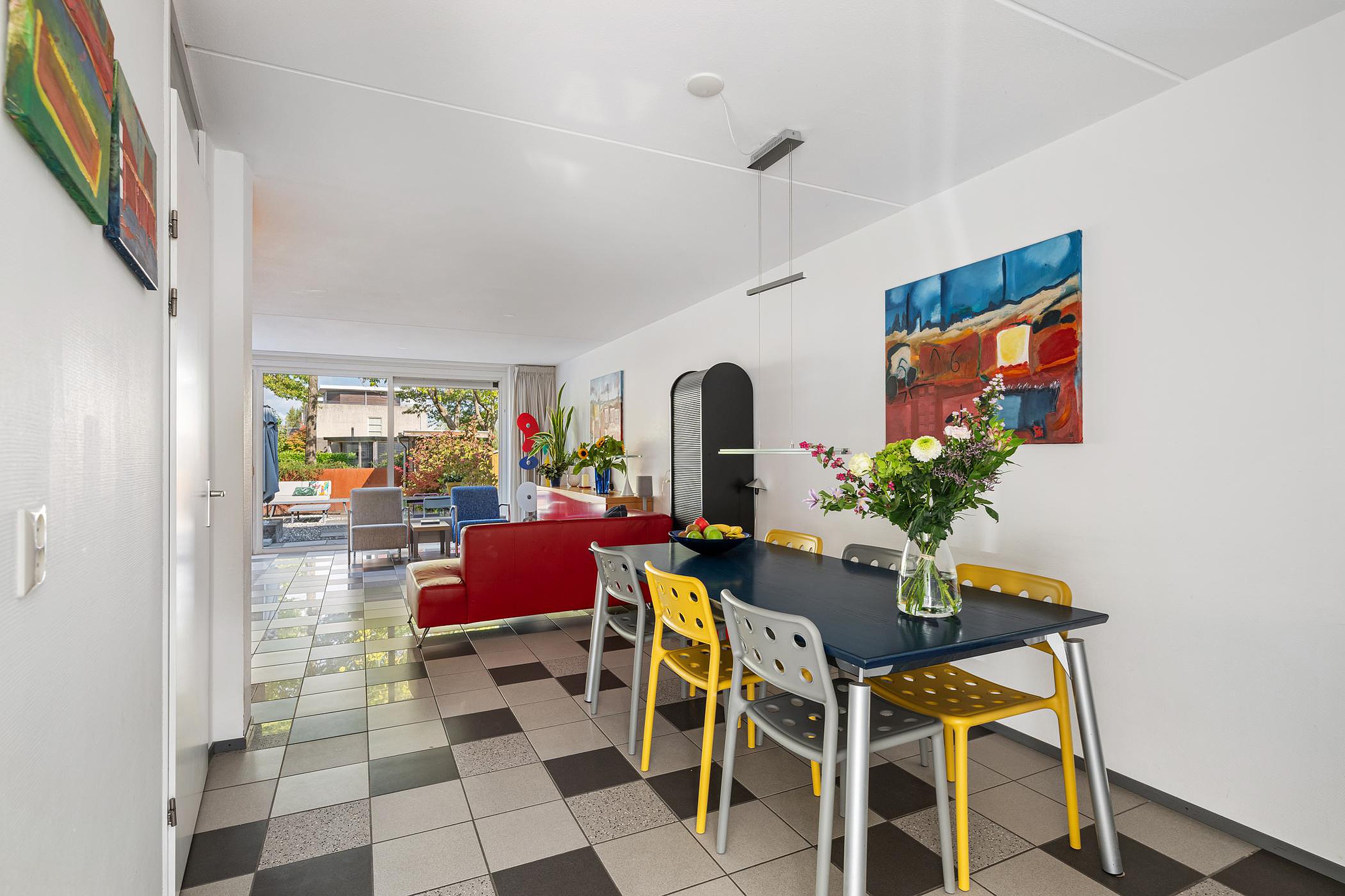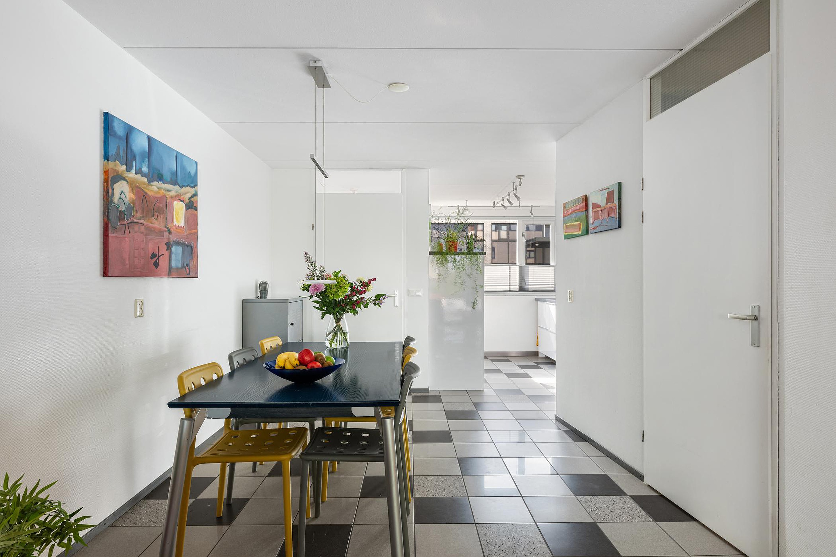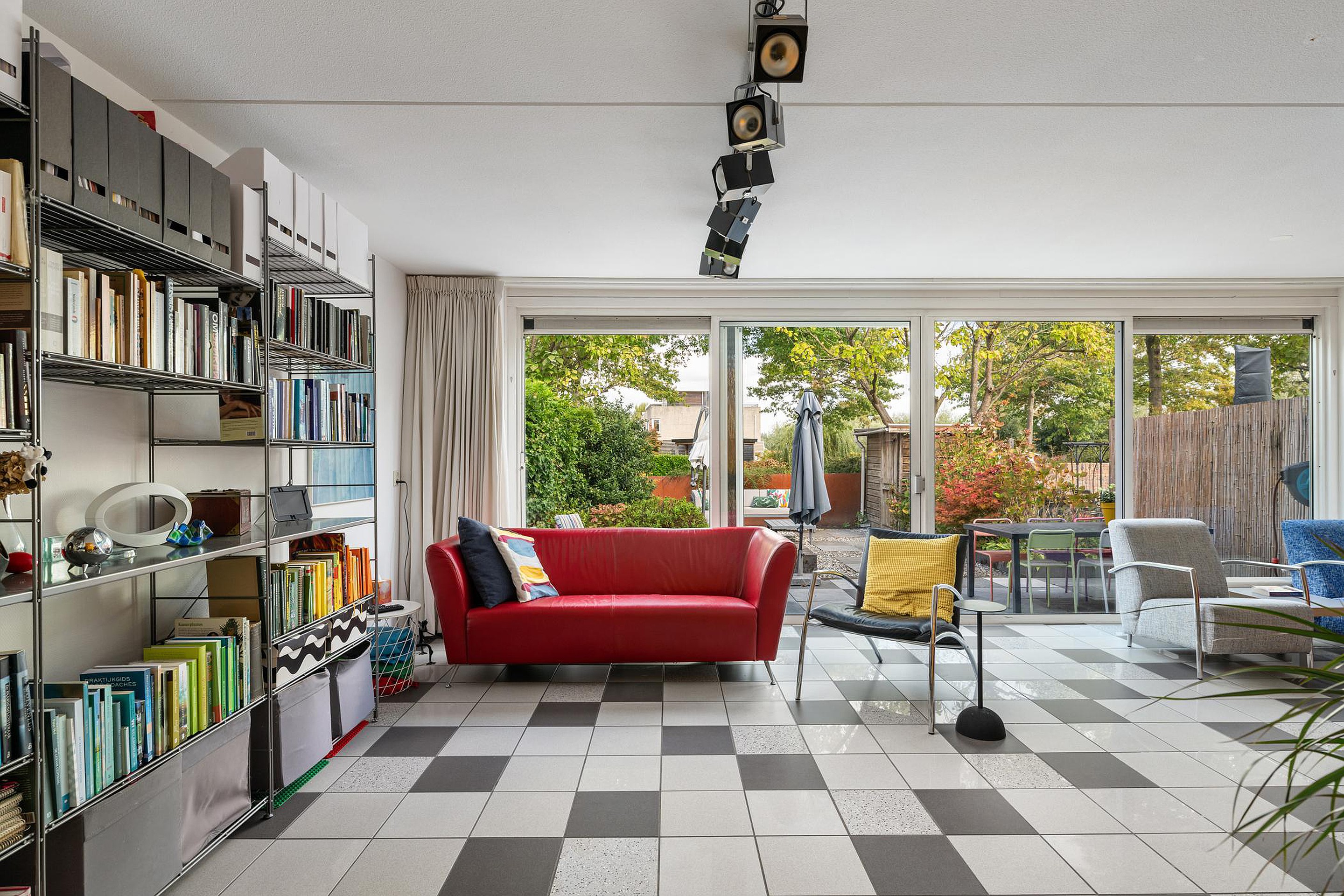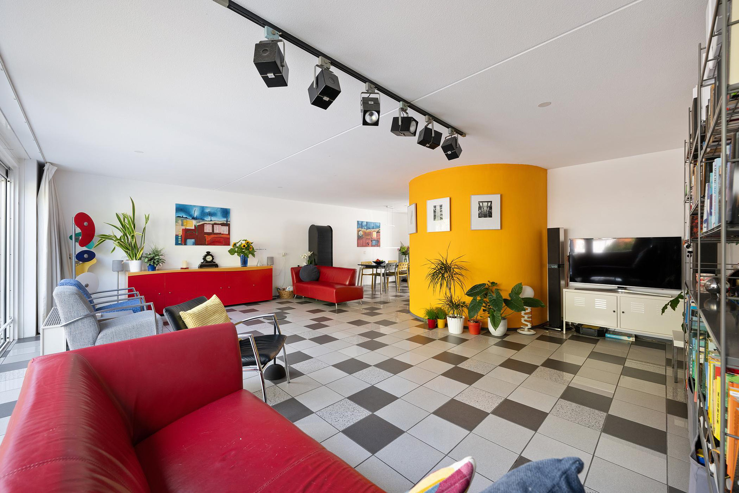 Wat direct opvalt als je de lichte kamer binnenstapt, is de enorme ruimte en de mooie kamerbrede pui.