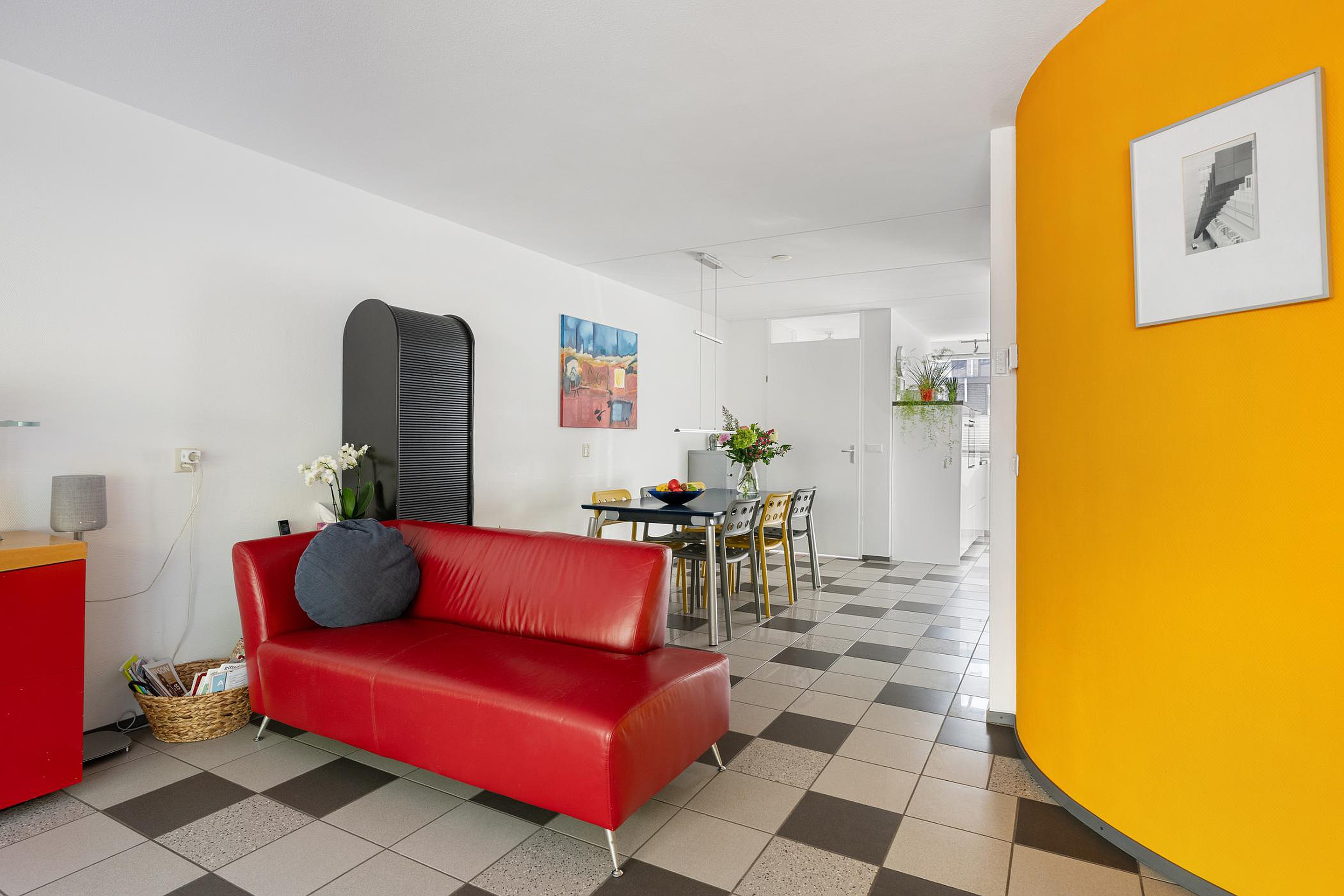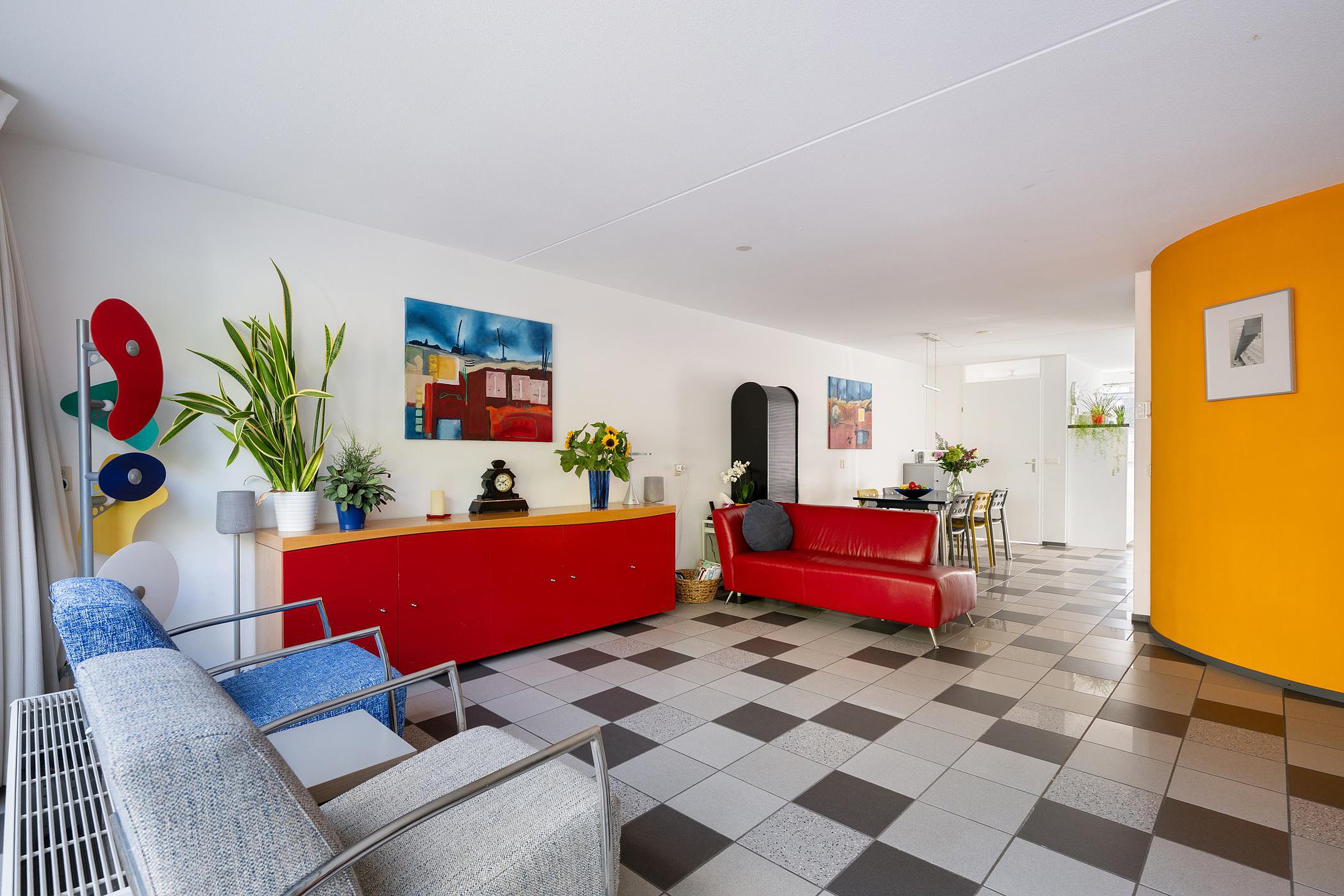 De kamer is ruim 7 meter breed! De totale oppervlakte is ca 45m2 en onderverdeeld in zitgedeelte aan de tuinzijde en eetgedeelte in het verlengde van de keuken. Vanuit zitgedeelte vrij uitzicht. Het eetgedeelte biedt voldoende ruimte voor het plaatsen van een grote tafel. Het halfronde trappenhuis geeft een leuk effect aan de kamer.