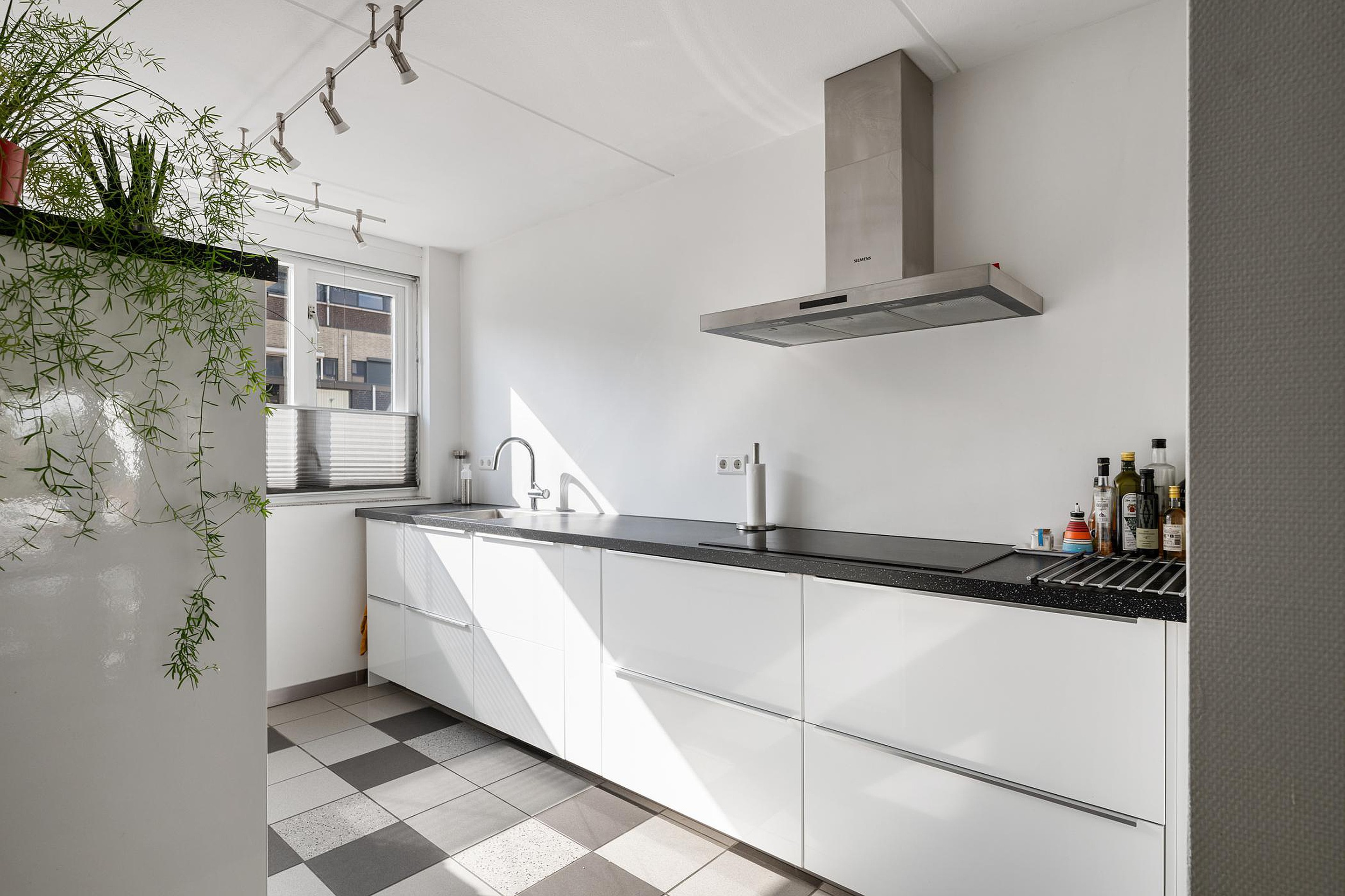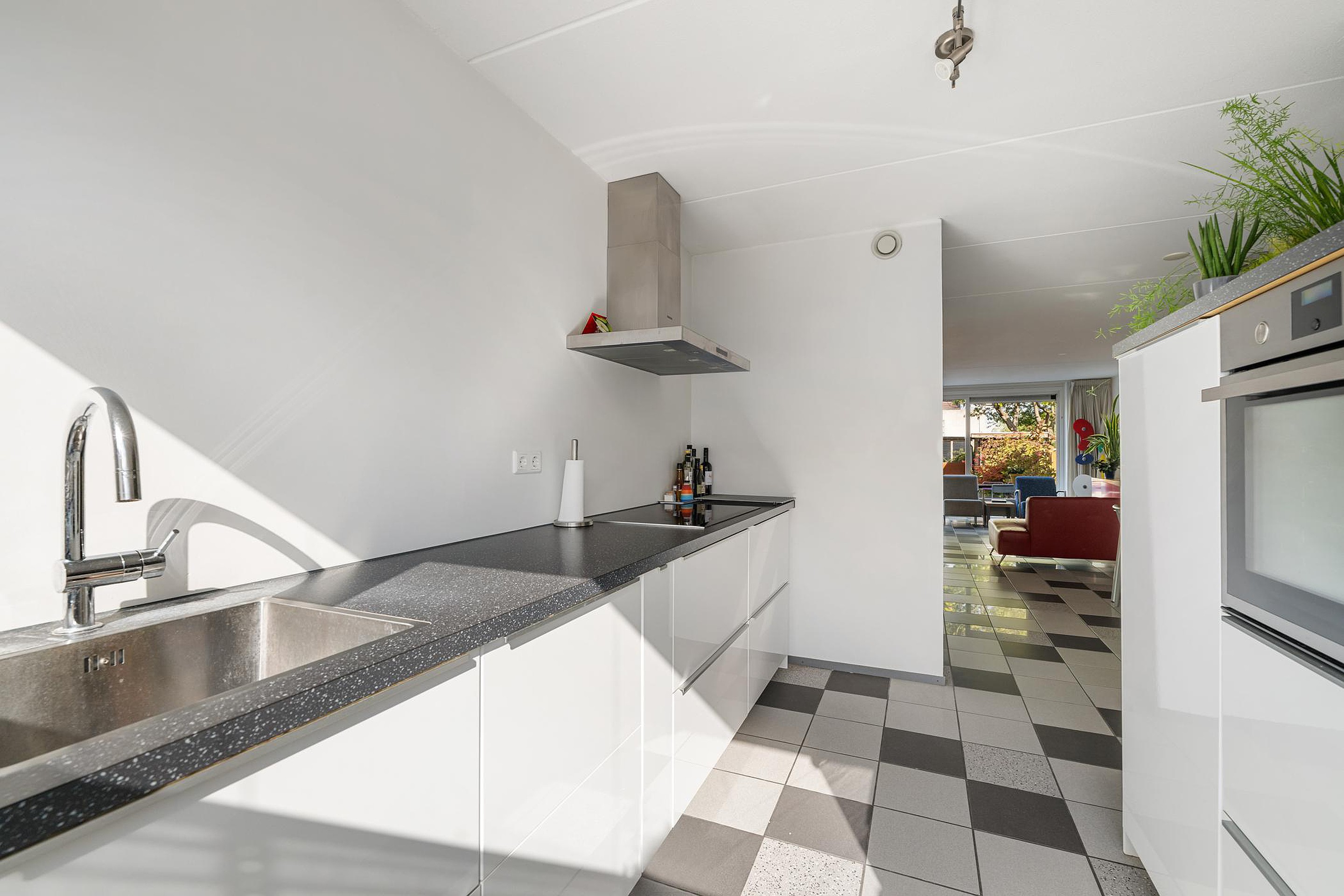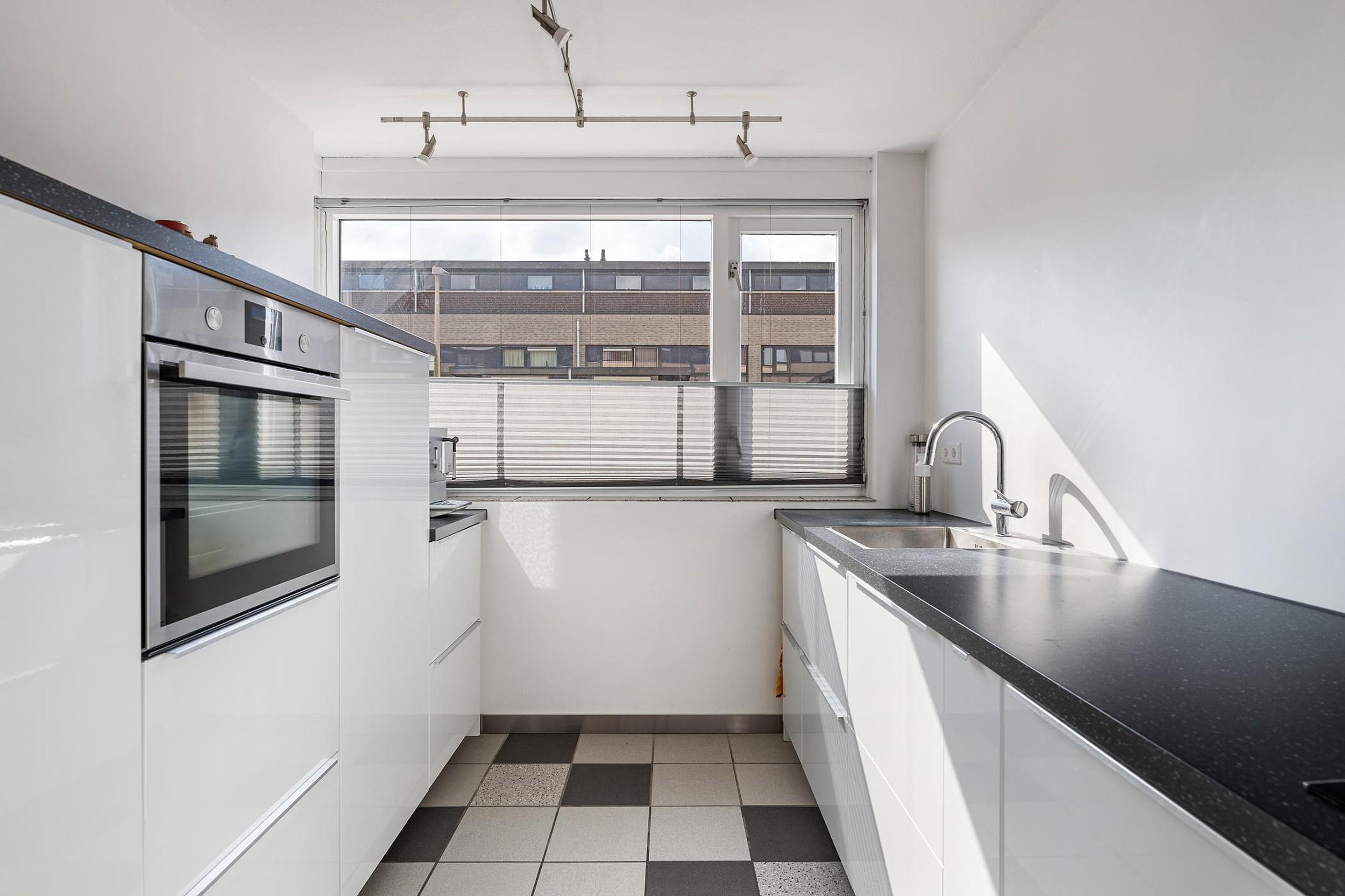 Open keuken (3.60 x 2.47m) aan voorzijde van het huis met modern uitgevoerde keuken (2016) in parallel opstelling. Voldoende kastruimte en praktische laden. Inbouwapparatuur: inductiekookplaat, afzuigkap, oven, koel/vrieskast en vaatwasser. Close in boiler voor warm water.