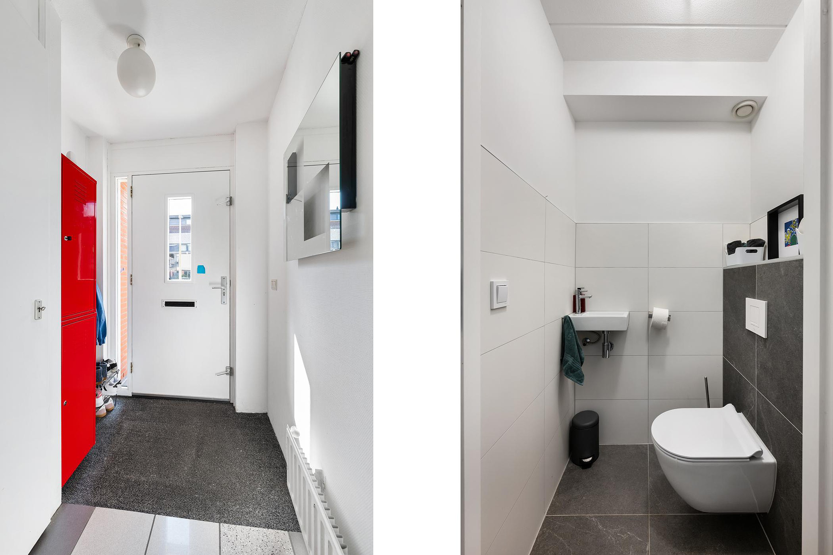 Tussenhal met modern toilet en trap naar de verdieping.
