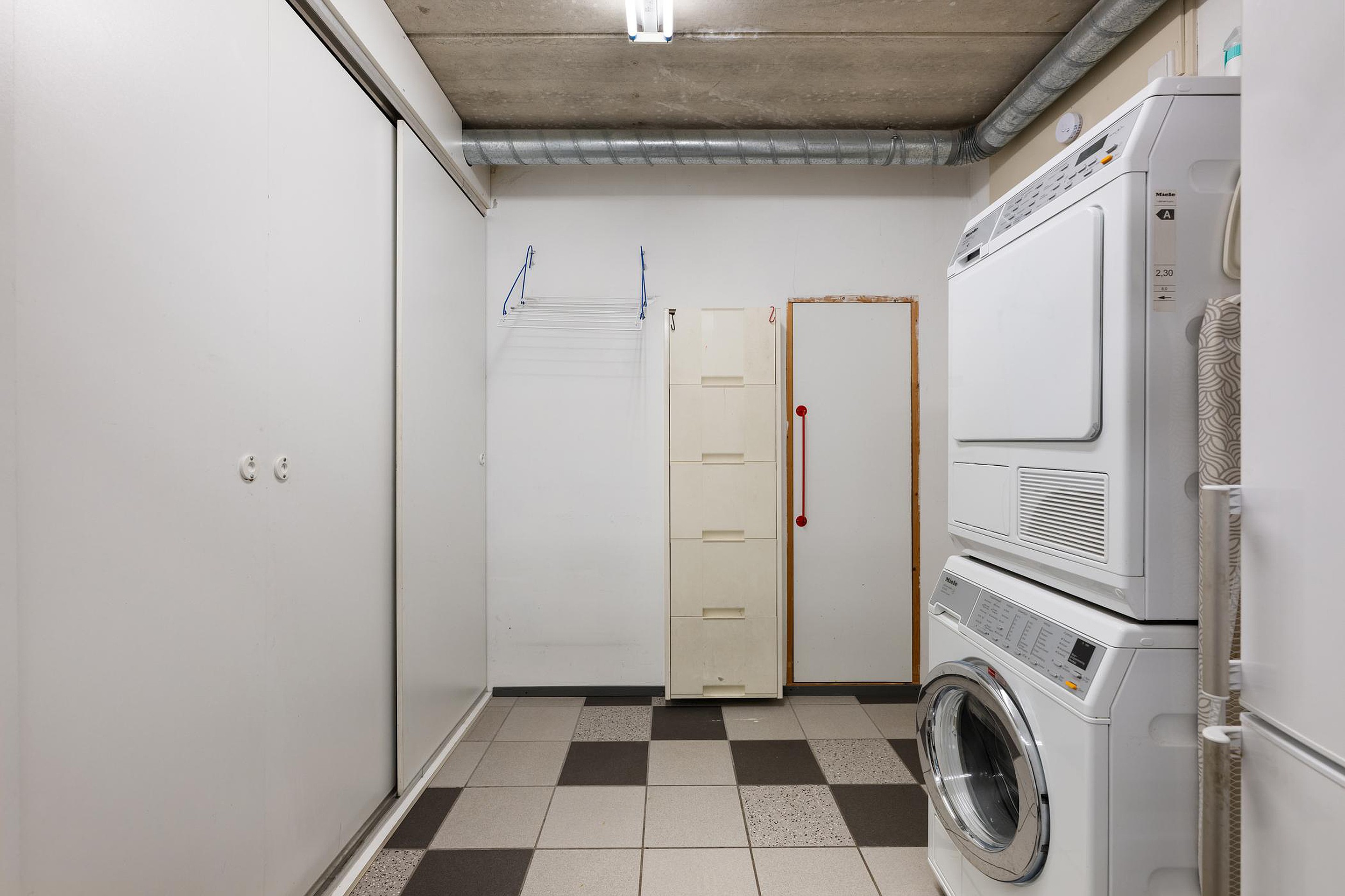 Deur naar de garage. De garage is verdeeld in een handige afgescheiden wasruimte met aansluitingen voor de wasmachine en wasdroger en in een gedeelte dat in gebruik is als bergruimte. Vanuit deze bergruimte een overheaddeur naar de oprit en voortuin.