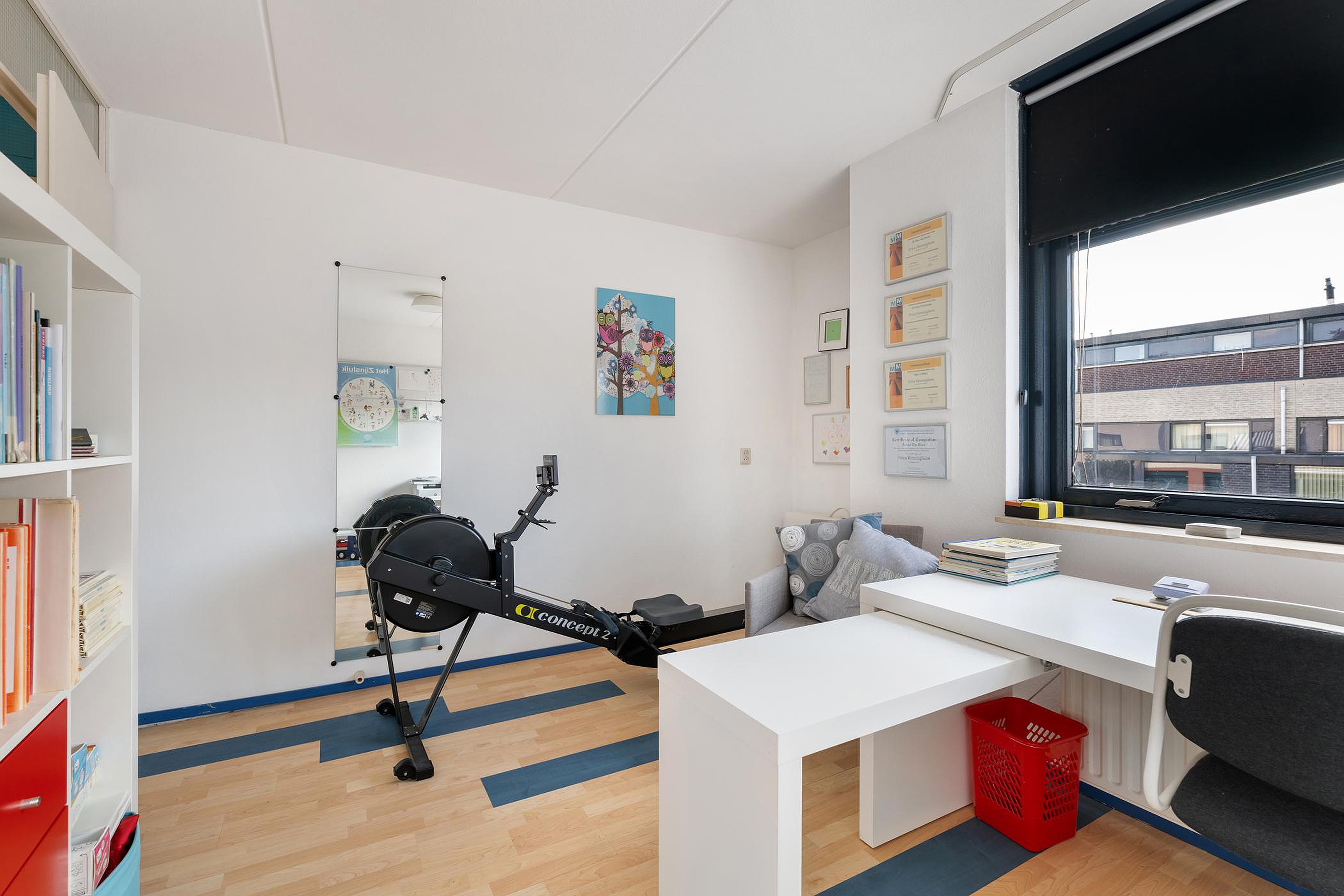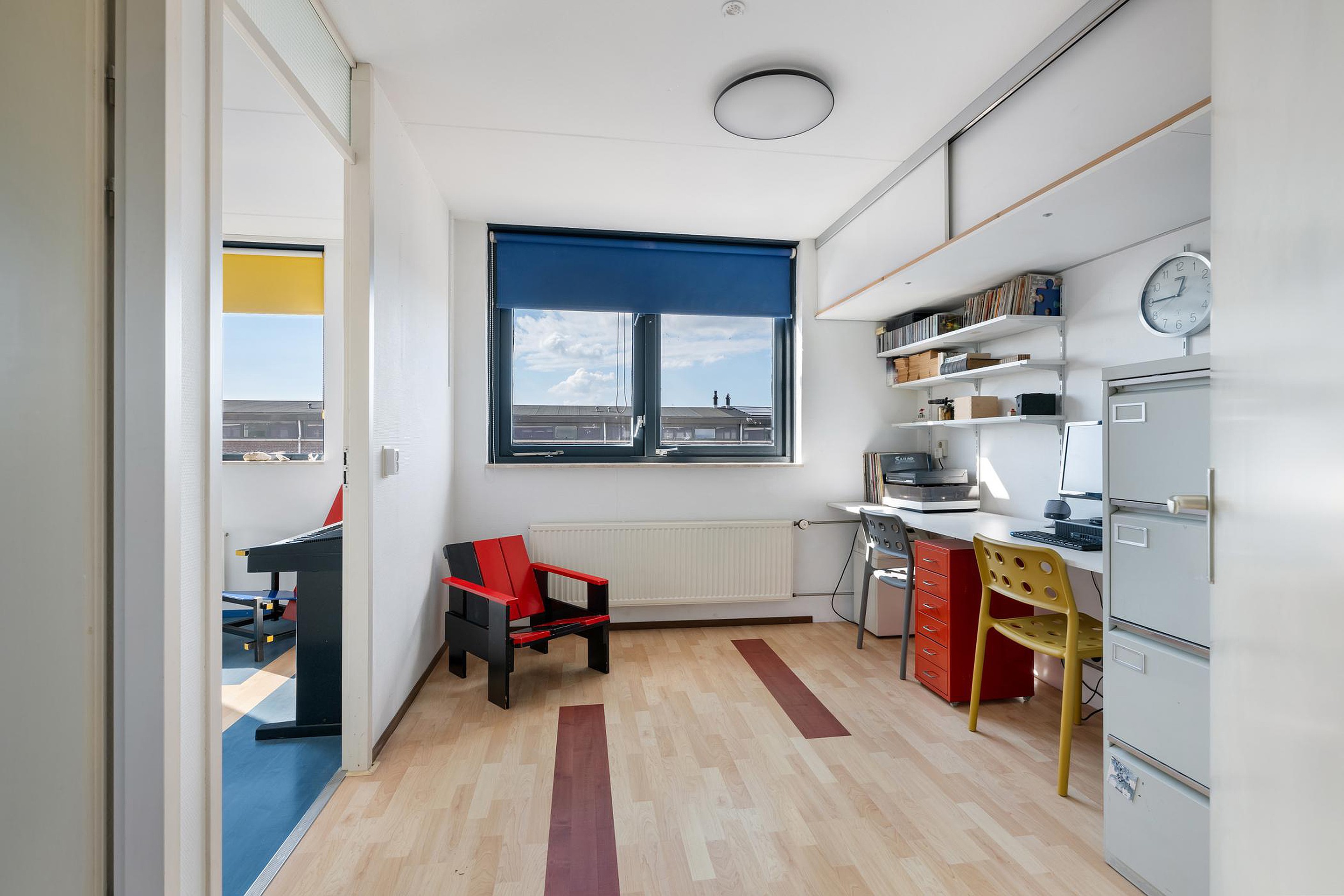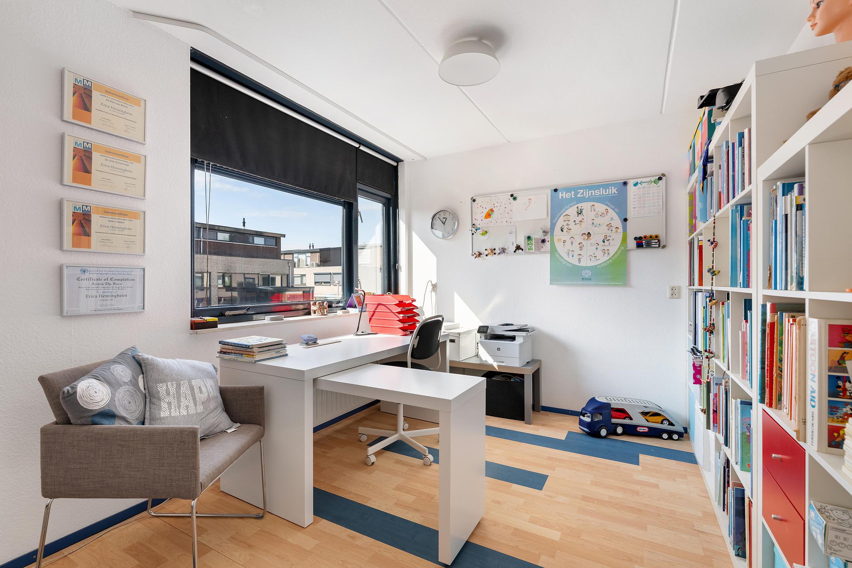 Tweede verdieping Aangenaam ruime en multifunctionele overloop die op dit moment als werkruimte in gebruik is.