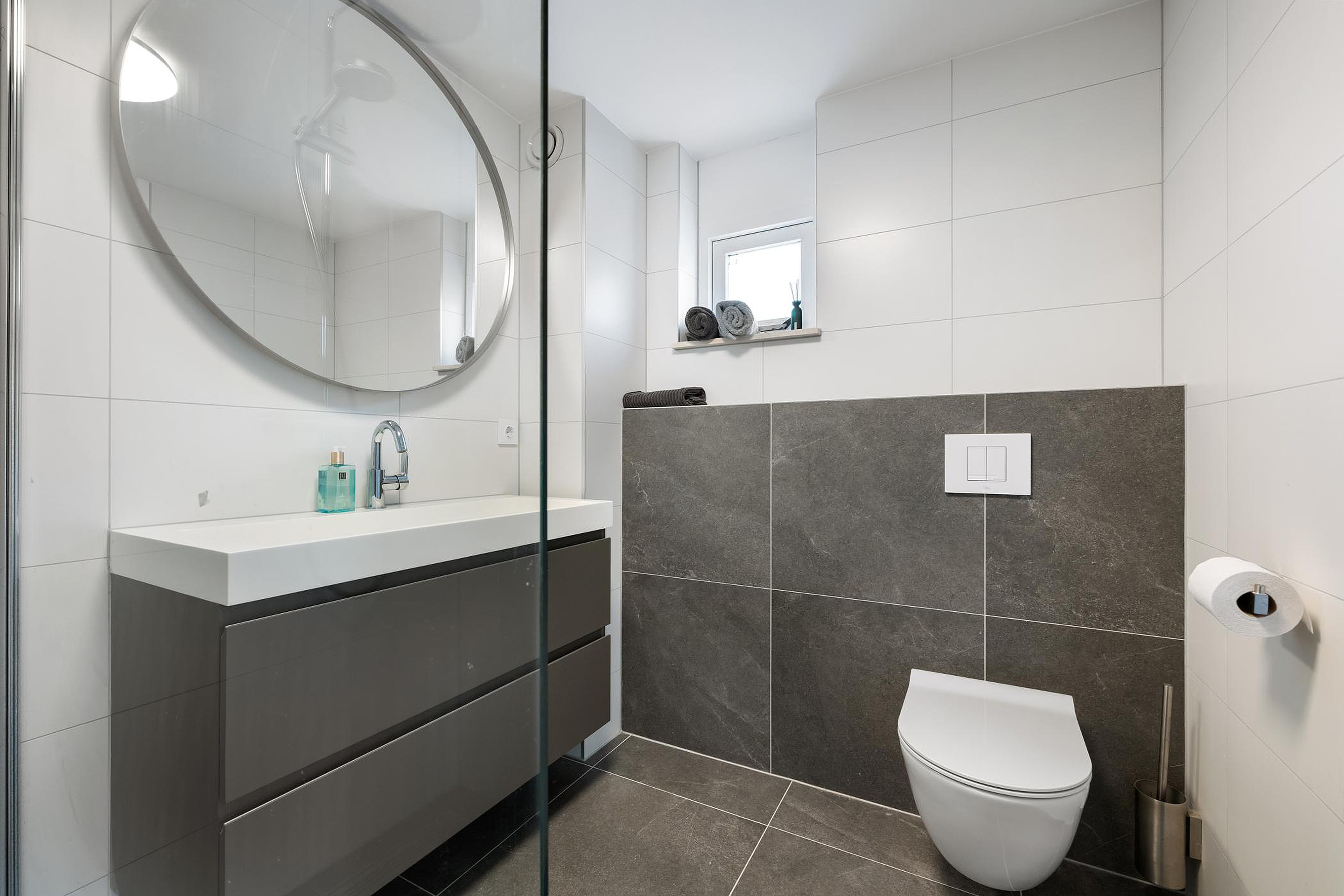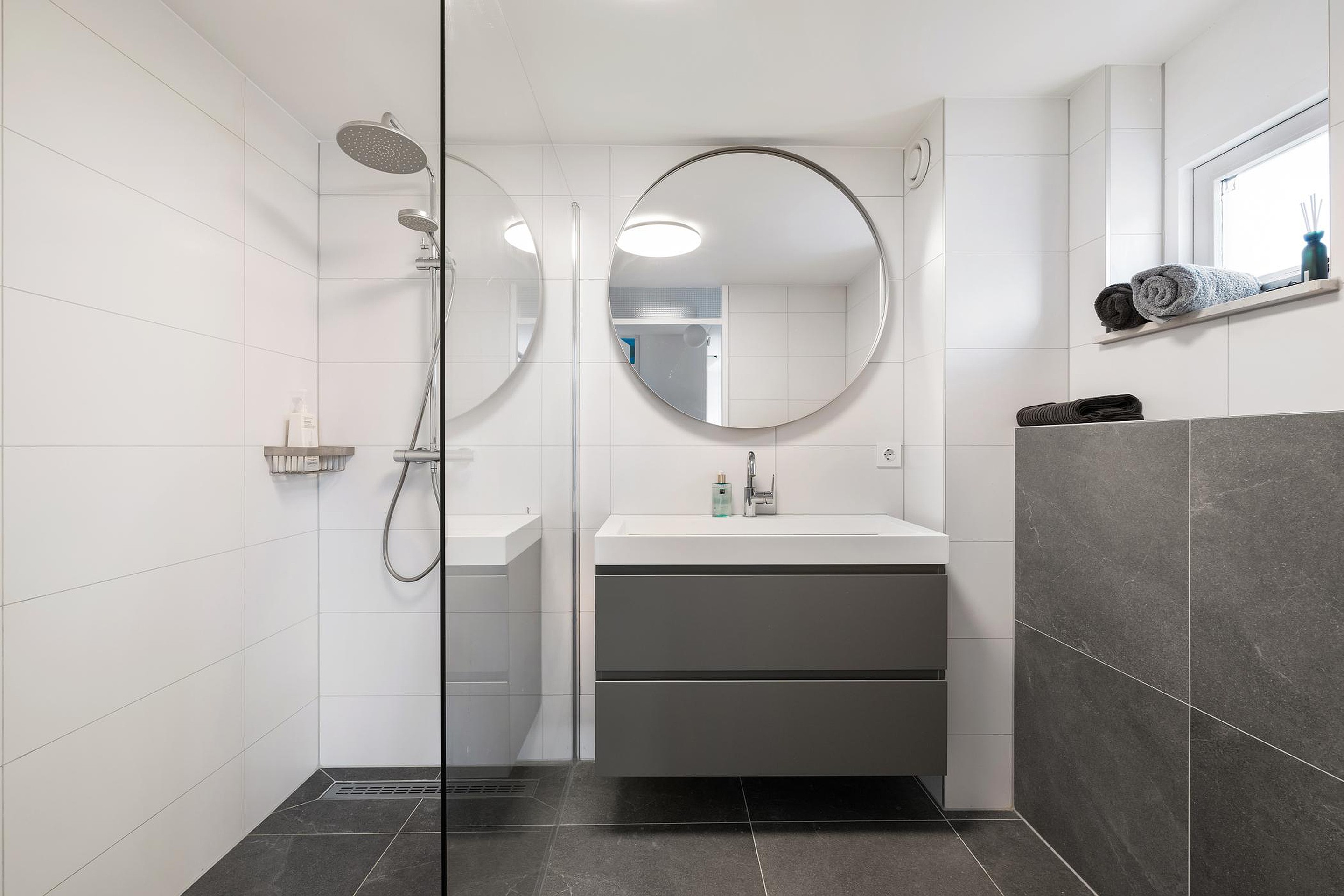 Grijze vloertegels en witte wandtegels.