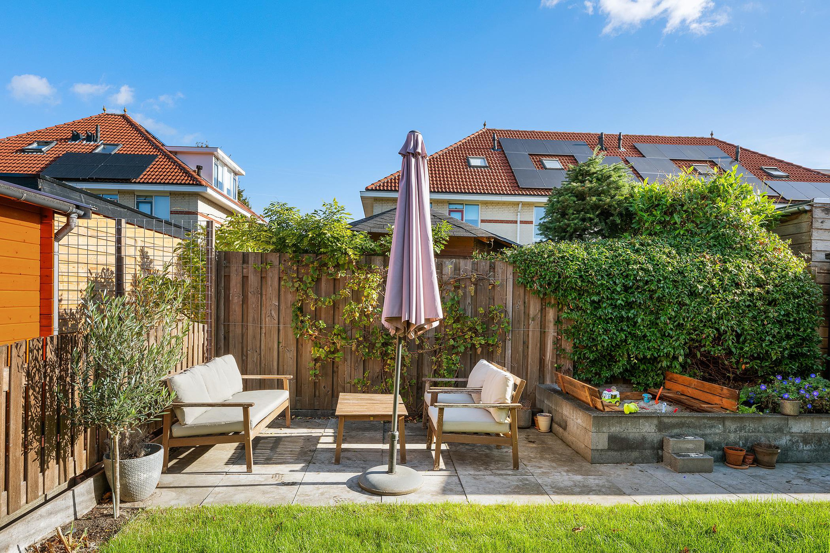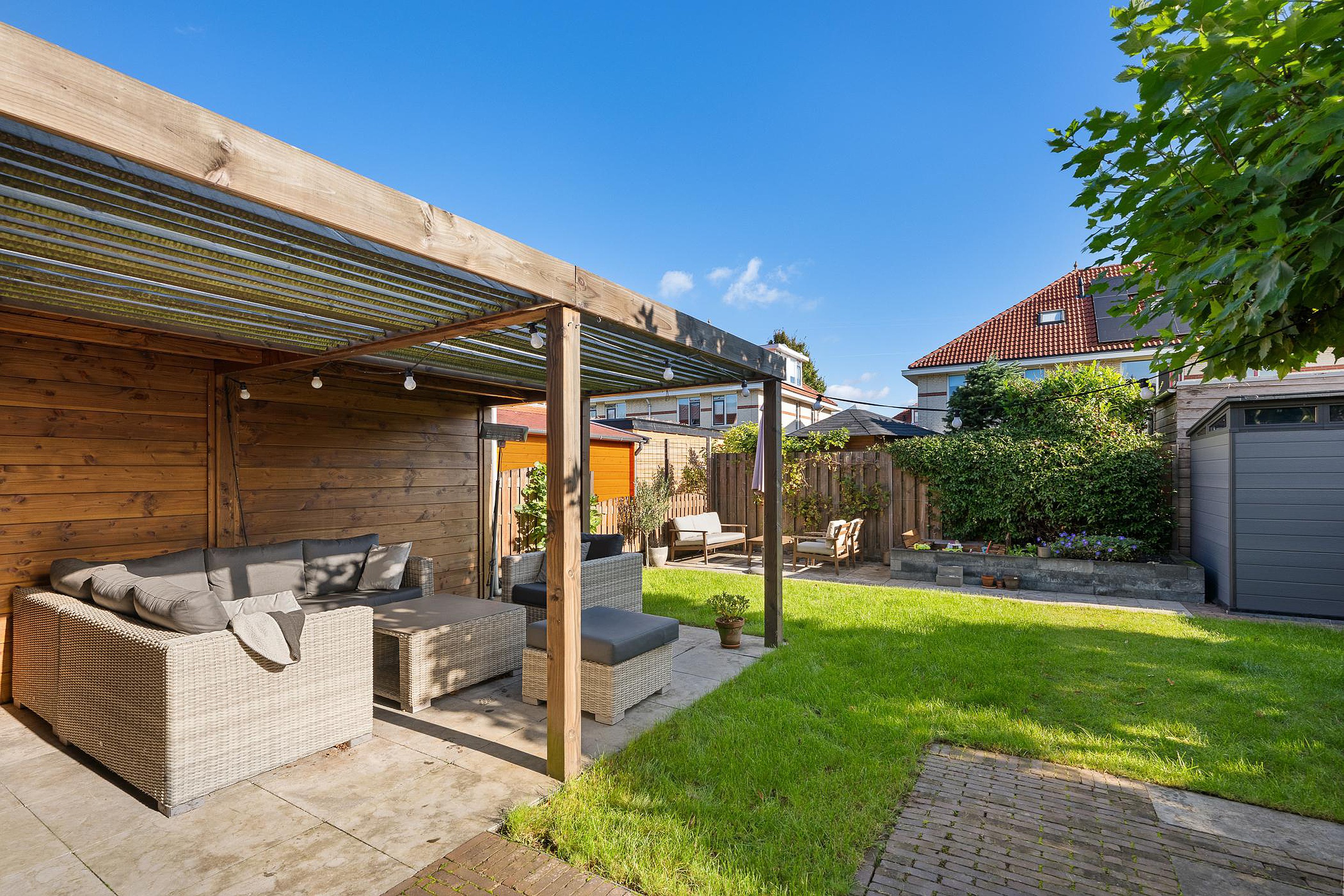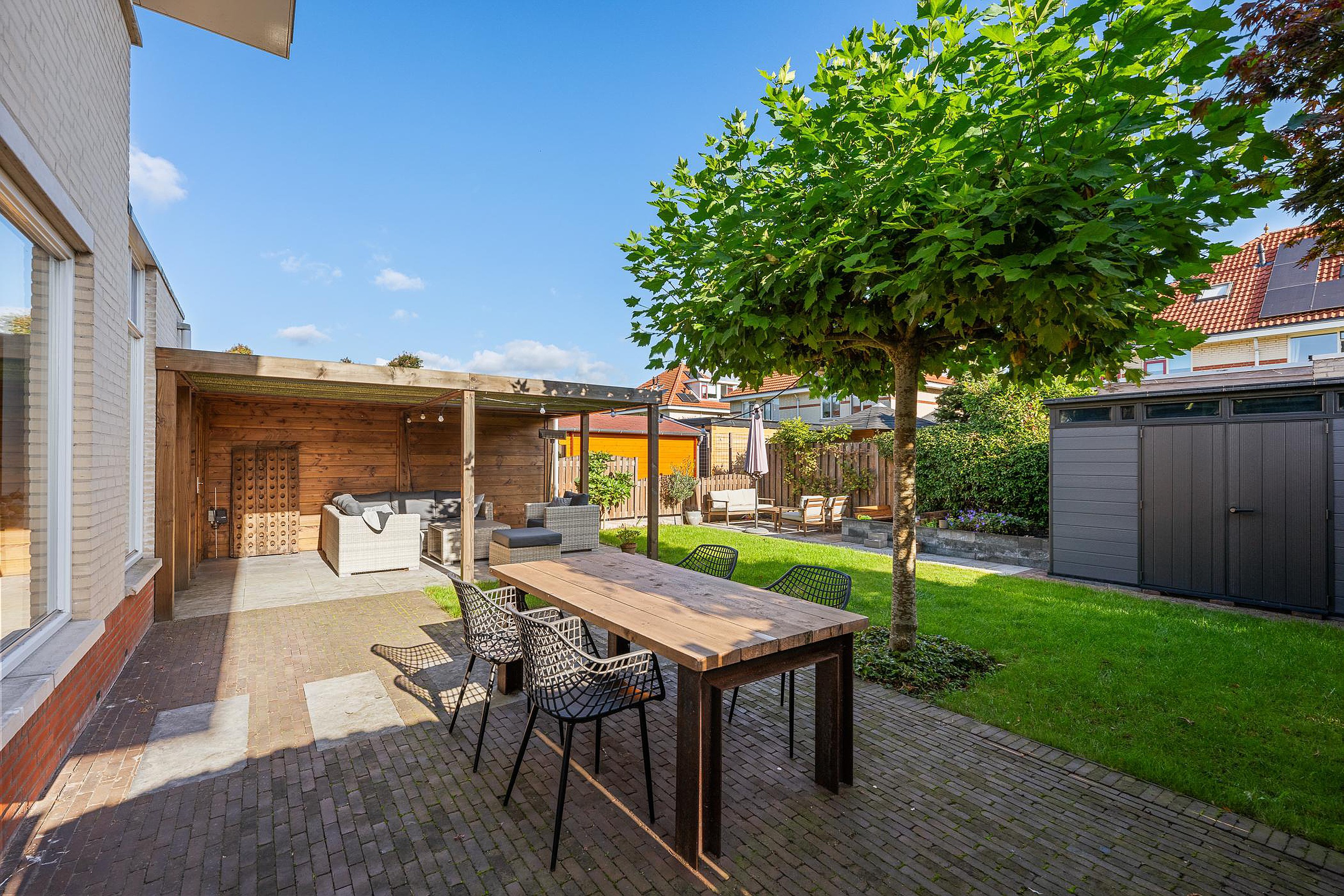 Tuin In de leuk aangelegde, riante achtertuin kun je op verschillende terrassen heerlijk van de zon genieten. Het terras onder de houten overkapping is een geliefd plekje... De tuin is ingericht met een gazon, platanen, klinker bestrating en grijze tegels. Een groot pluspunt van dit huis is, dat je ook aan de zijkant langs het huis kunt lopen. Handig voor de fietsen en voor werkzaamheden aan de tuin. Naast de prachtige achtertuin, heeft dit huis ook royale voortuin met véél vrijheid. Op het terras direct direct onder het keukenraam kun je heerlijk in de avondzon zitten. Verder is er voldoende parkeerruimte op de brede oprit.