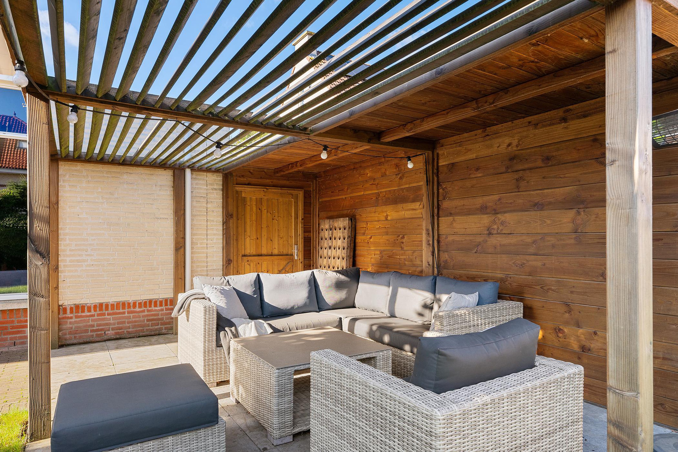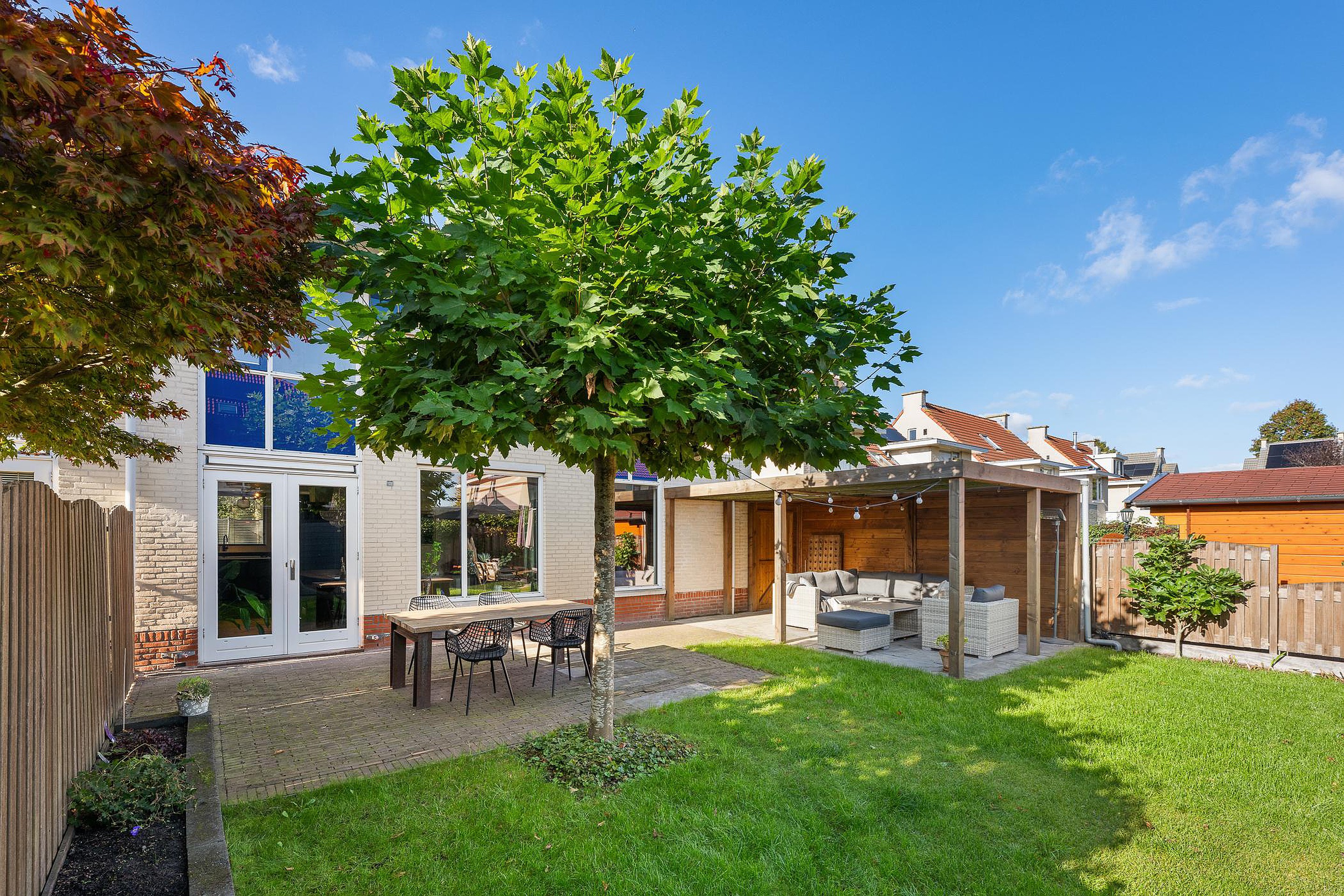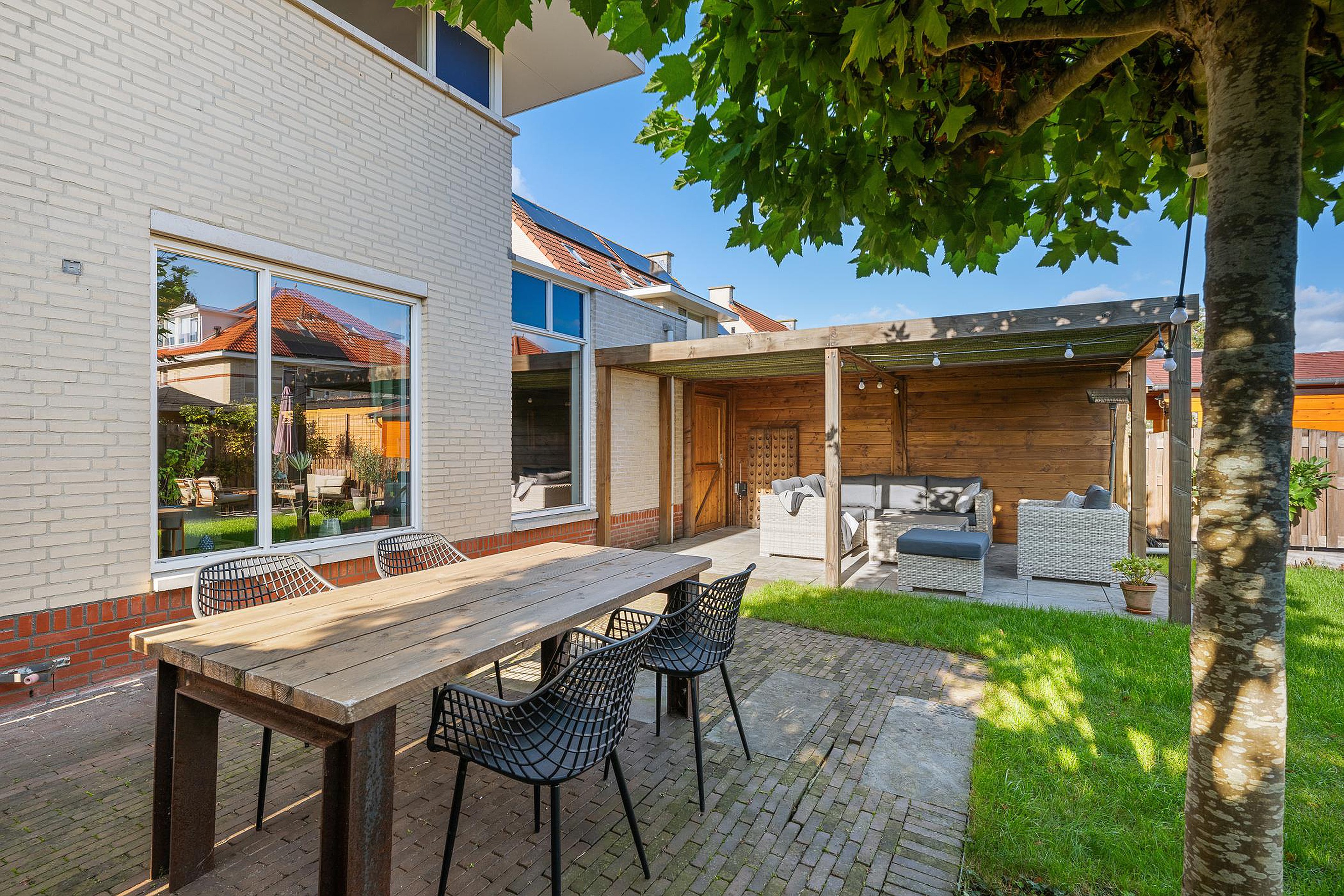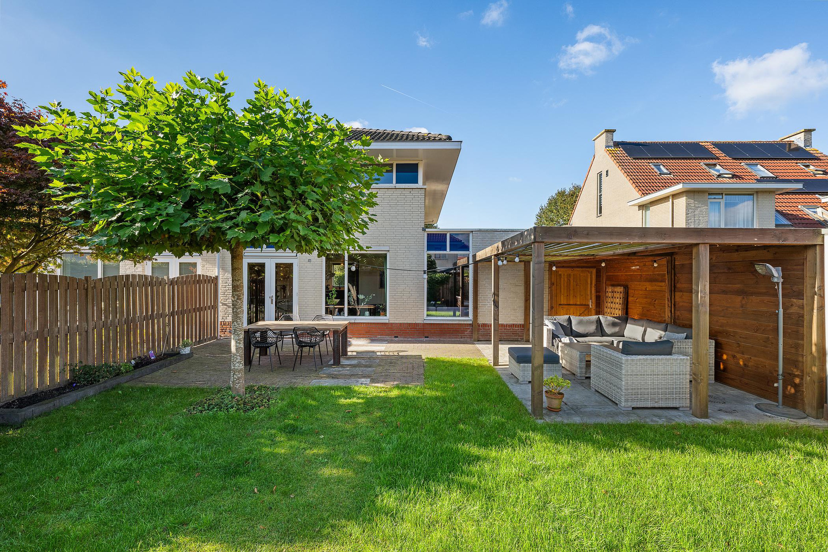 Tuin In de leuk aangelegde, riante achtertuin kun je op verschillende terrassen heerlijk van de zon genieten. Het terras onder de houten overkapping is een geliefd plekje... De tuin is ingericht met een gazon, platanen, klinker bestrating en grijze tegels. Een groot pluspunt van dit huis is, dat je ook aan de zijkant langs het huis kunt lopen. Handig voor de fietsen en voor werkzaamheden aan de tuin. Naast de prachtige achtertuin, heeft dit huis ook royale voortuin met véél vrijheid. Op het terras direct direct onder het keukenraam kun je heerlijk in de avondzon zitten. Verder is er voldoende parkeerruimte op de brede oprit.