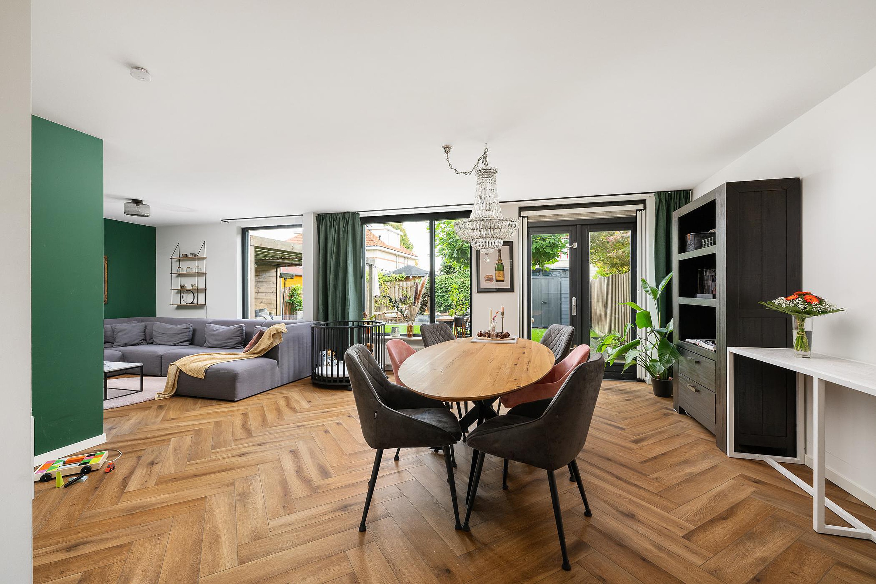 De brede, tuingerichte woonkamer is ingedeeld met een sfeervol zitgedeelte en een eetgedeelte in het verlengde van de keuken. In het eetgedeelte is voldoende plaats voor een grote tafel.