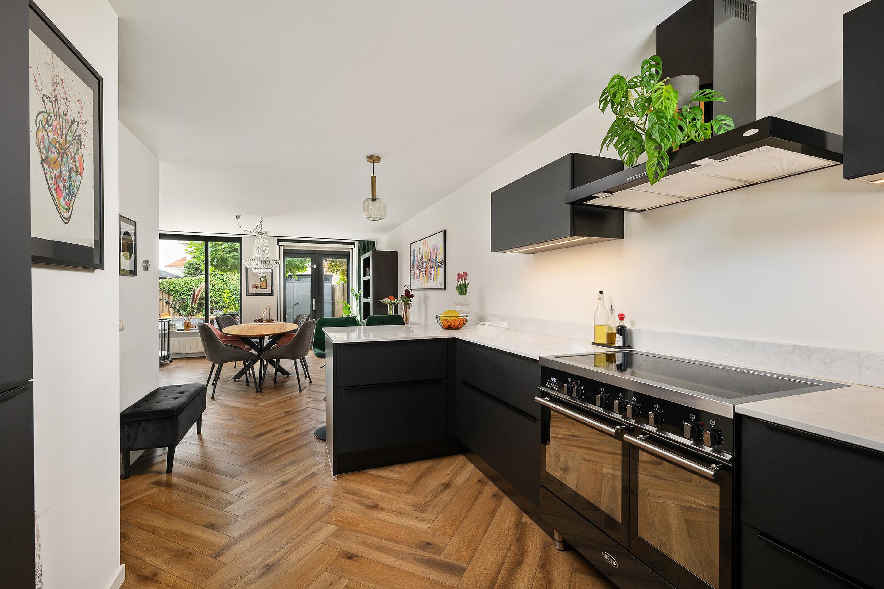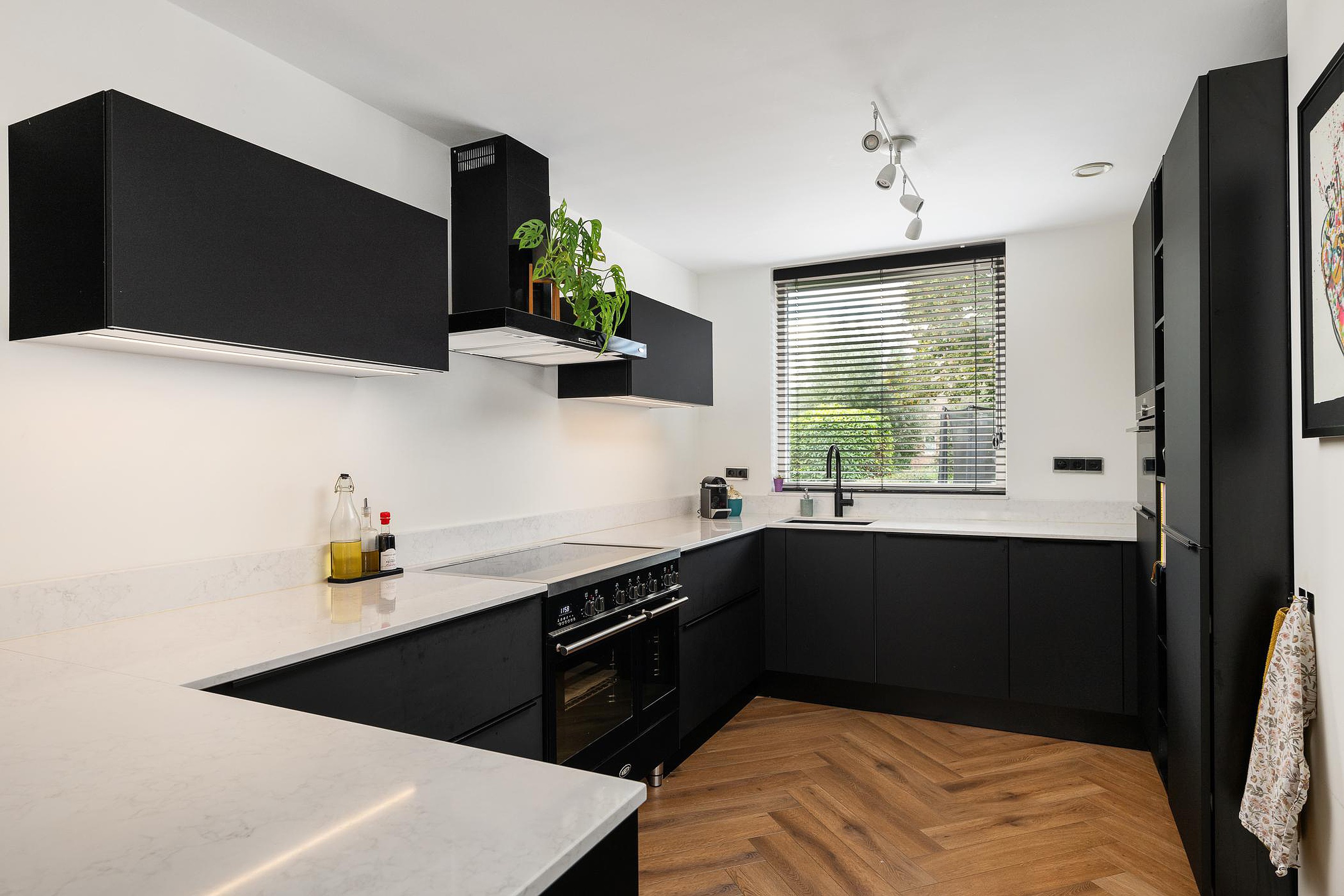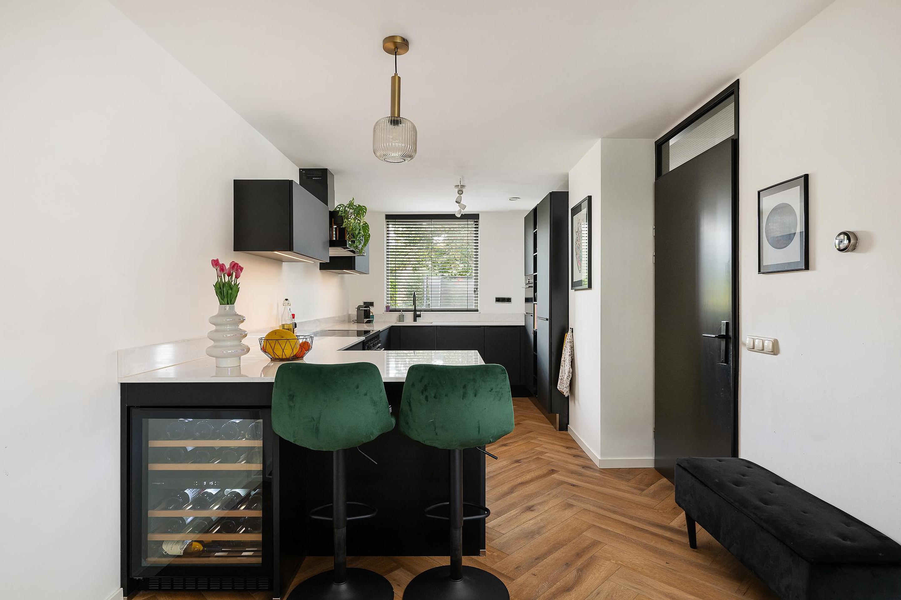 Als je vanuit de hal de kamer binnenloopt, valt direct de trendy keuken op! Deze luxe en compleet uitgevoerde keuken (2020) nodigt je uit om lekker te kokkerellen of om plaats te nemen aan de knusse bar die op een leuke manier met de kamer in verbinding staat. Vanuit keukenraam leuk uitzicht!