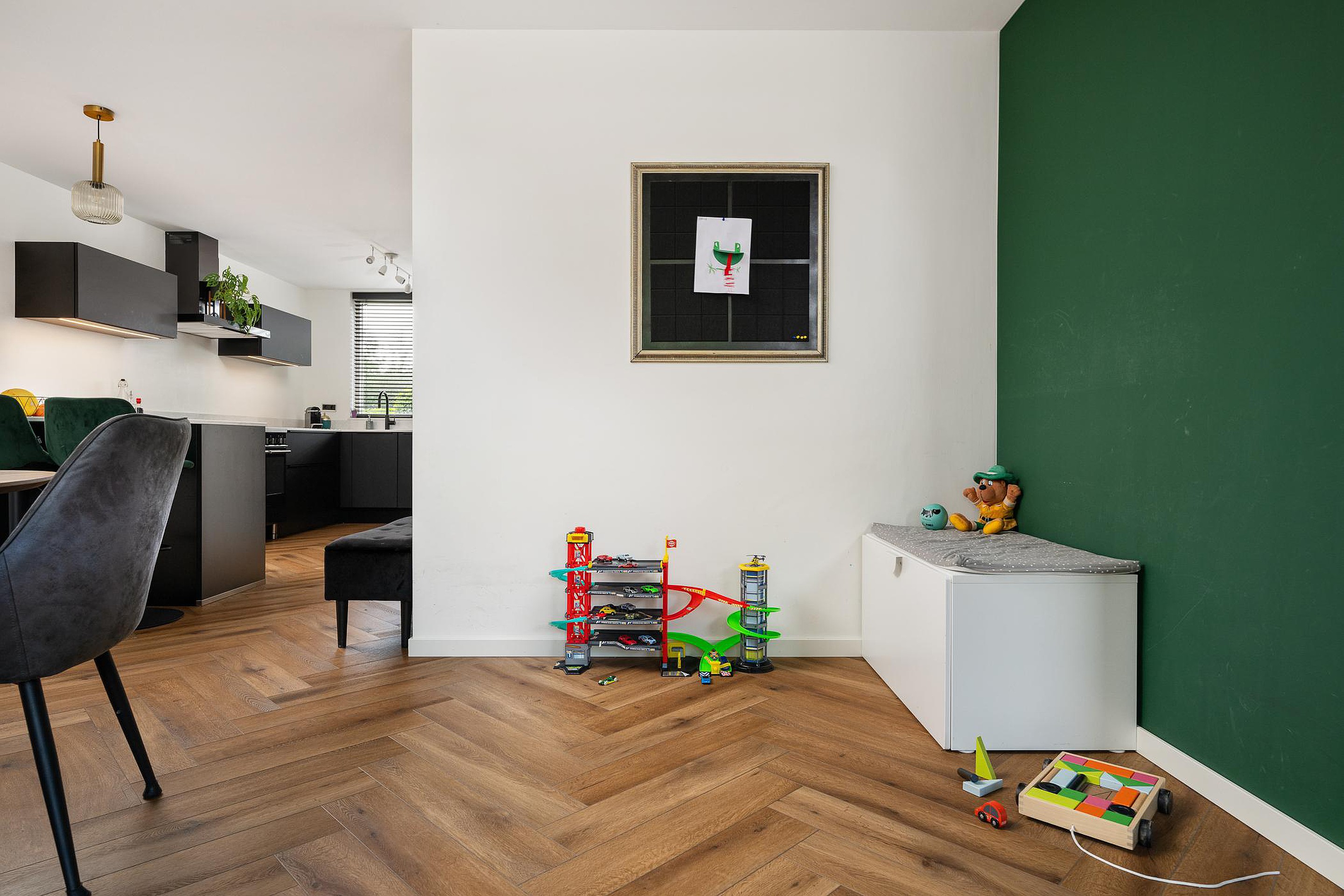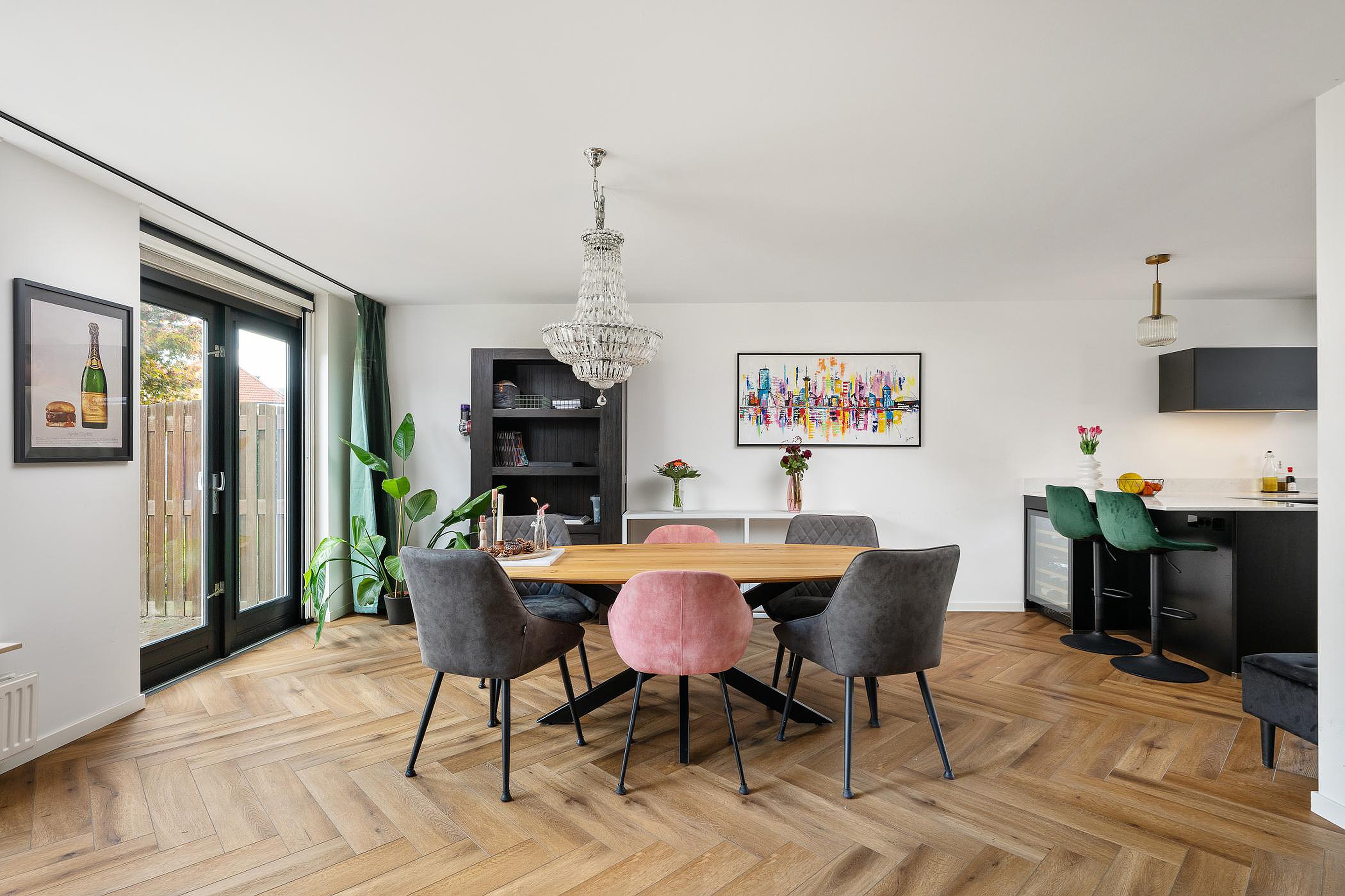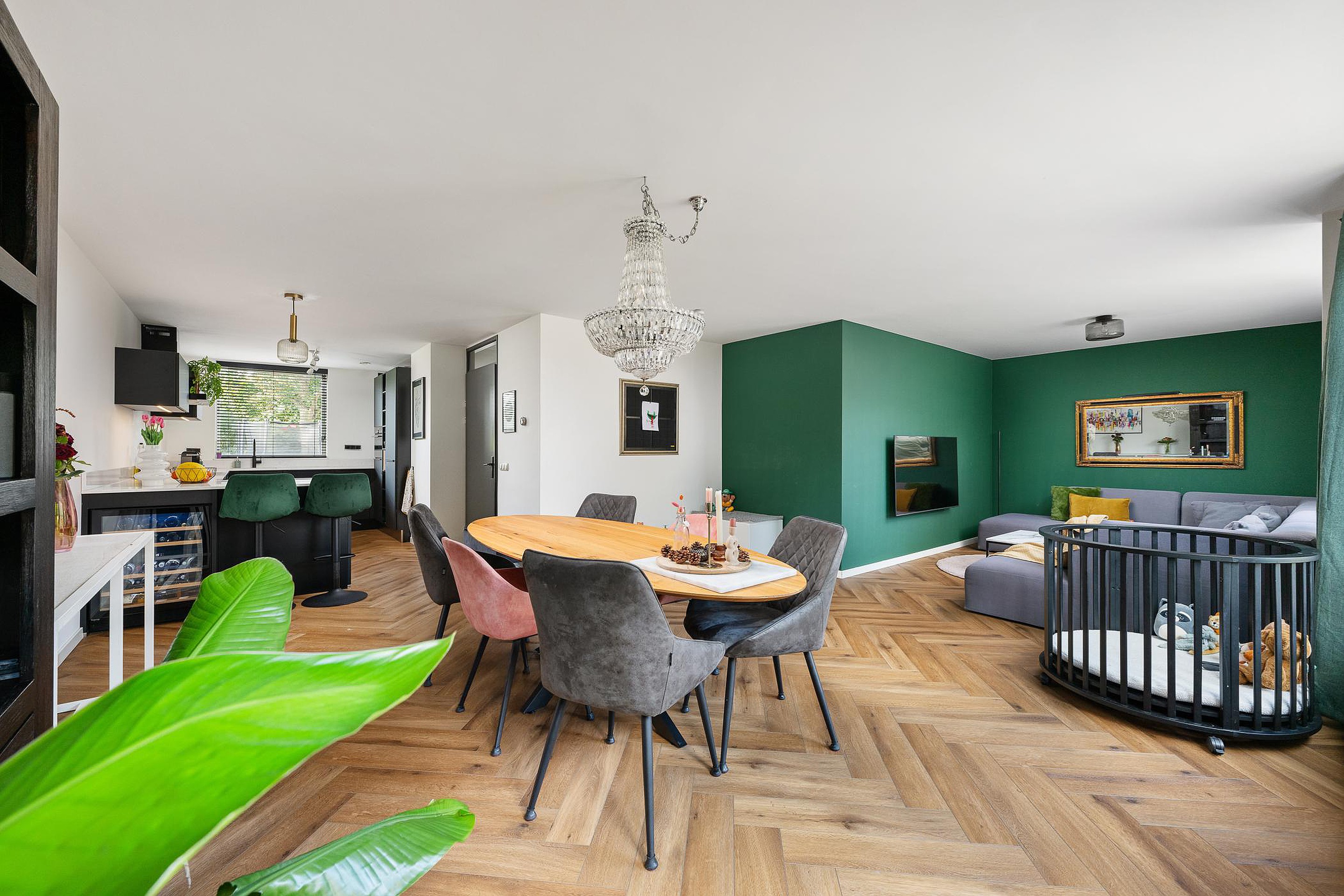 Als je vanuit de hal de kamer binnenloopt, valt direct de trendy keuken op! Deze luxe en compleet uitgevoerde keuken (2020) nodigt je uit om lekker te kokkerellen of om plaats te nemen aan de knusse bar die op een leuke manier met de kamer in verbinding staat. Vanuit keukenraam leuk uitzicht!