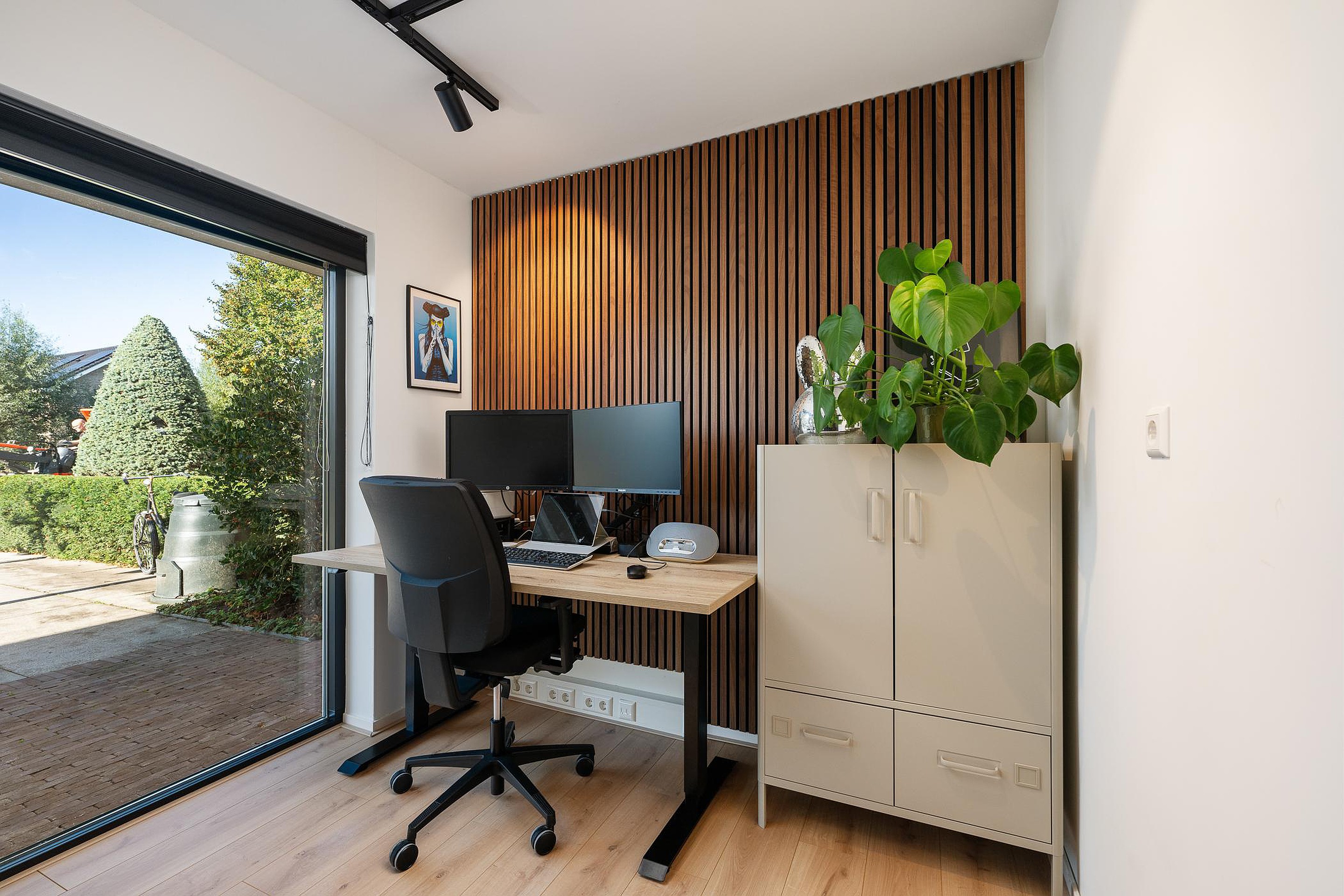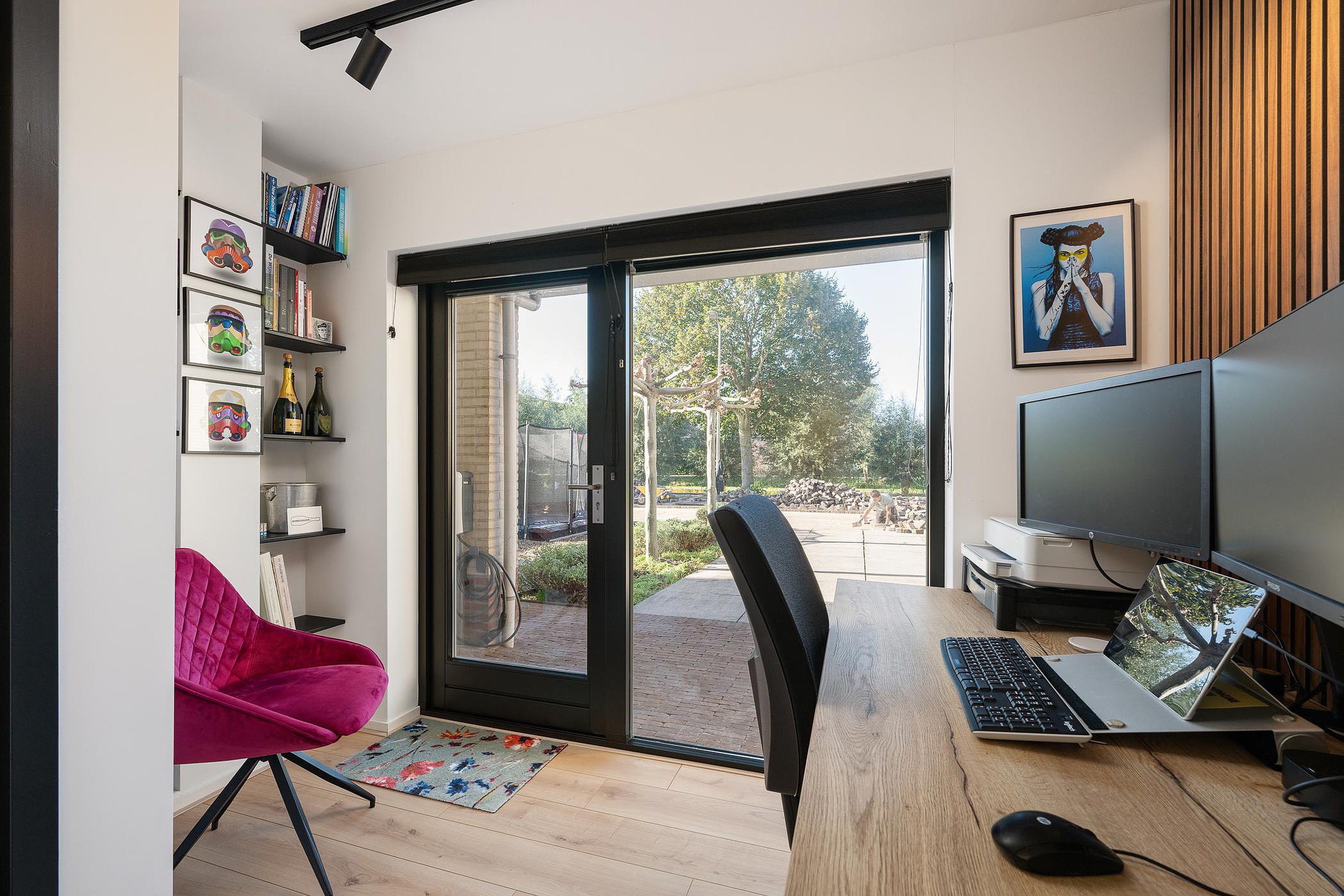 Wat een verrassing zeg! Als je vanuit de hal naar de berging / bijkeuken gaat, is er nóg een deur en die brengt je bij... een inspirerende werkplek! Een gedeelte van de oorspronkelijke garage is namelijk vakkundig verbouwd tot een werkplek / kantoorruimte. Door het grote raam kun je genieten van veel daglicht. Deur naar de voortuin.