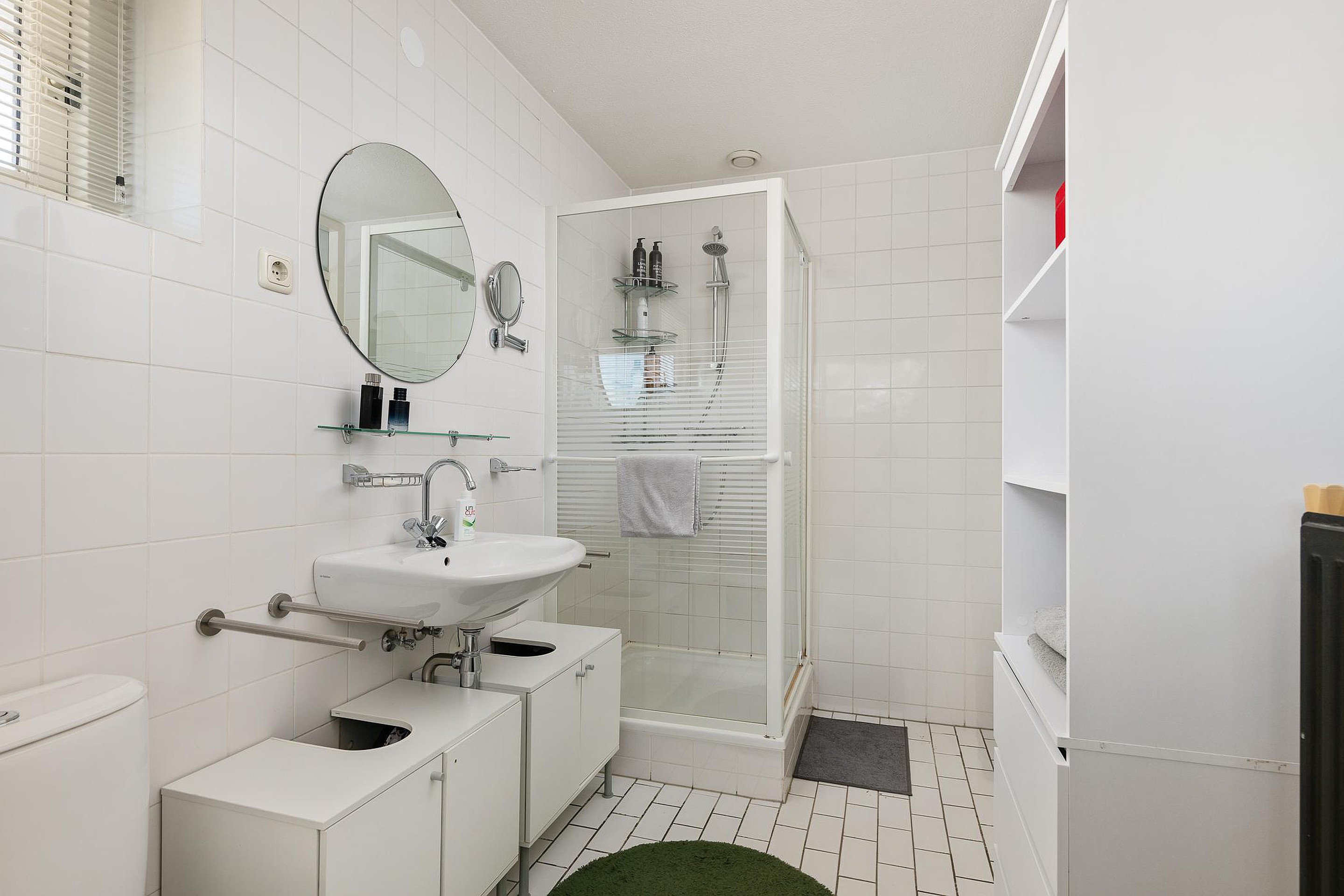 Ruime badkamer (1999) met ligbad, douchecabine, wastafel en toilet.