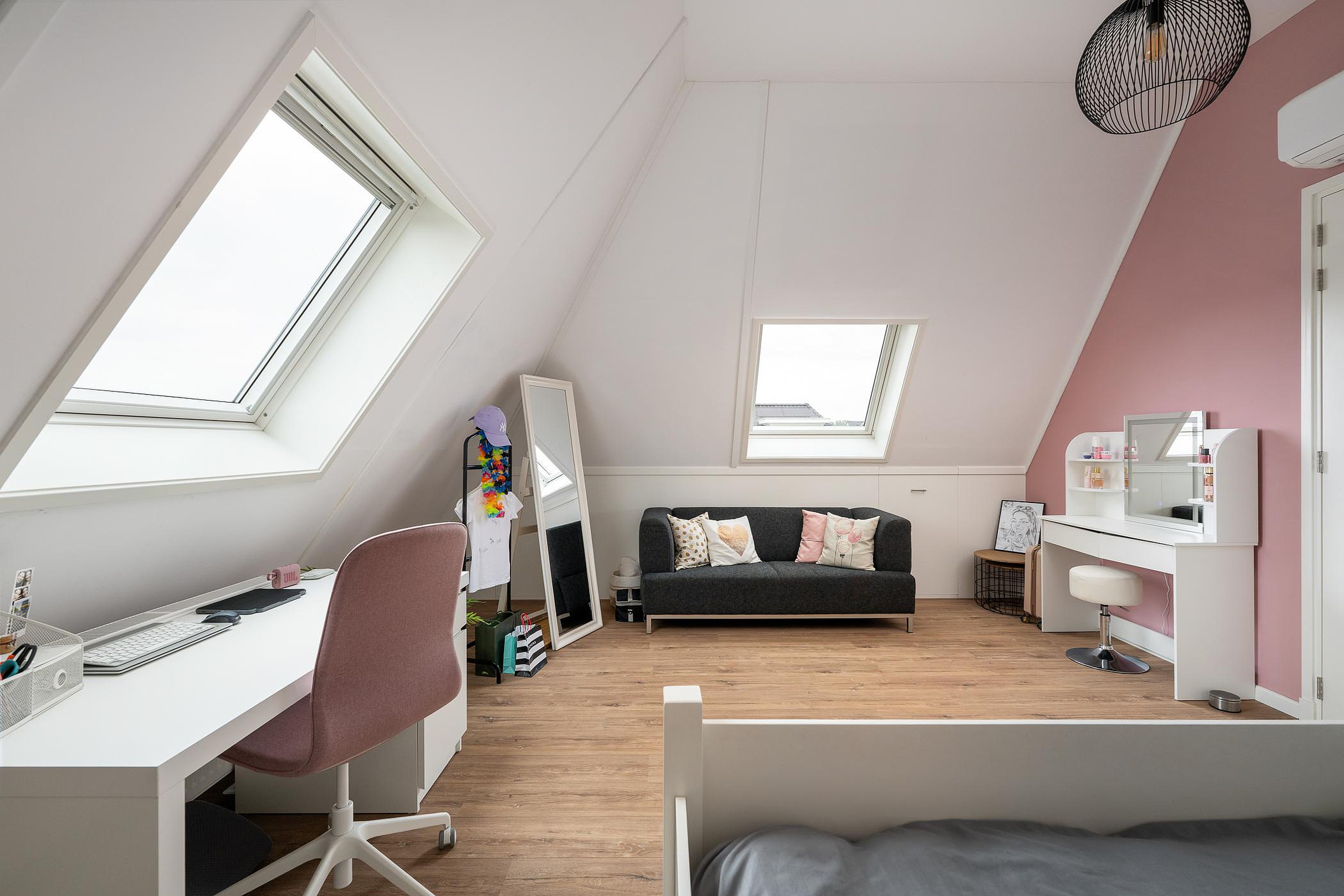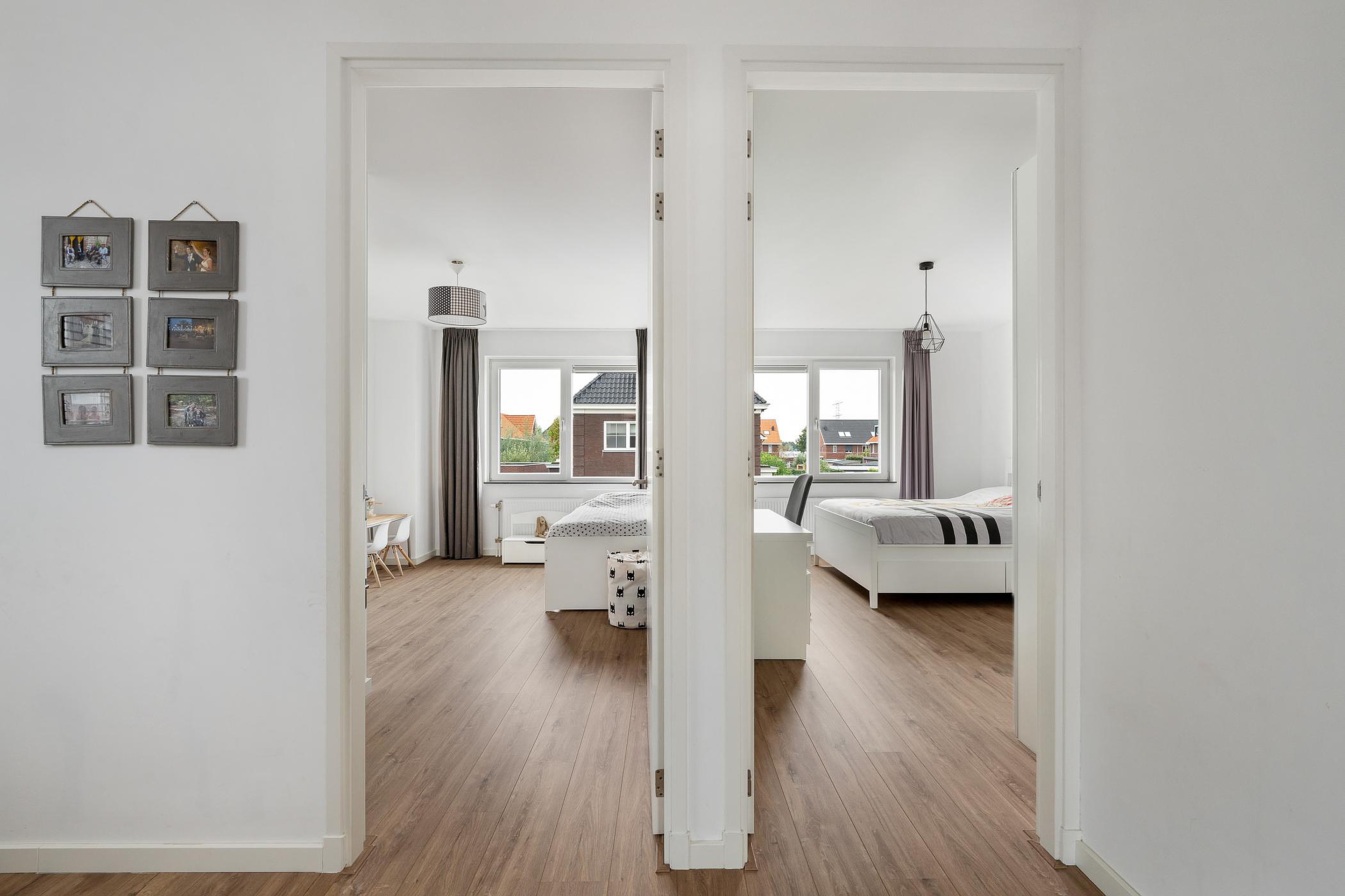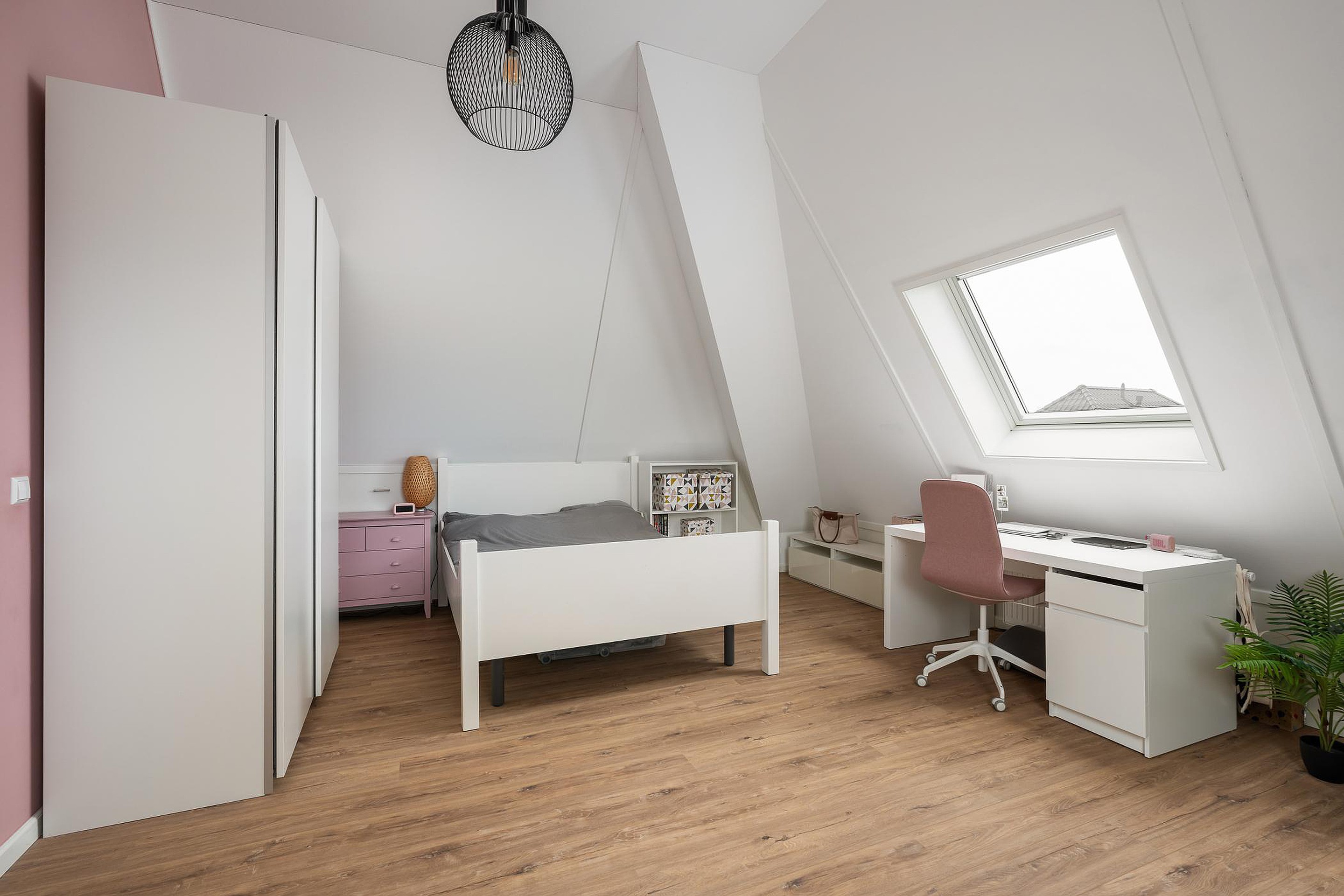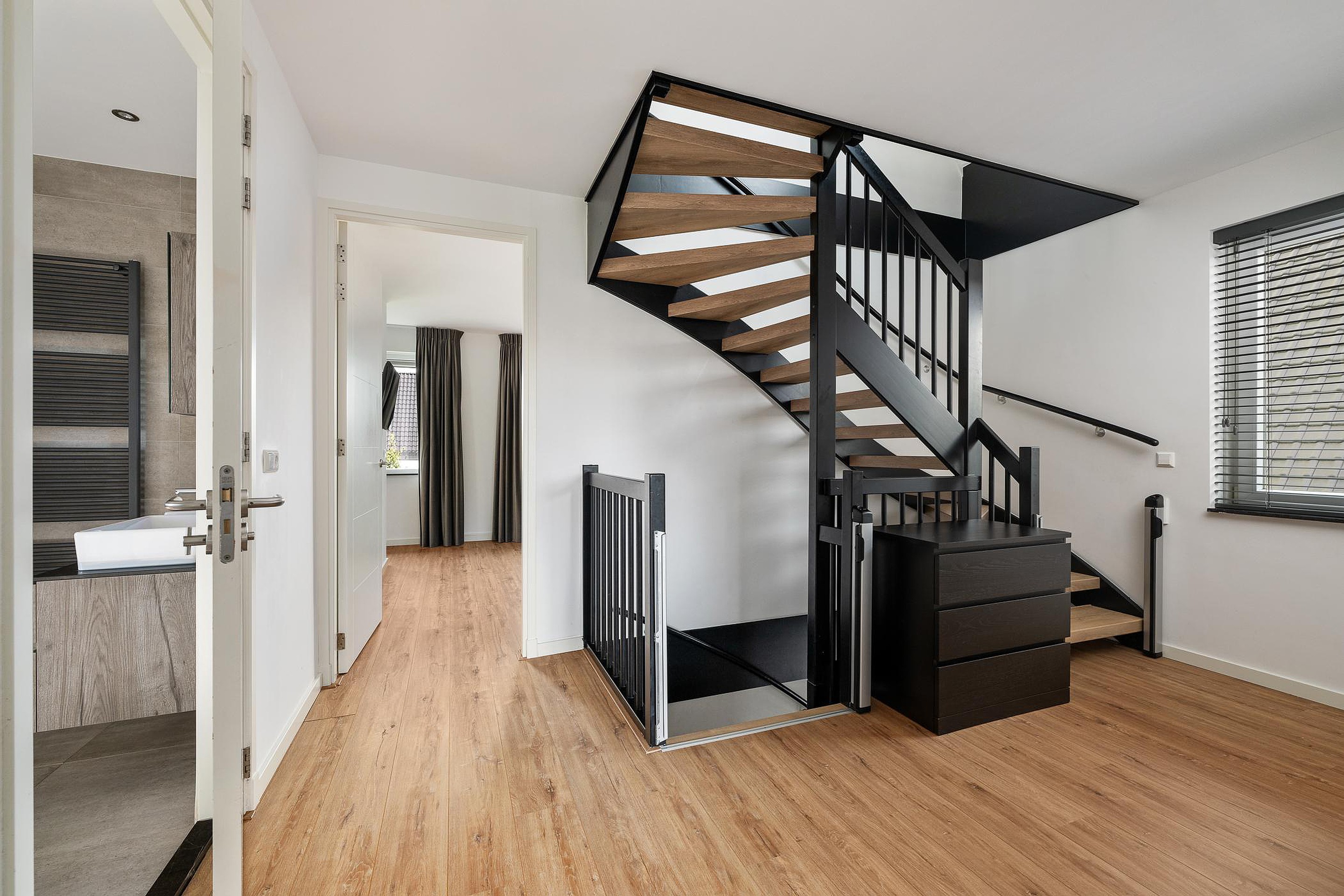 De verdieping is afgewerkt met een nette laminaatvloer en strak gestuukte wanden en plafonds.