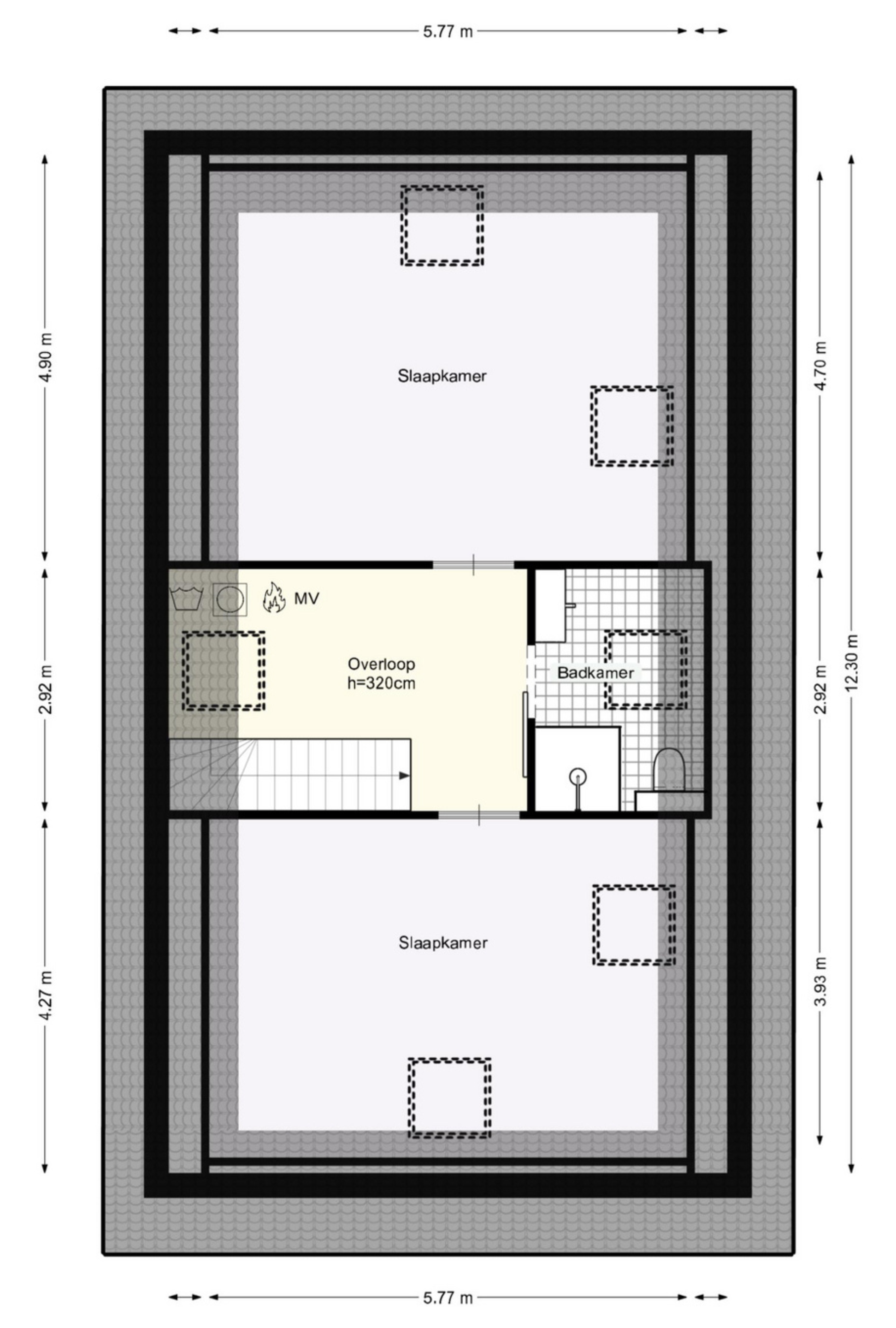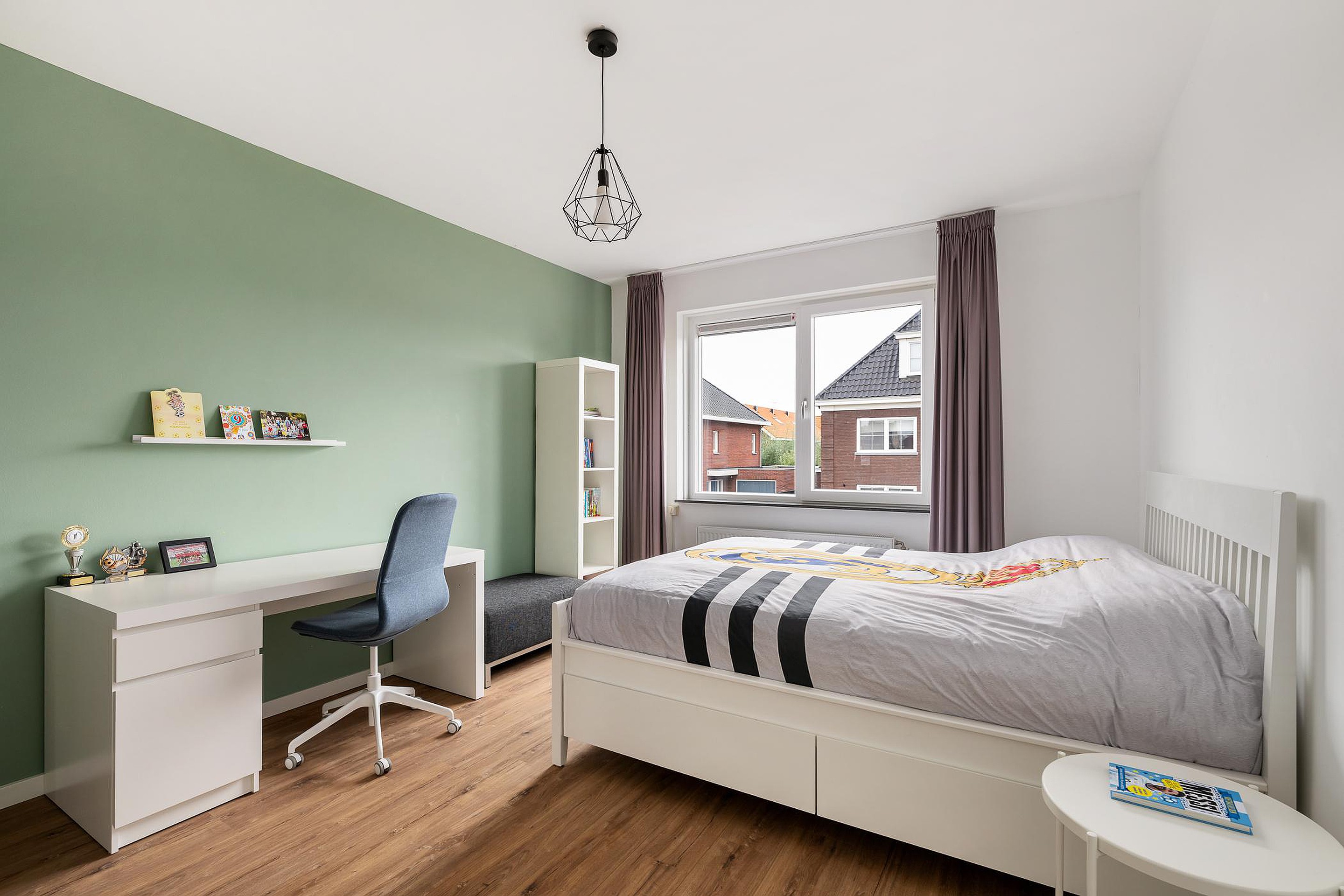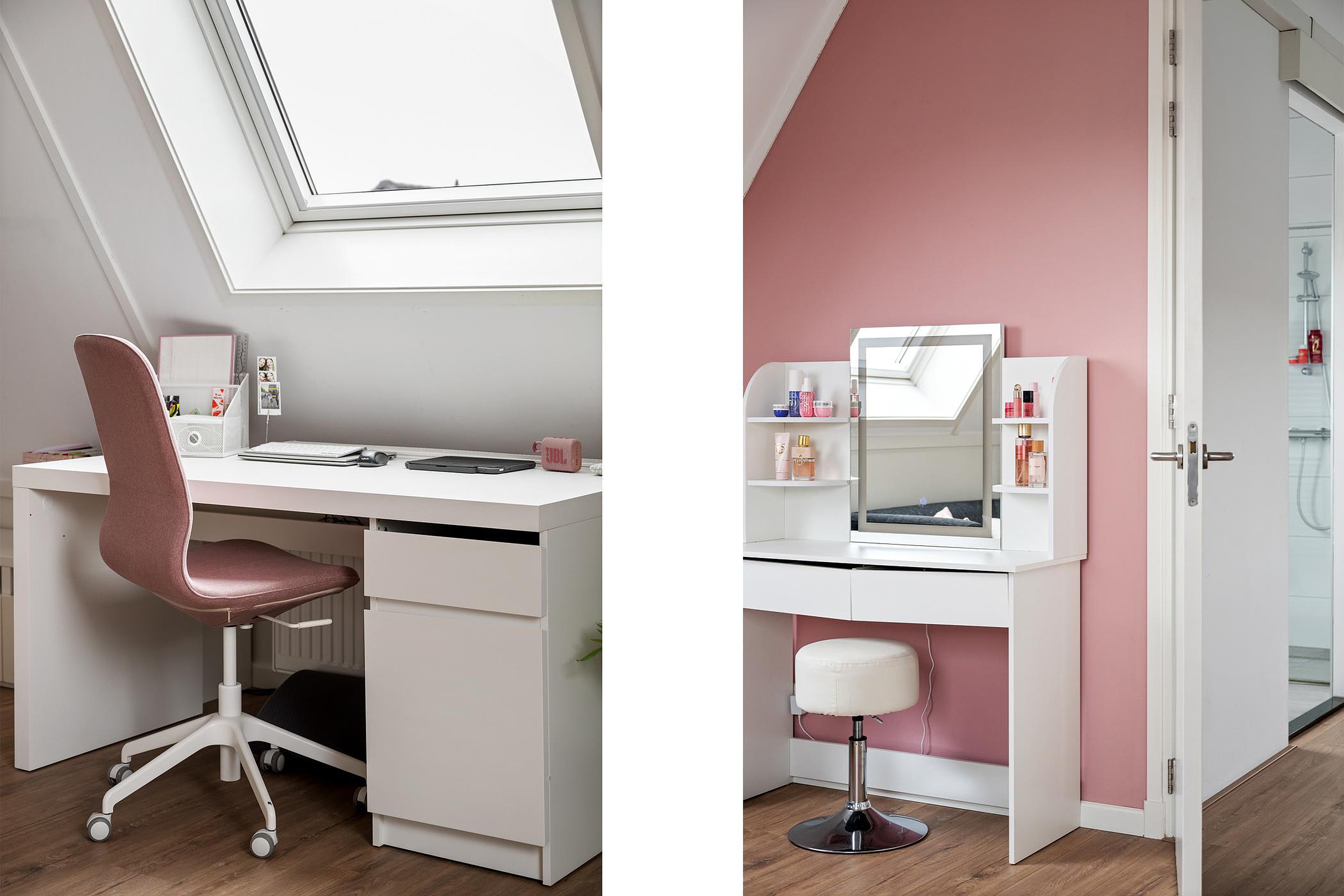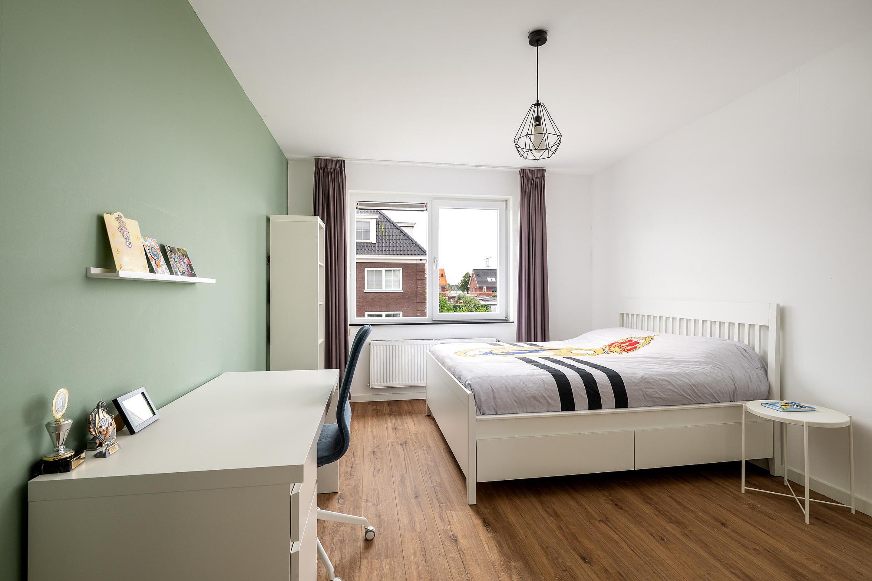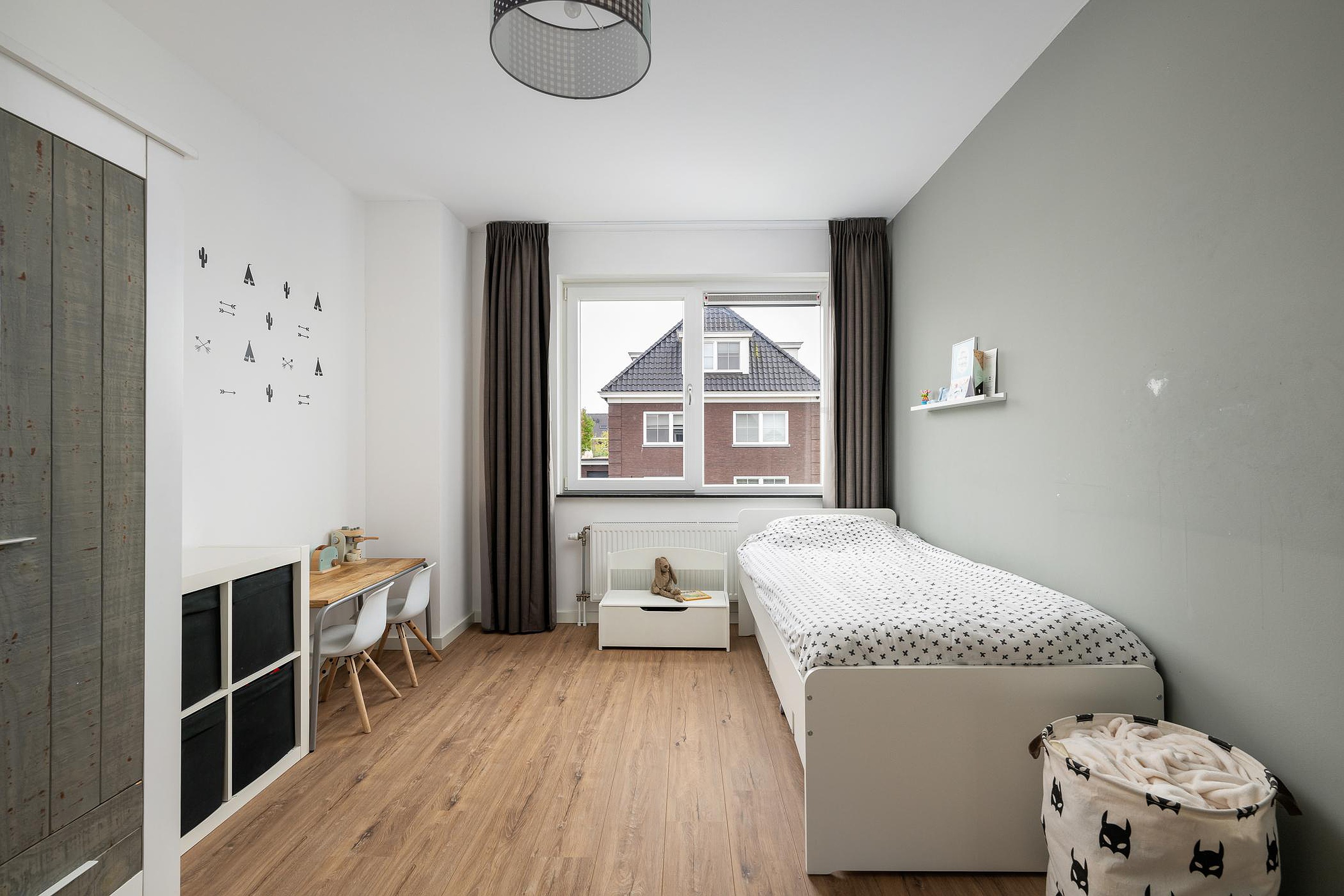 De verdieping is afgewerkt met een nette laminaatvloer en strak gestuukte wanden en plafonds.