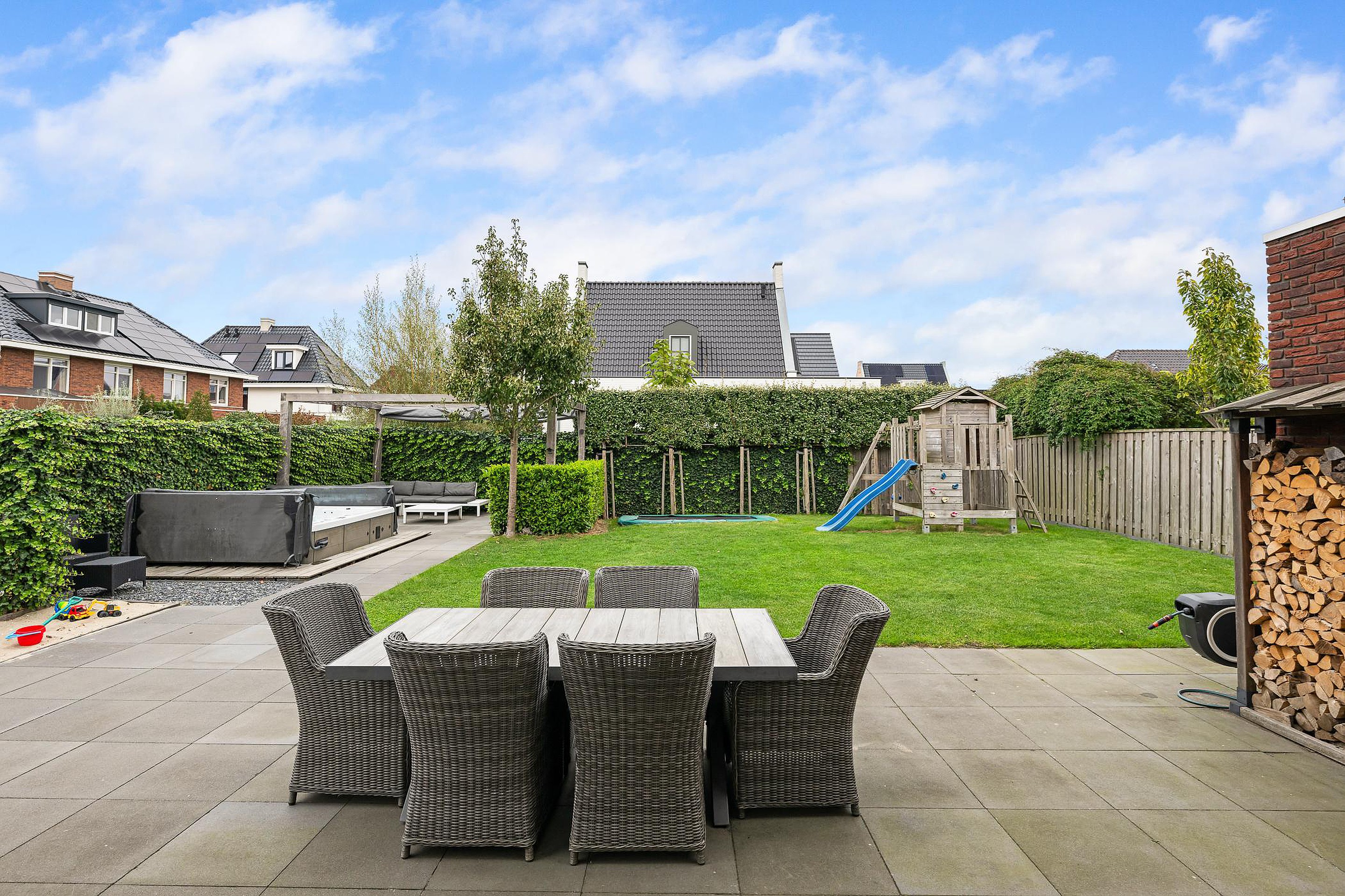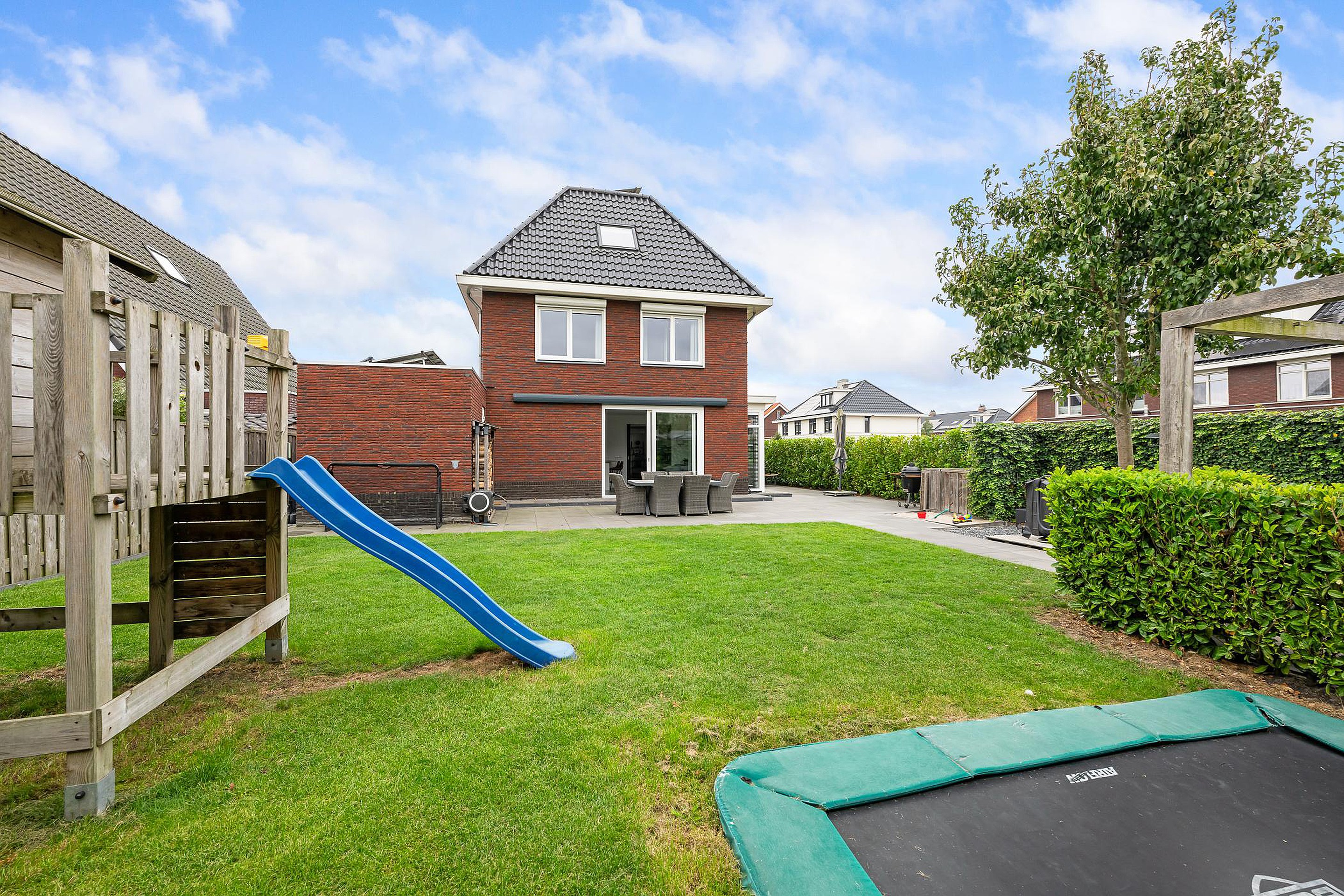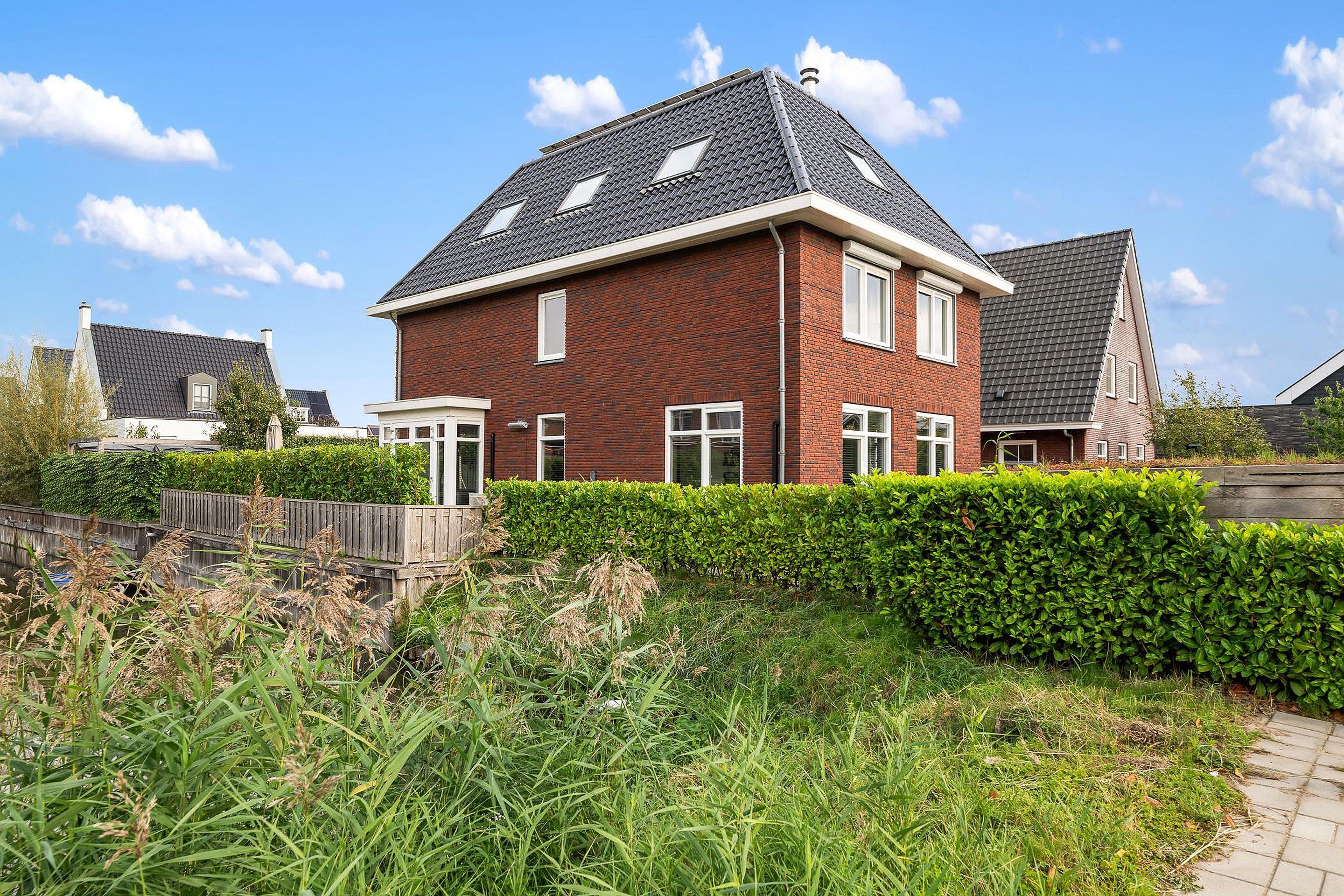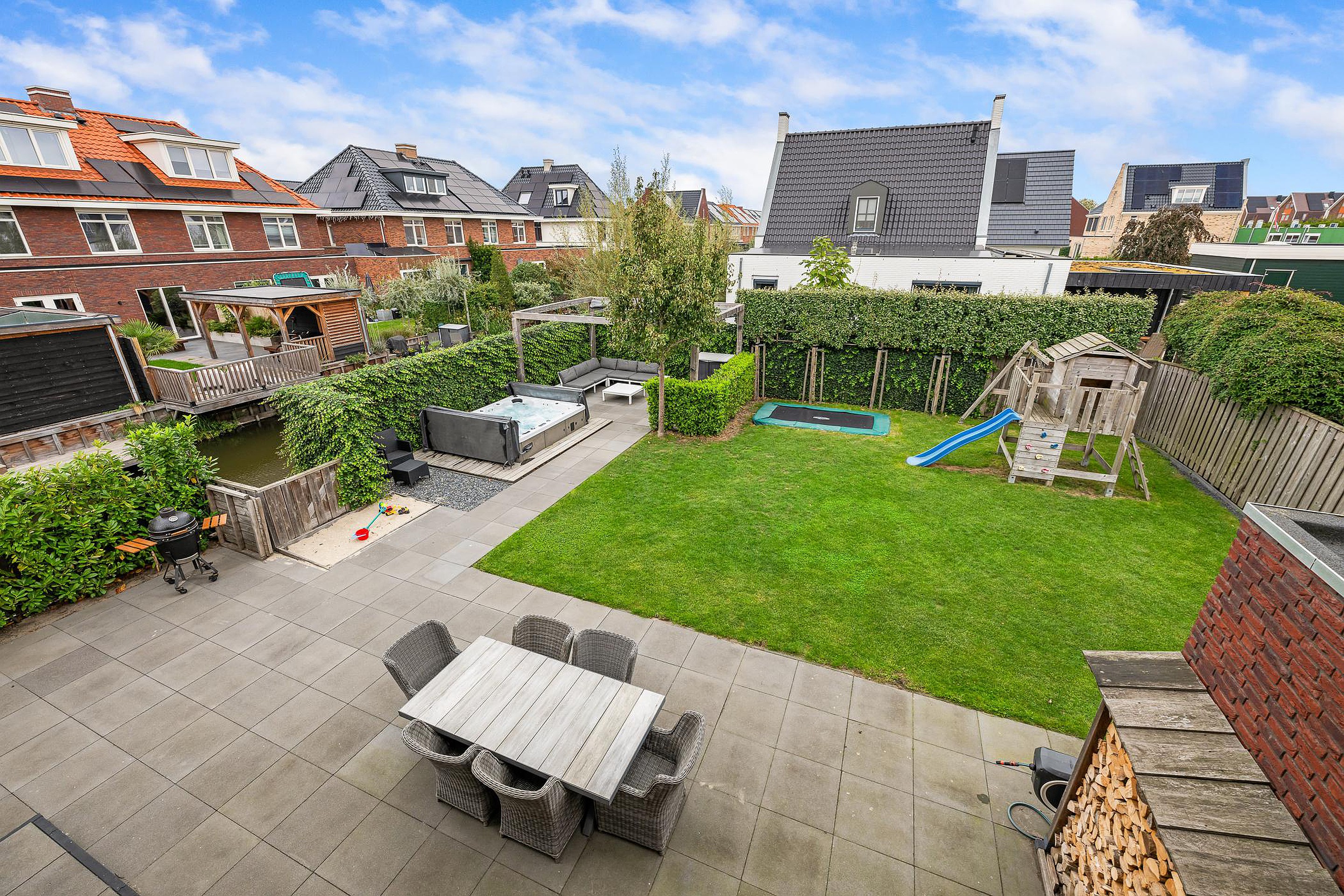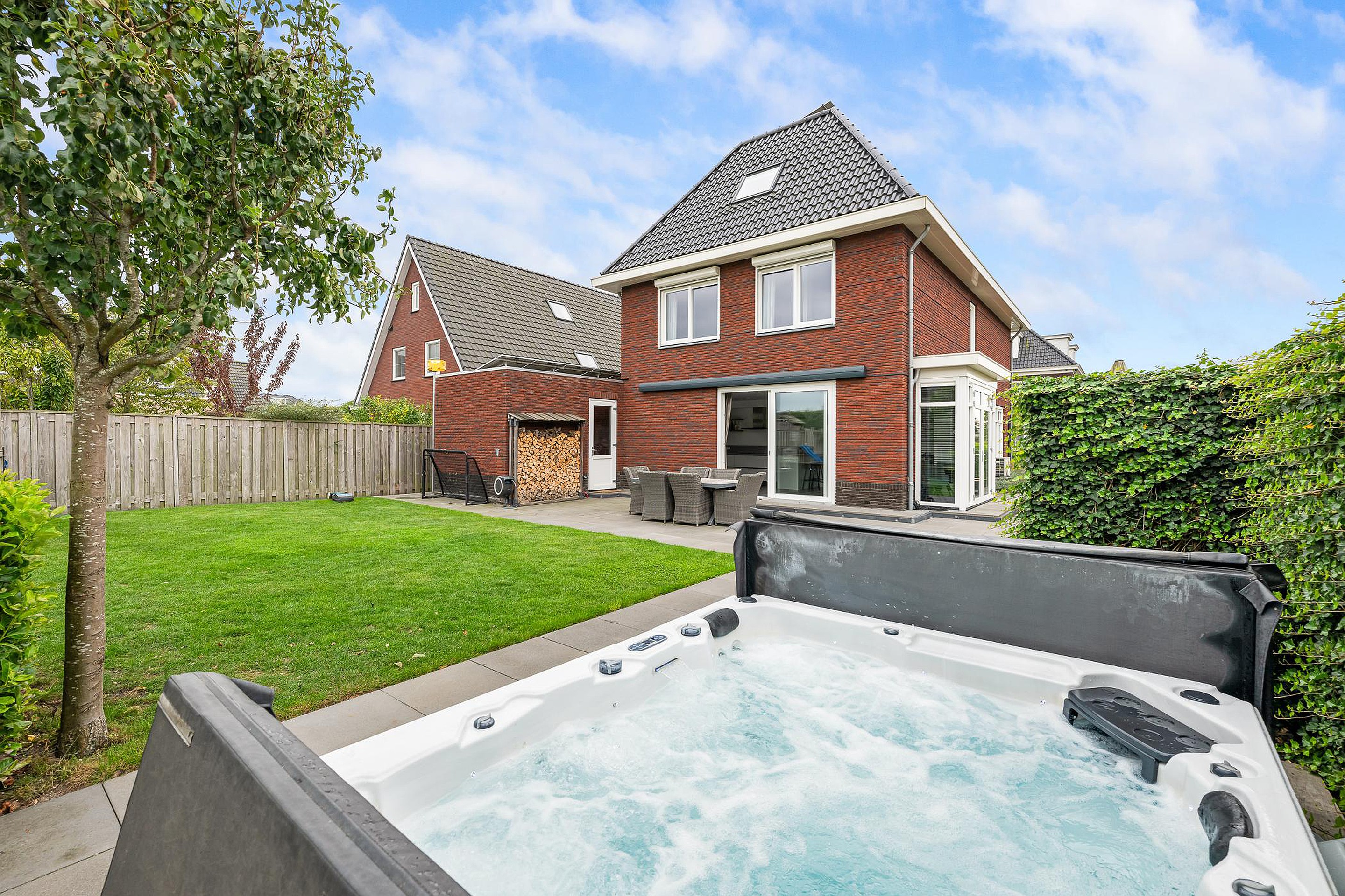 Tuin De woning heeft een groene tuin rondom, waarin voor ieder wat wils te vinden is: meerdere terrassen om in de zon of schaduw te zitten, een trampoline en speelhuis voor de kinderen en een jacuzzi om heerlijk te ontspannen. Aan de zijkant grenst de tuin aan het water, waar een vlonder is gemaakt om te vissen of een bootje te water te laten. Aan de voorzijde is ruimte om drie auto’s op eigen terrein te parkeren.