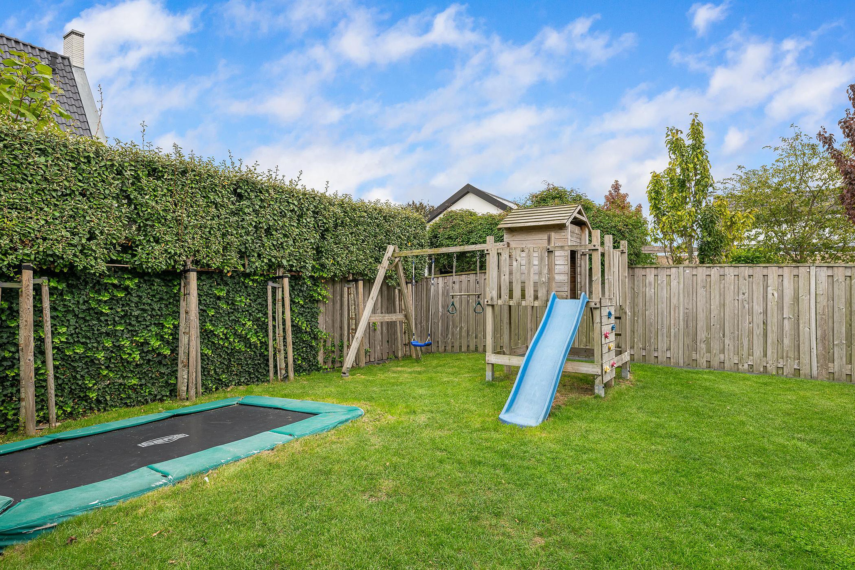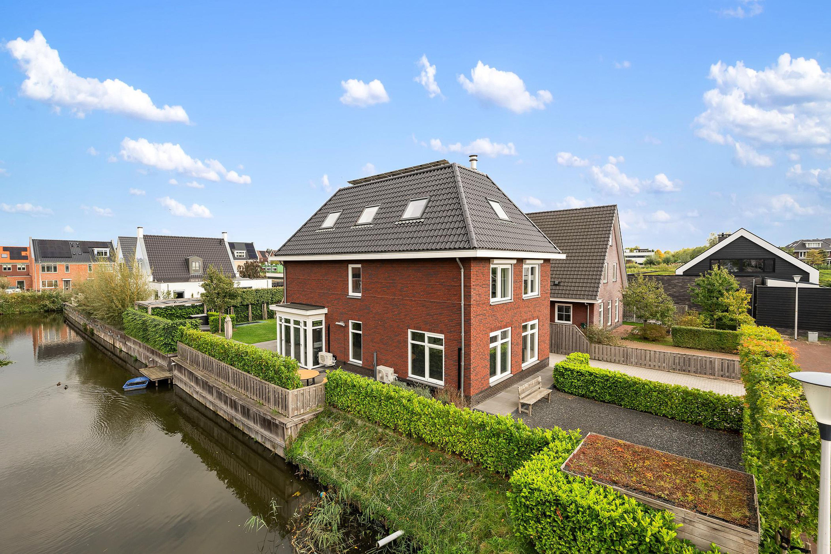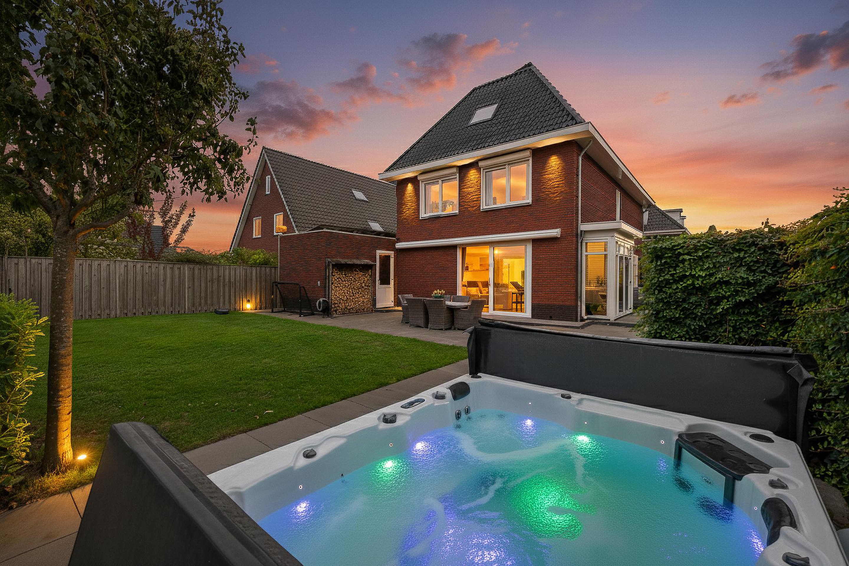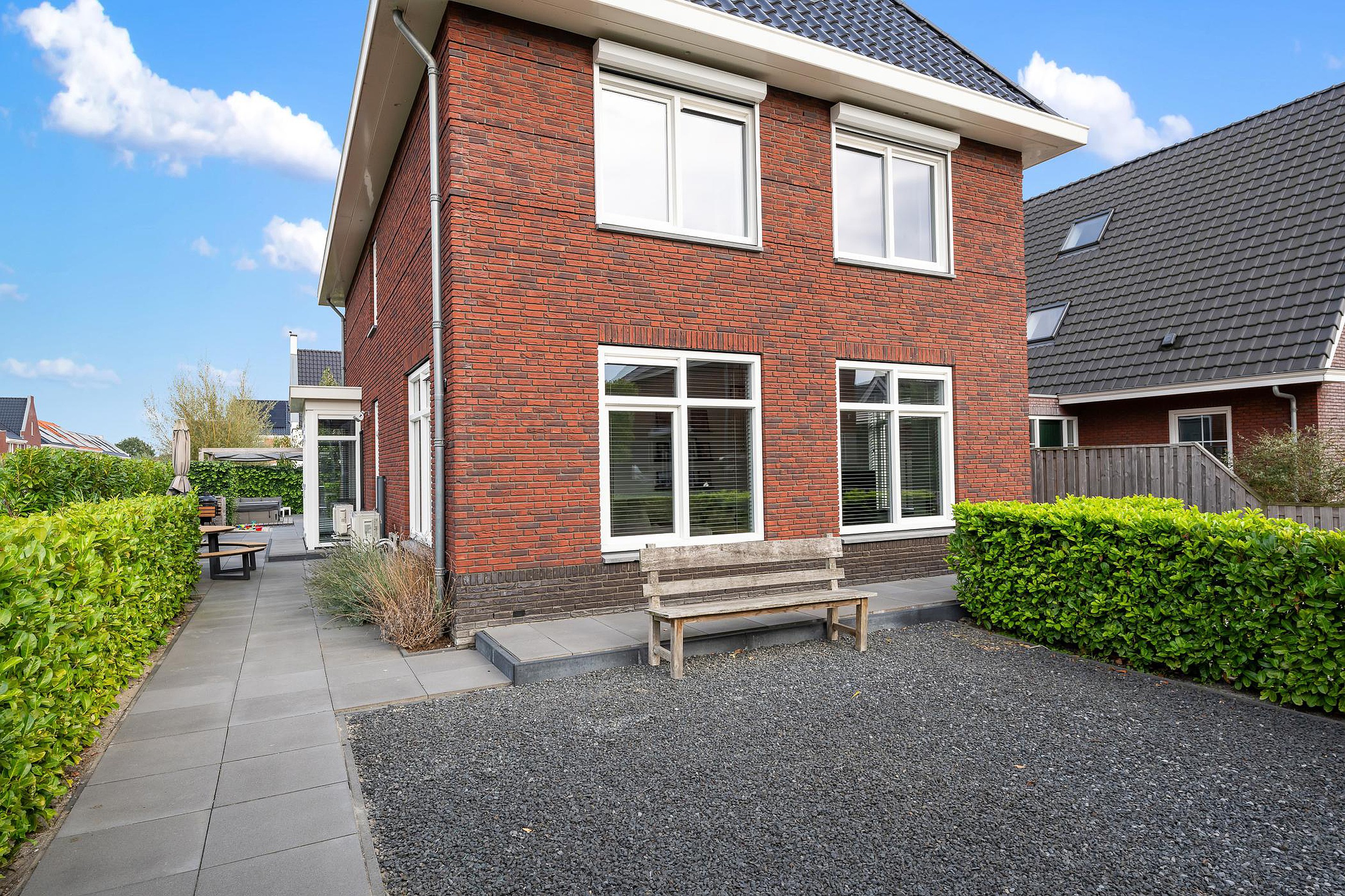 Tuin De woning heeft een groene tuin rondom, waarin voor ieder wat wils te vinden is: meerdere terrassen om in de zon of schaduw te zitten, een trampoline en speelhuis voor de kinderen en een jacuzzi om heerlijk te ontspannen. Aan de zijkant grenst de tuin aan het water, waar een vlonder is gemaakt om te vissen of een bootje te water te laten. Aan de voorzijde is ruimte om drie auto’s op eigen terrein te parkeren.
