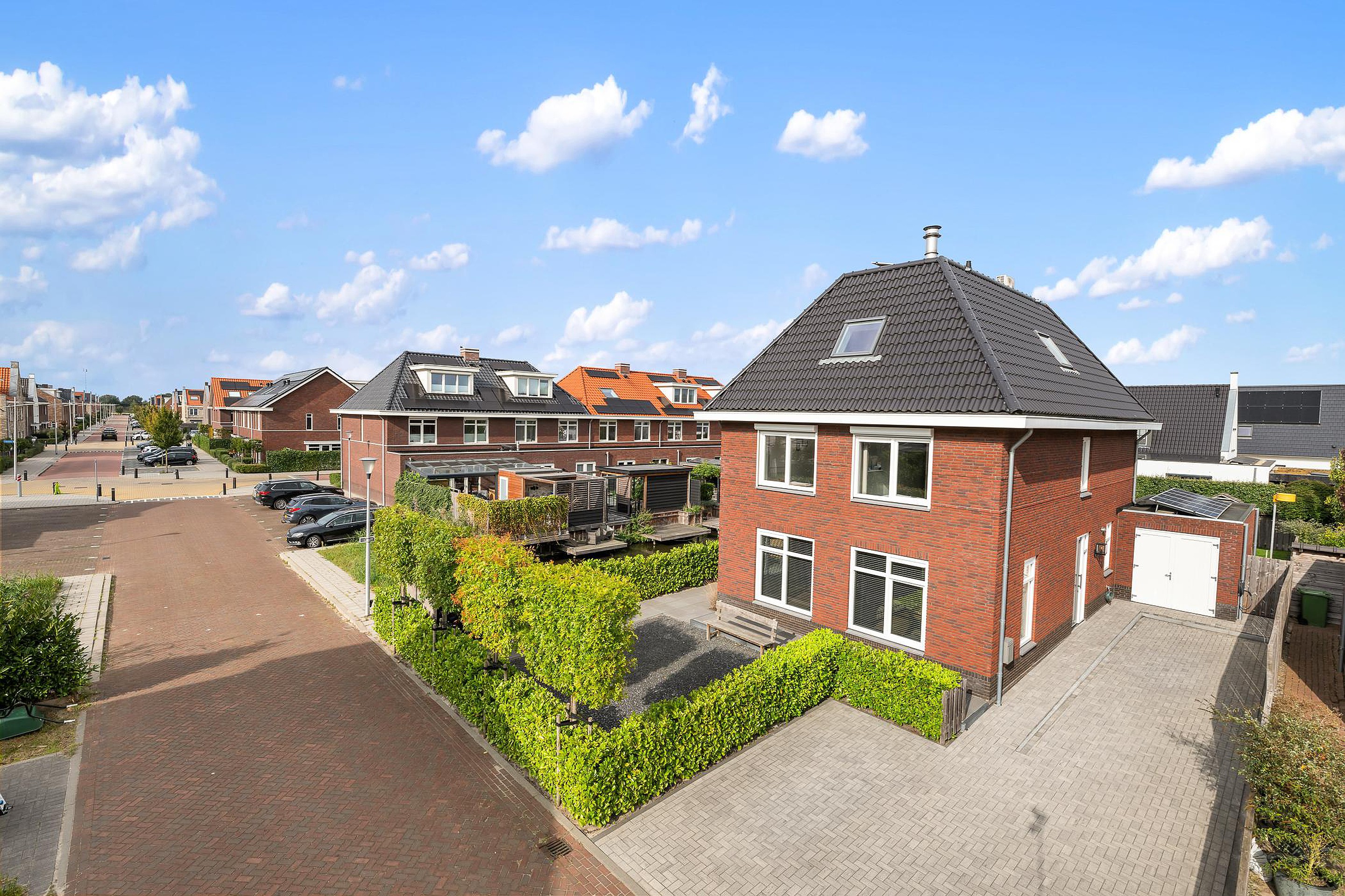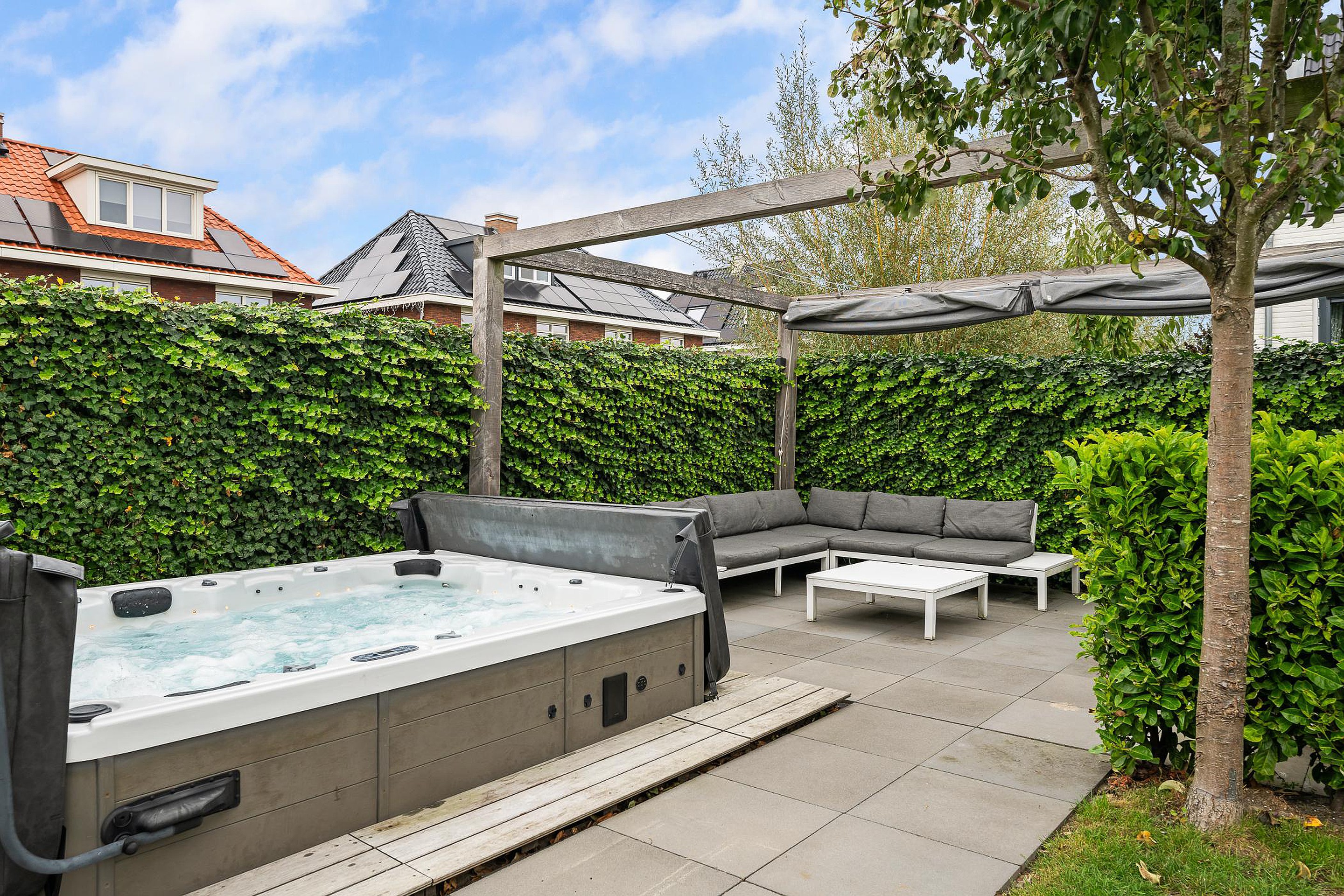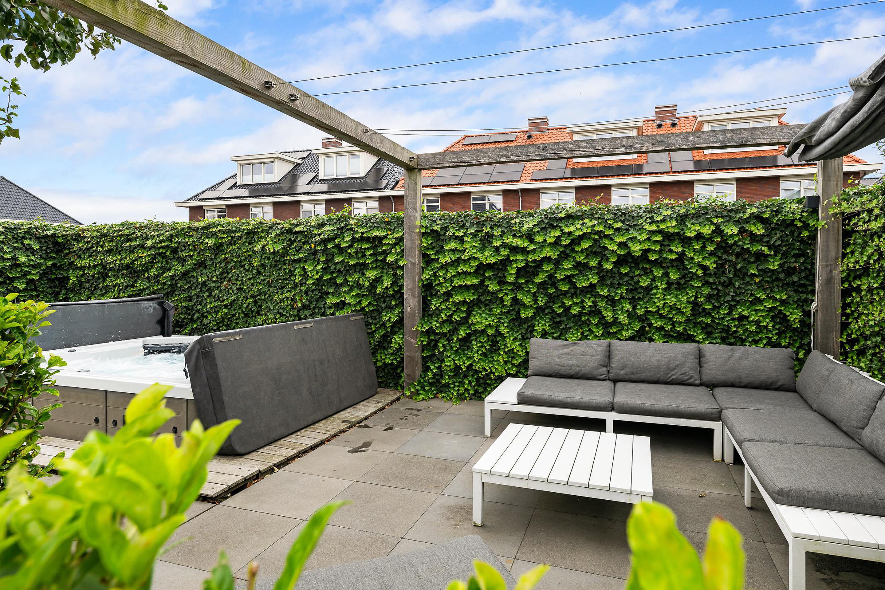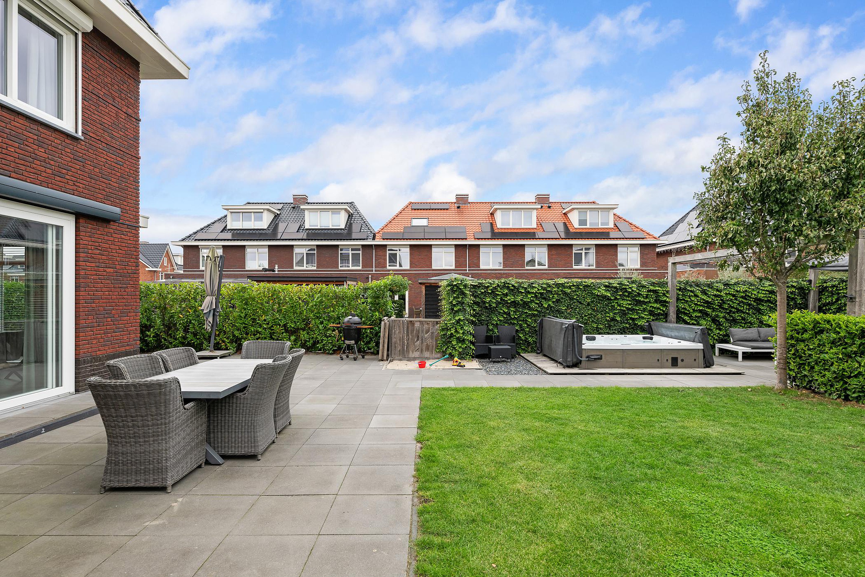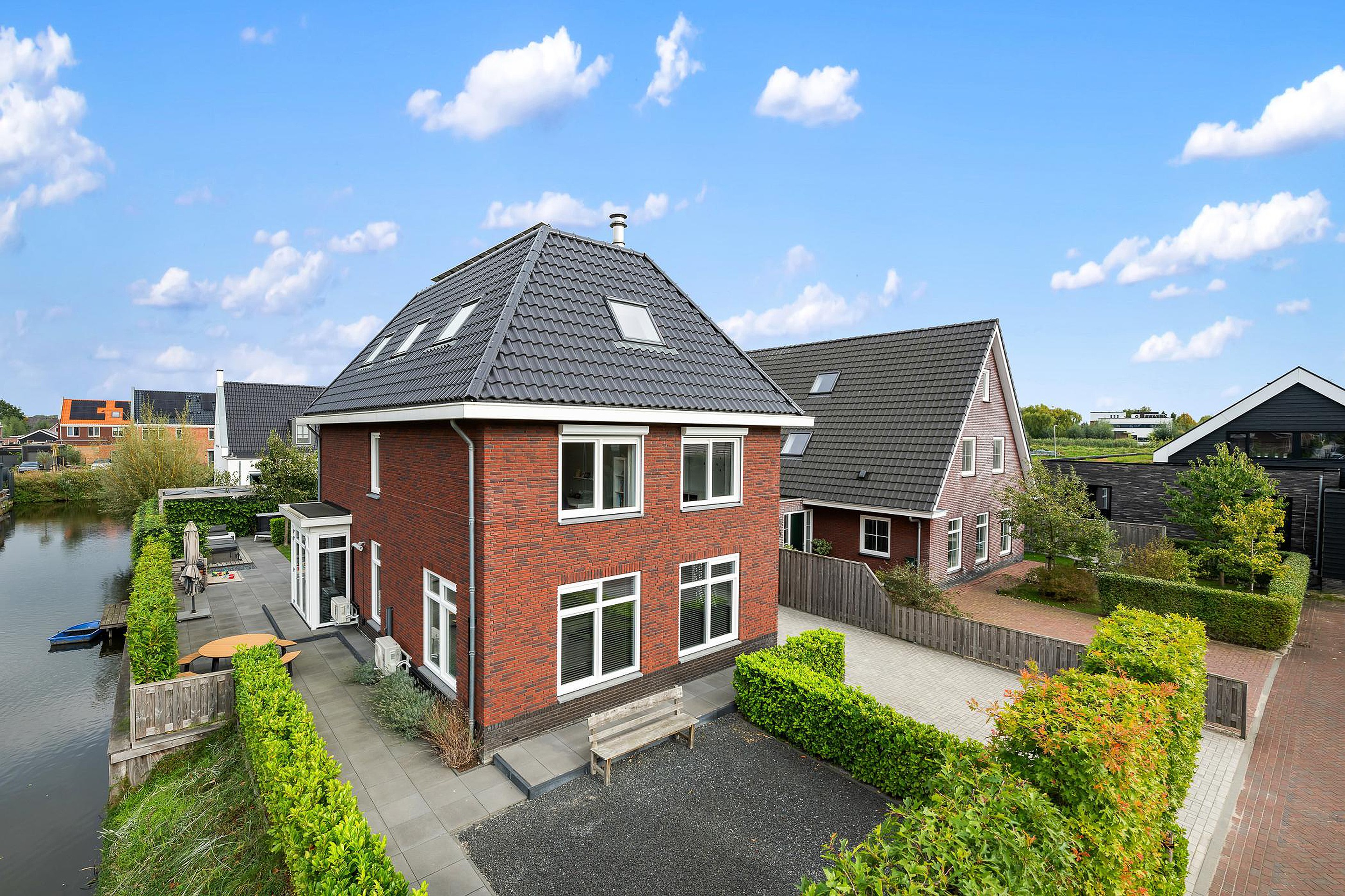 Tuin De woning heeft een groene tuin rondom, waarin voor ieder wat wils te vinden is: meerdere terrassen om in de zon of schaduw te zitten, een trampoline en speelhuis voor de kinderen en een jacuzzi om heerlijk te ontspannen. Aan de zijkant grenst de tuin aan het water, waar een vlonder is gemaakt om te vissen of een bootje te water te laten. Aan de voorzijde is ruimte om drie auto’s op eigen terrein te parkeren.