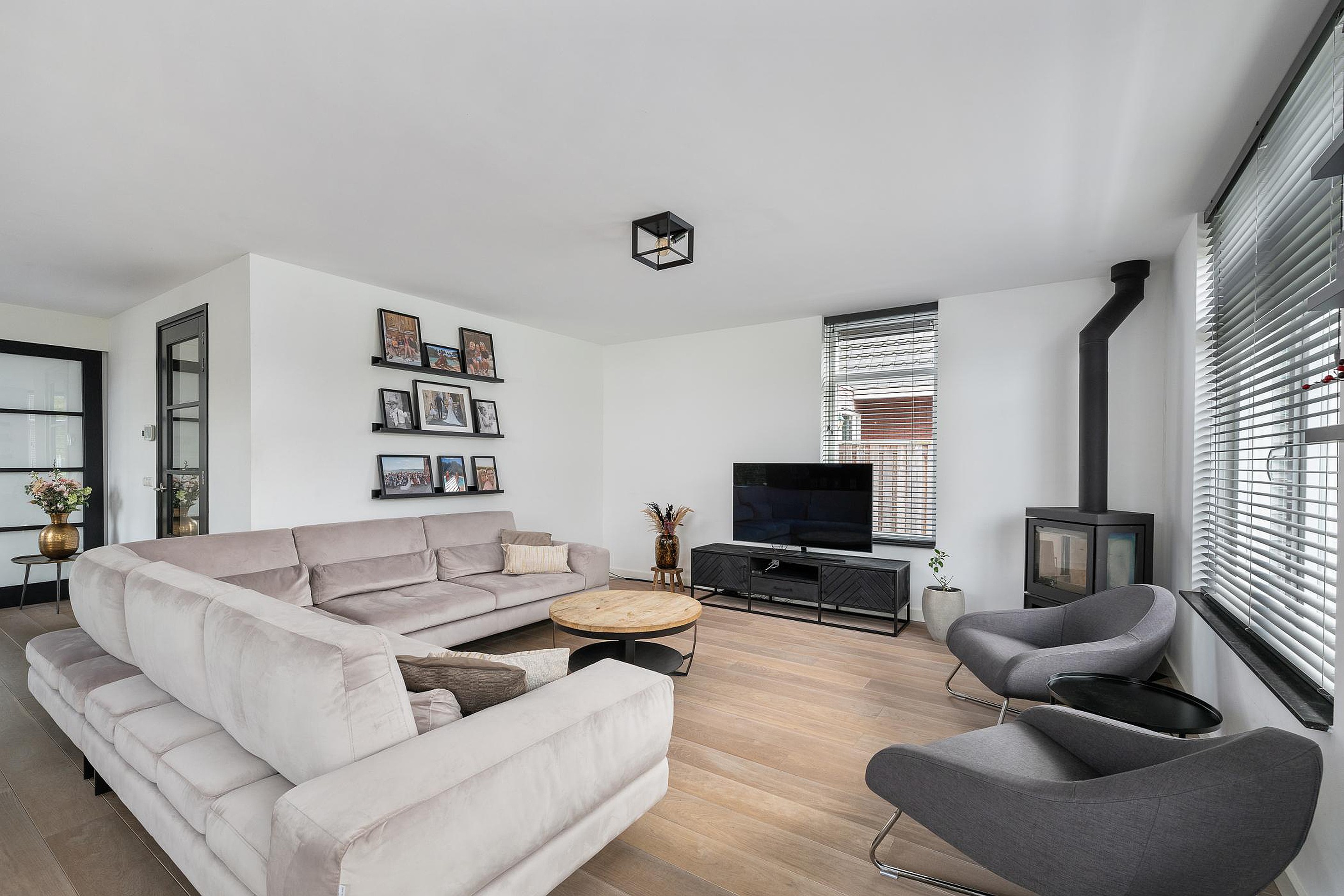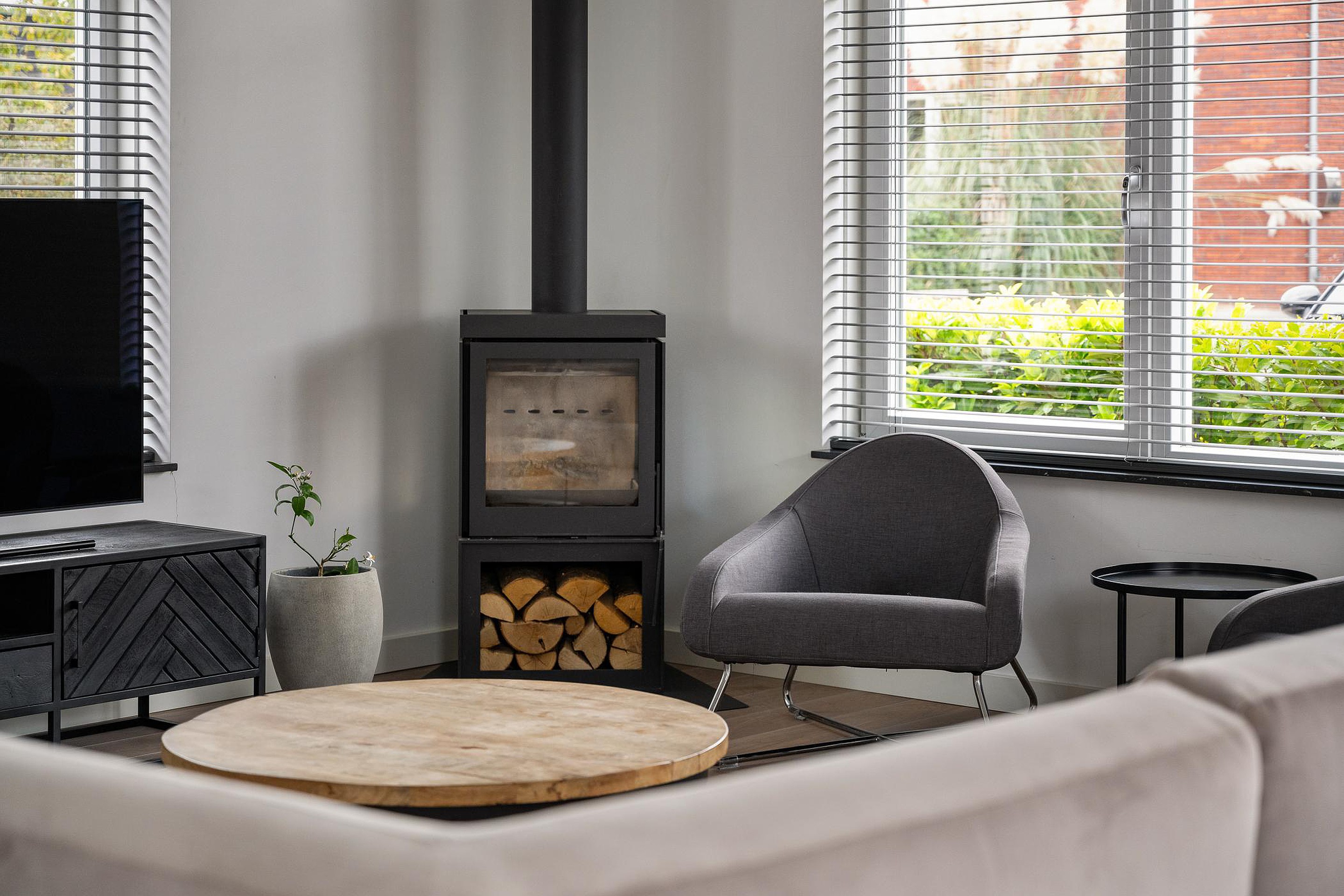 - Sfeervolle woonkamer met houtkachel en een woonkeuken