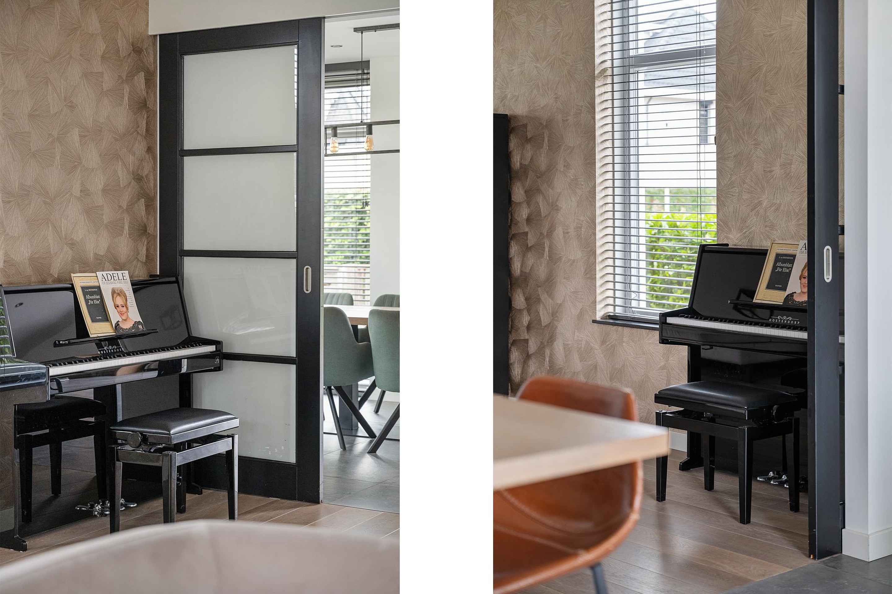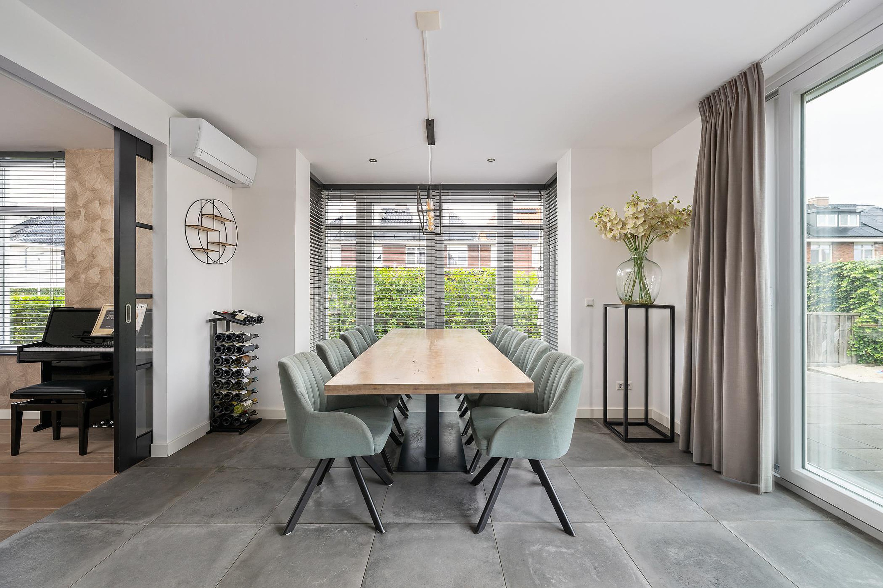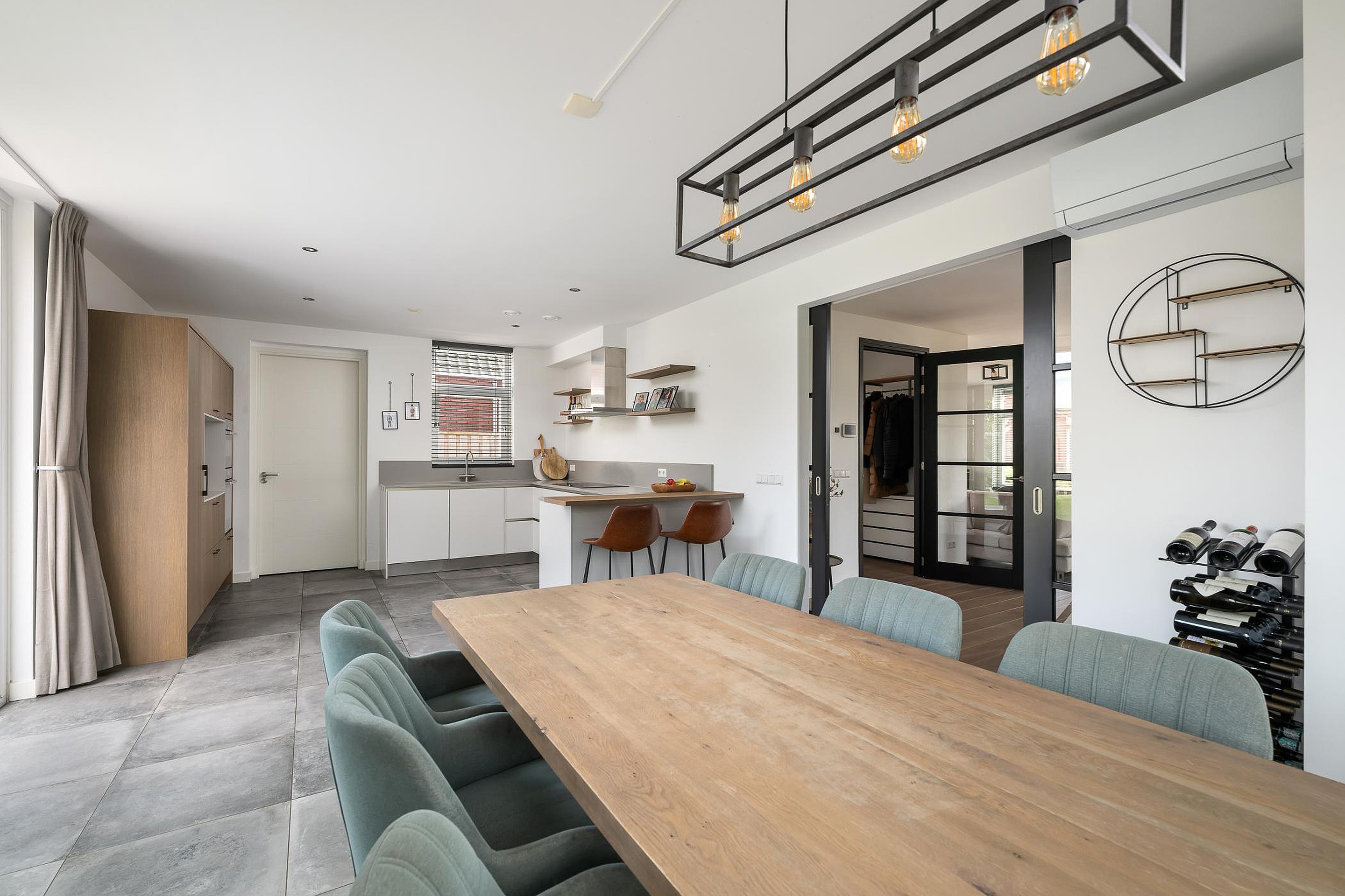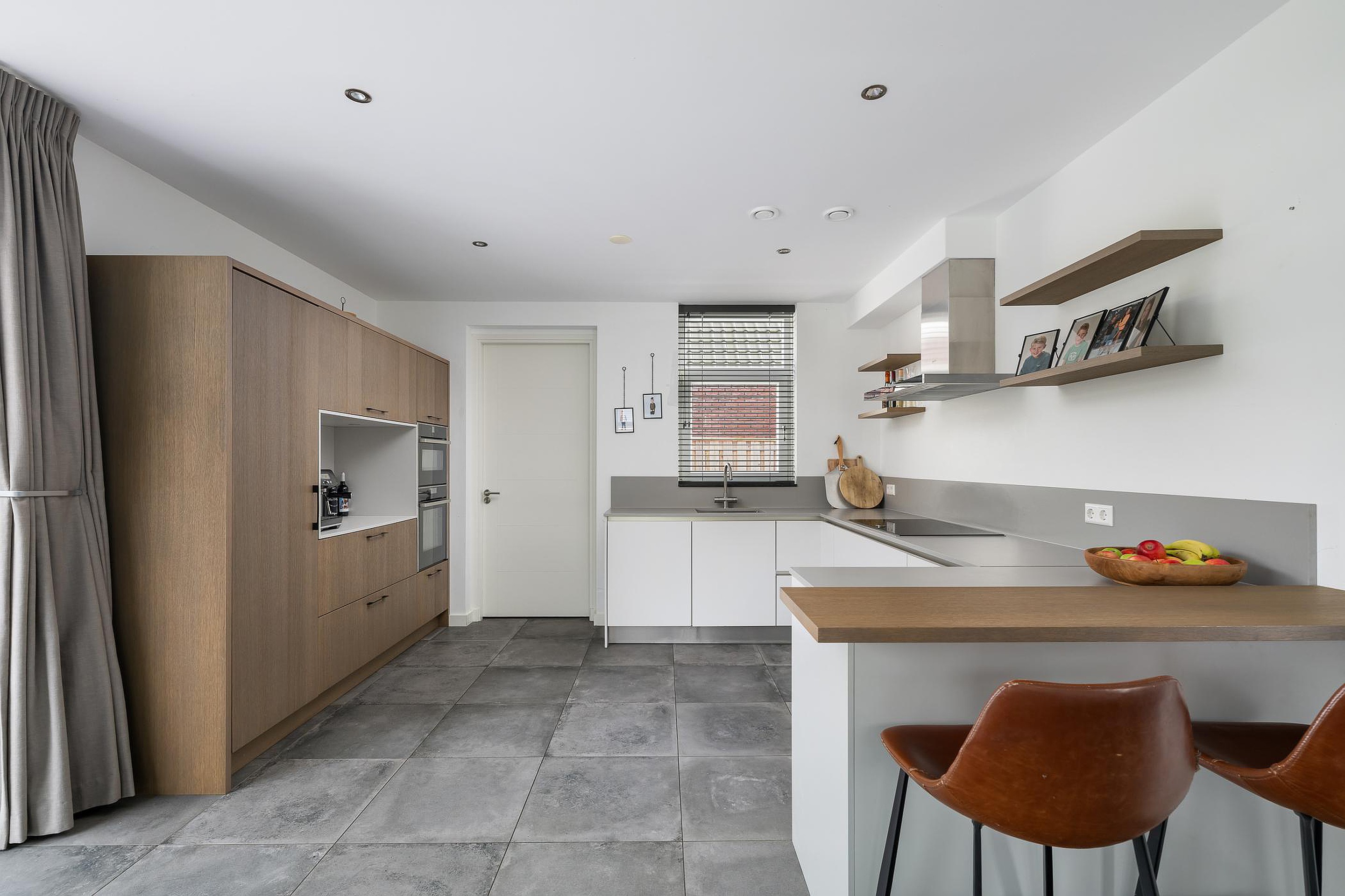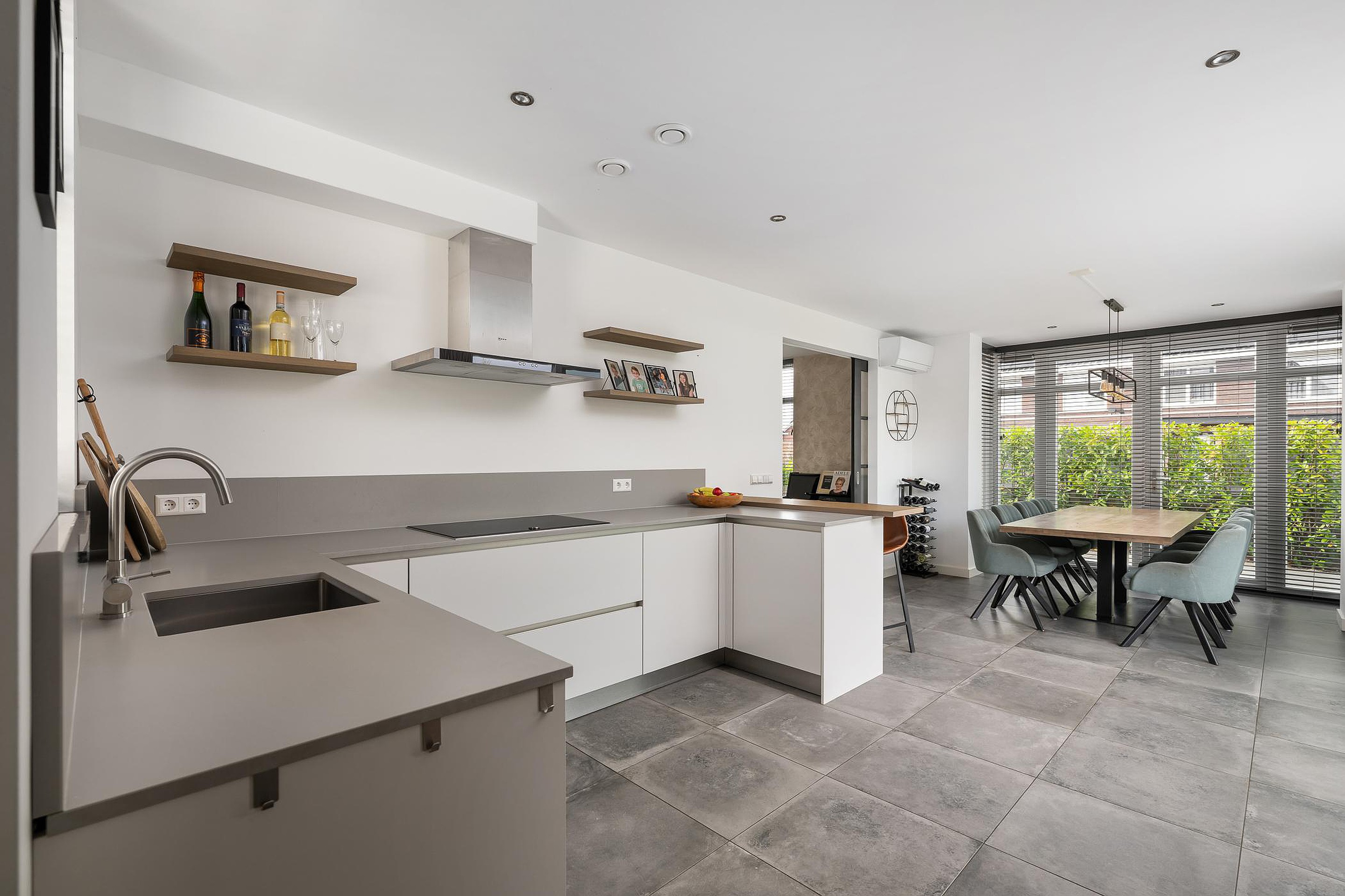 De erker in de woonkeuken met openslaande deuren naar de zijtuin zorgen voor veel licht. De keuken is voorzien van Neff-inbouwapparatuur zoals een koel/vrieskast, combi oven / magnetron, stoomoven, vaatwasser, een inductie kookplaat met afzuiger en een bar om aan te zitten. De gehele begane grond heeft vloerverwarming en strak gestuukte wanden en plafonds.