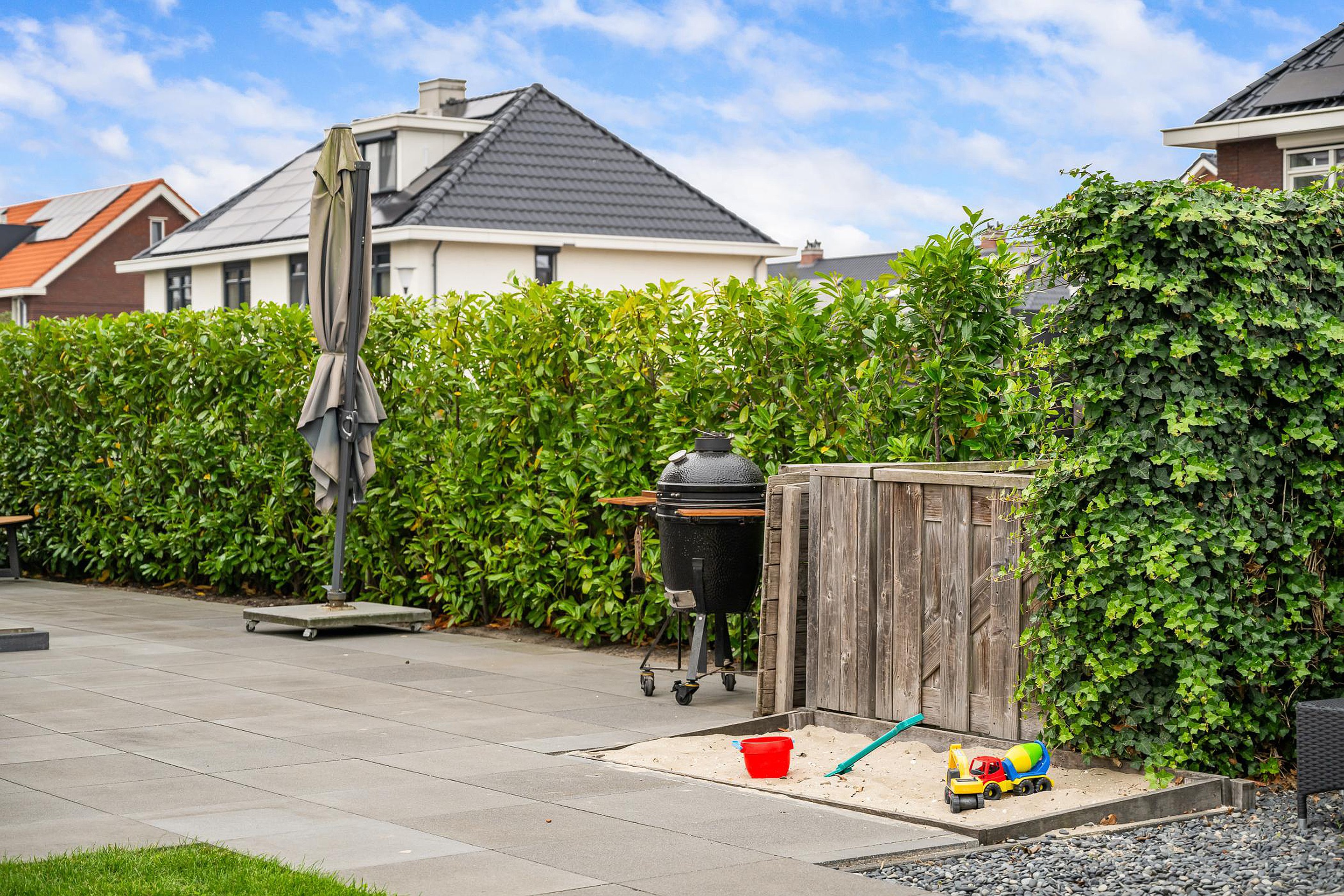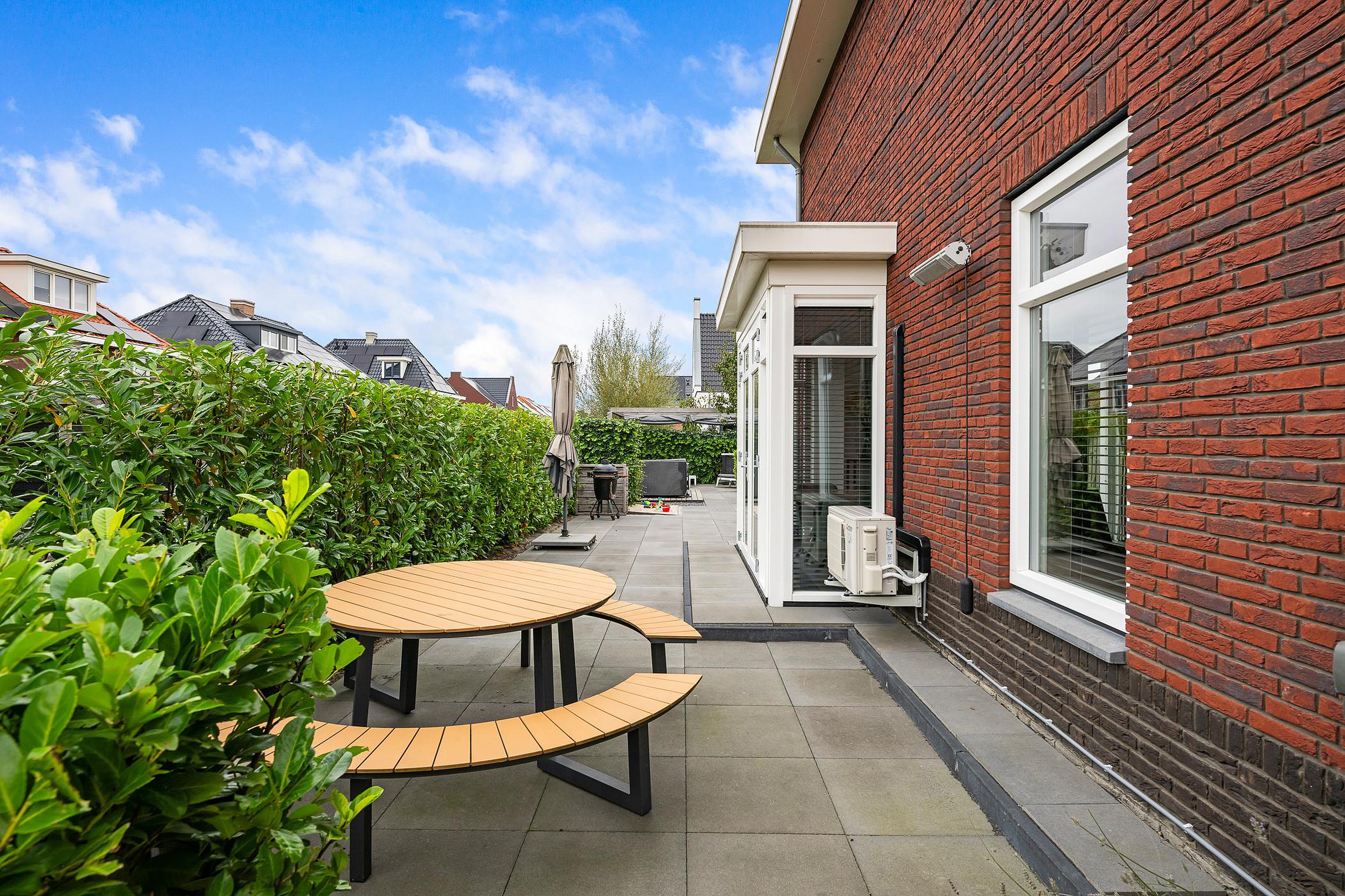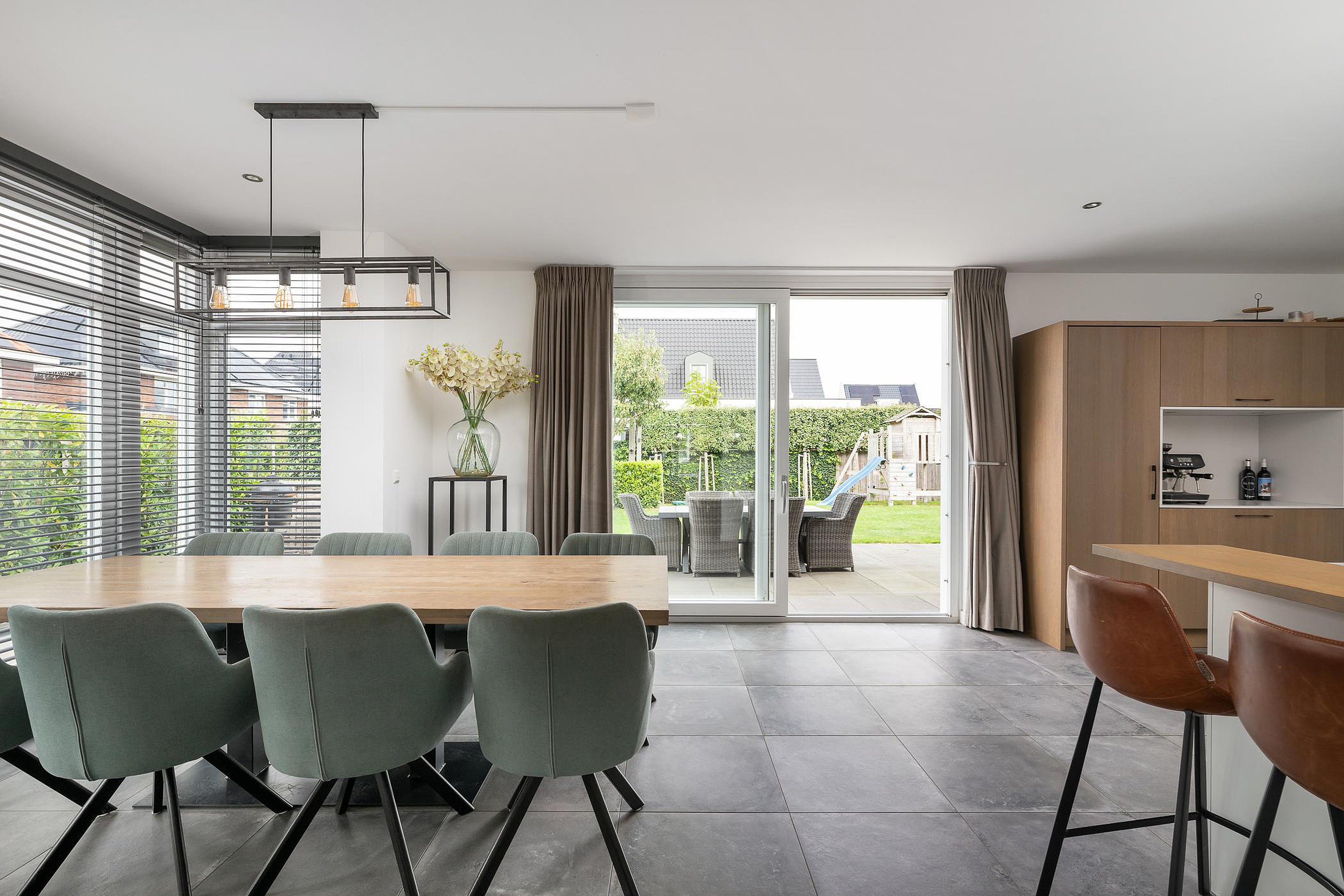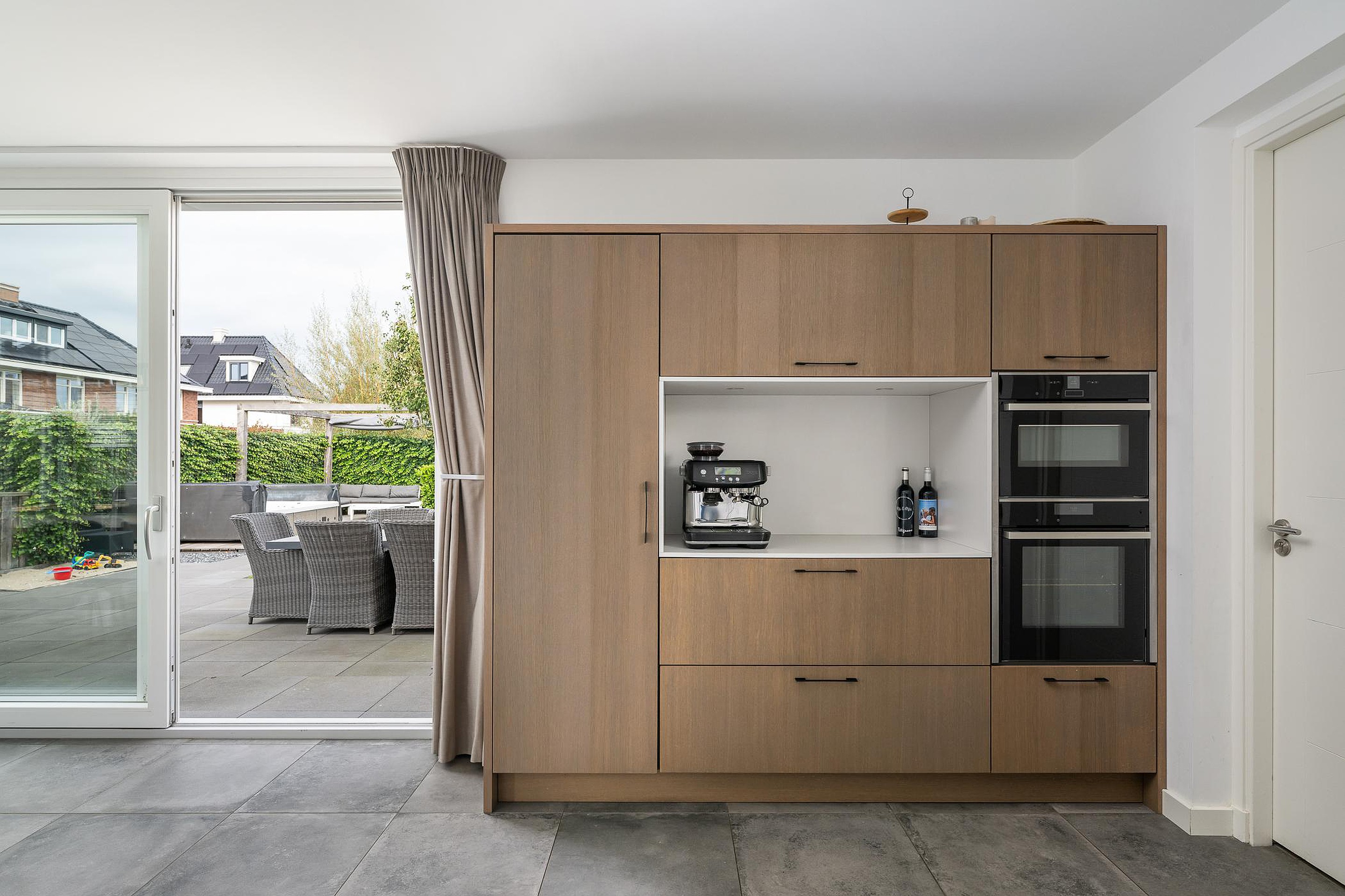 Via de brede schuifpui stapt u zo vanuit de keuken het terras op. Hier bevindt zich een elektrisch breed zonnescherm. Vanuit de keuken is er ook een deur naar de garage, die ruim genoeg is voor voorraad, fietsen en een werktafel. Daarnaast is er een deur vanuit de garage naar de tuin en naar de oprit.