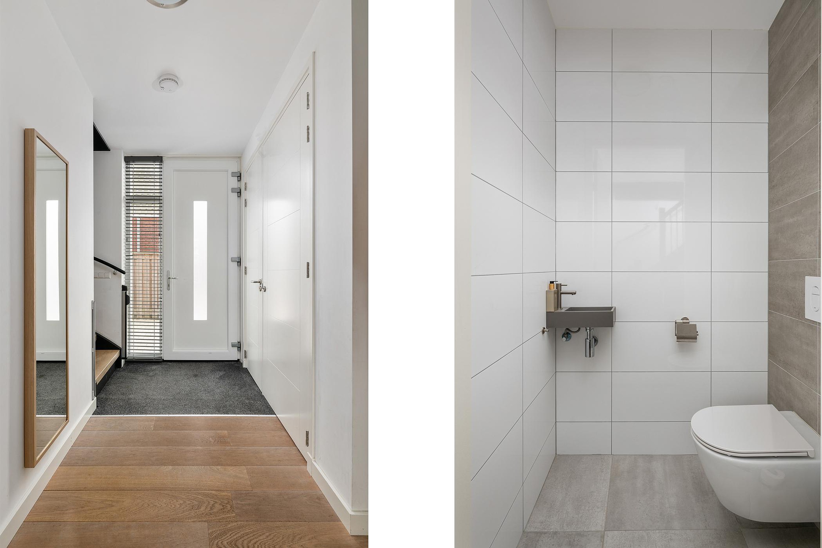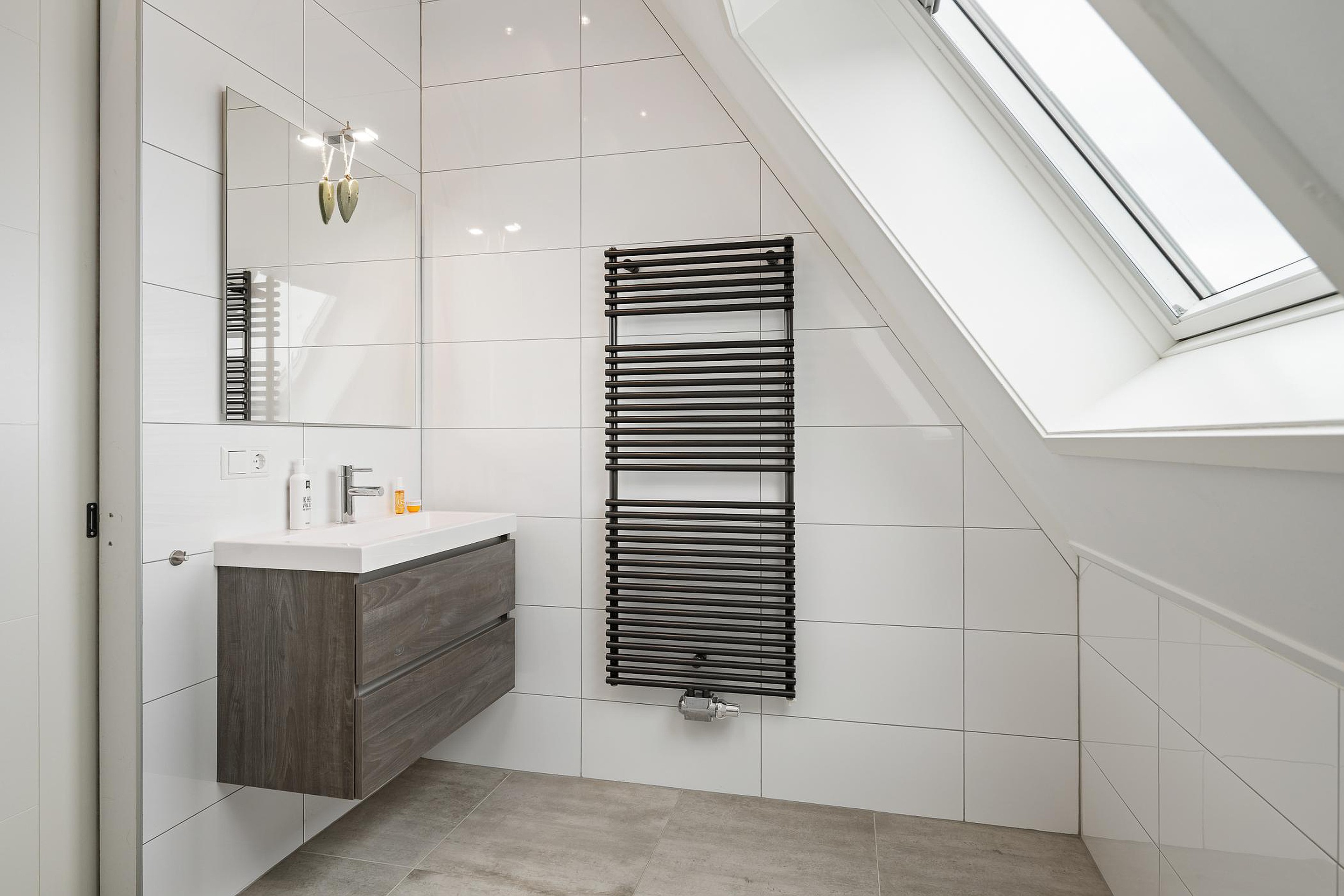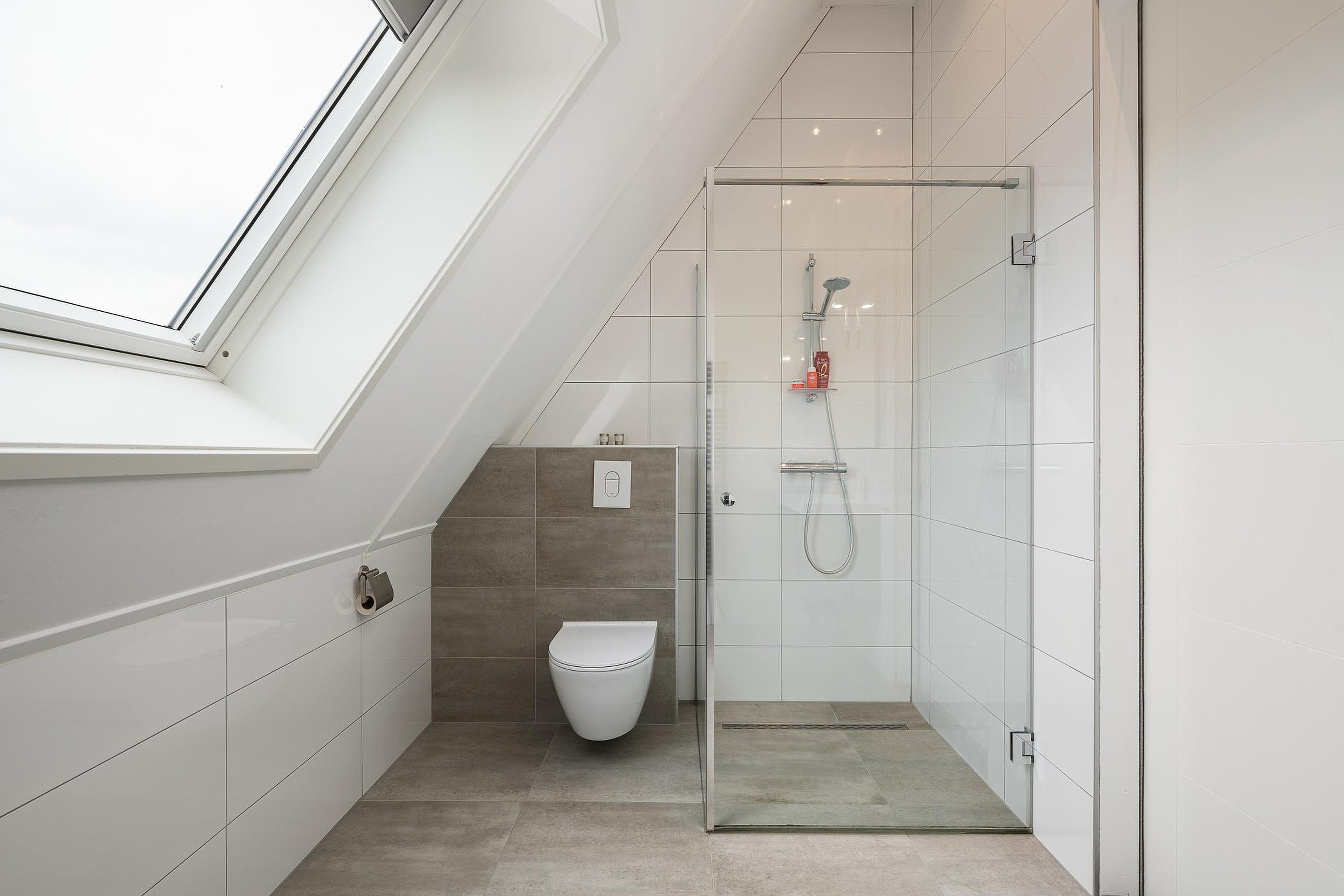Er is een tweede badkamer met inloopdouche, wastafelmeubel en toilet, eveneens met vloerverwarming. Op de overloop zijn de wasmachineaansluiting en de Cv-installatie (2018) te vinden.