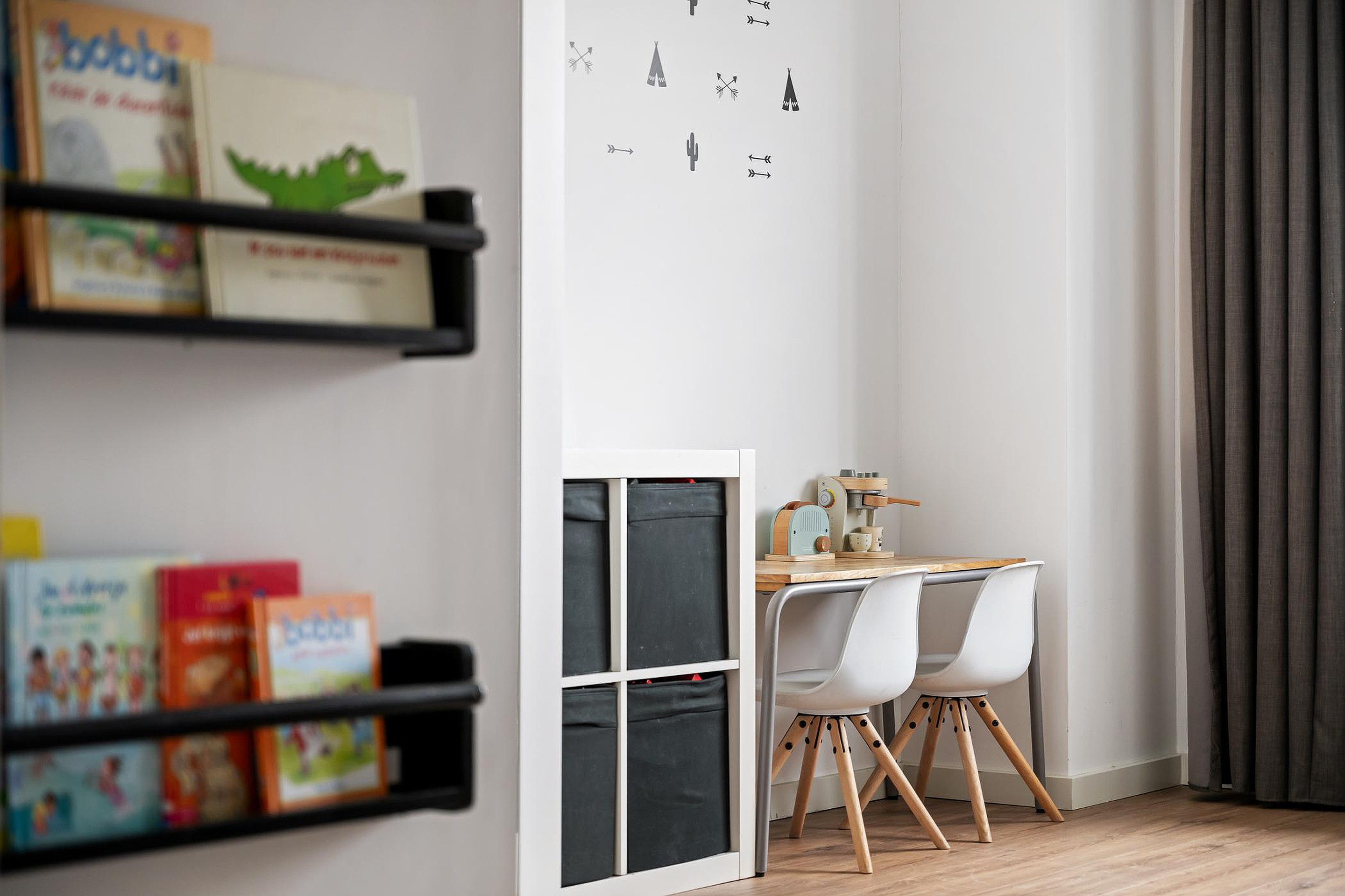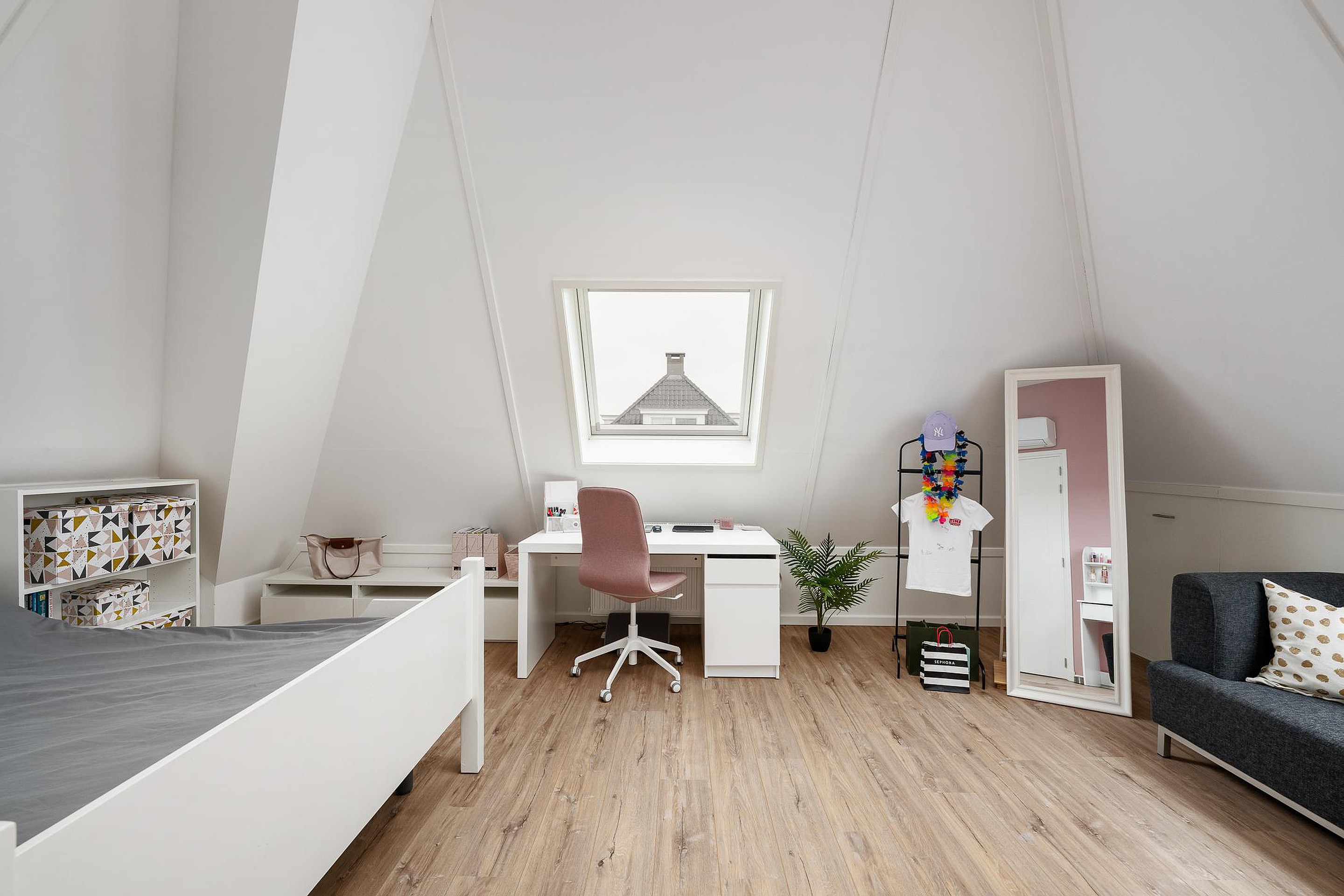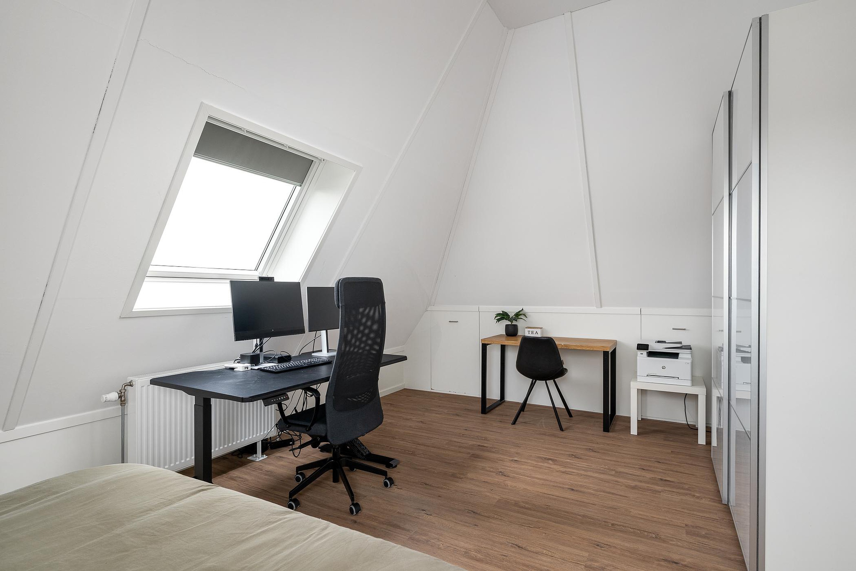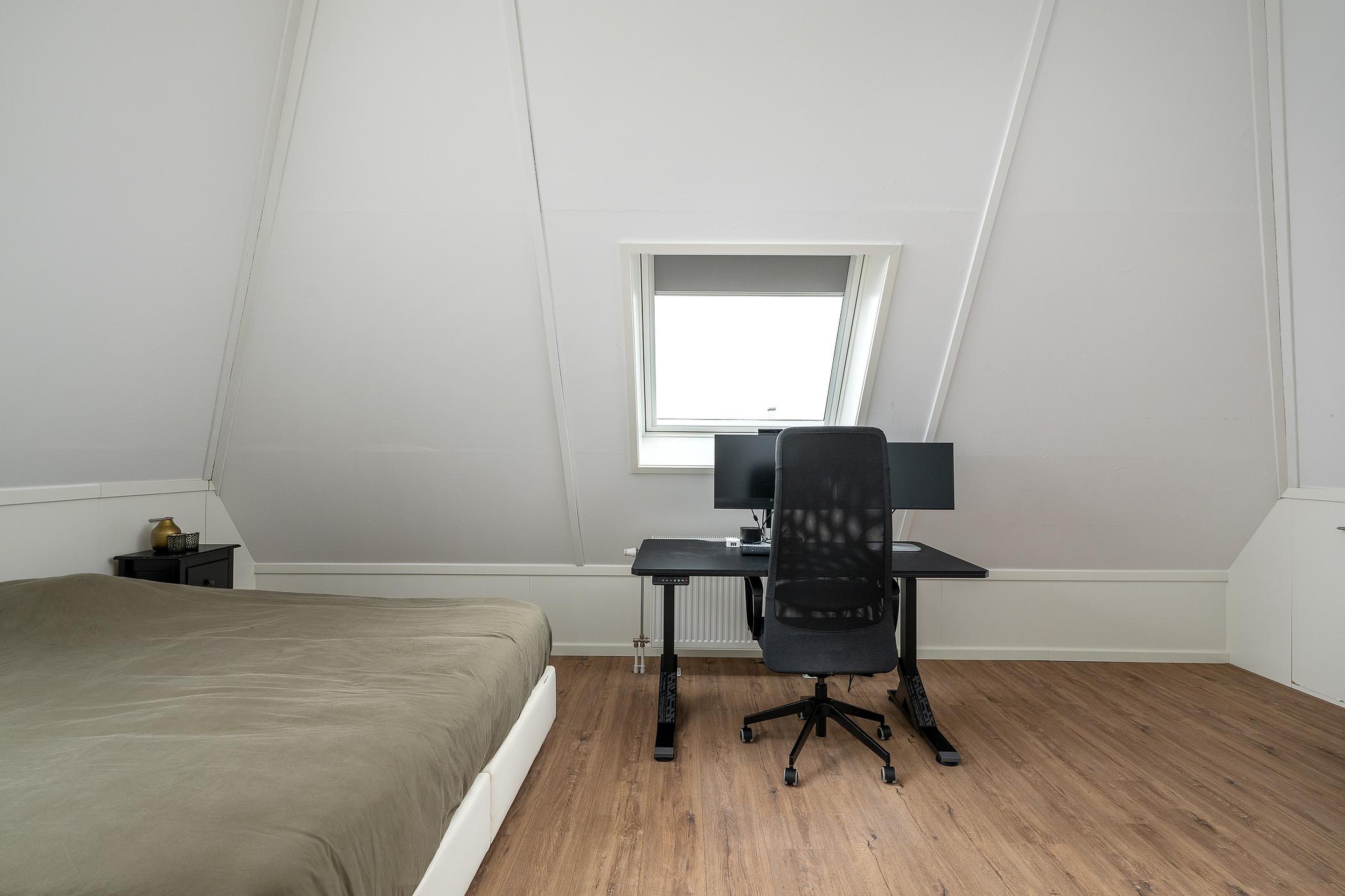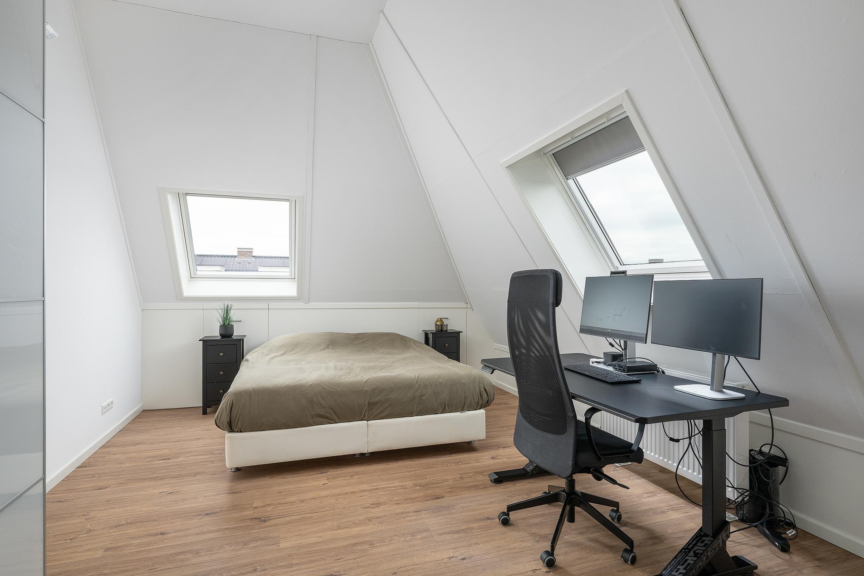 Tweede verdieping De tweede verdieping biedt verrassend veel ruimte. Hier zijn nog twee slaapkamers te vinden, beide voorzien van Velux-dakramen met verduistering, airconditioning en veel bergruimte achter de schotten.