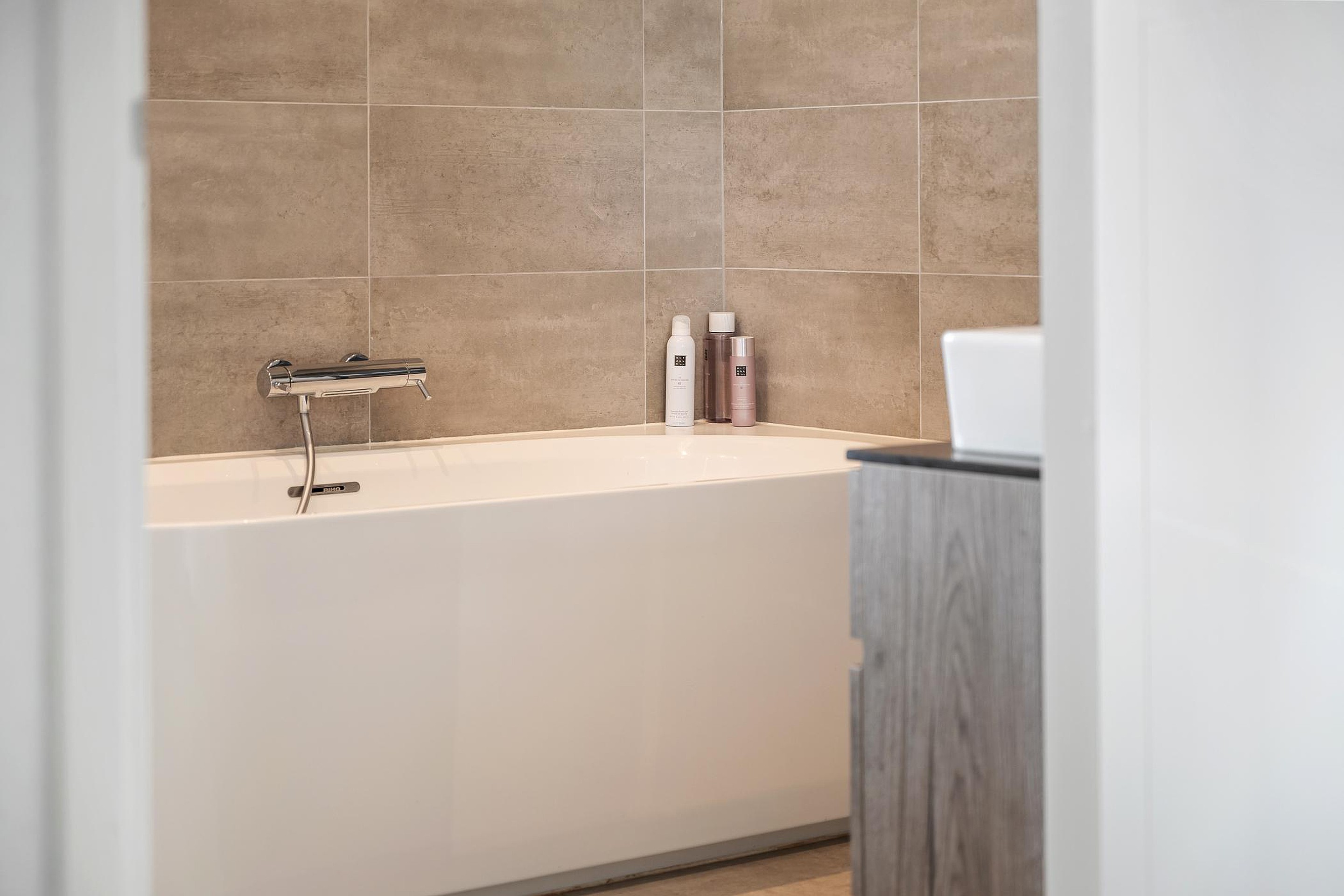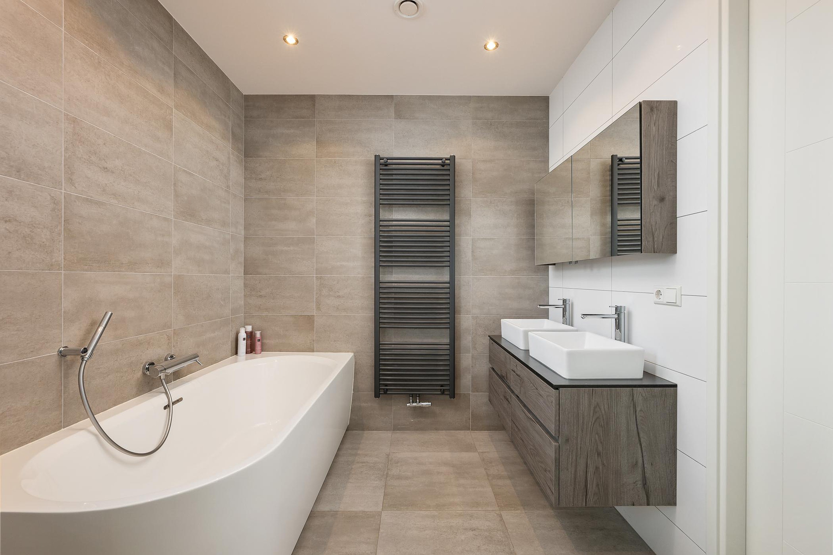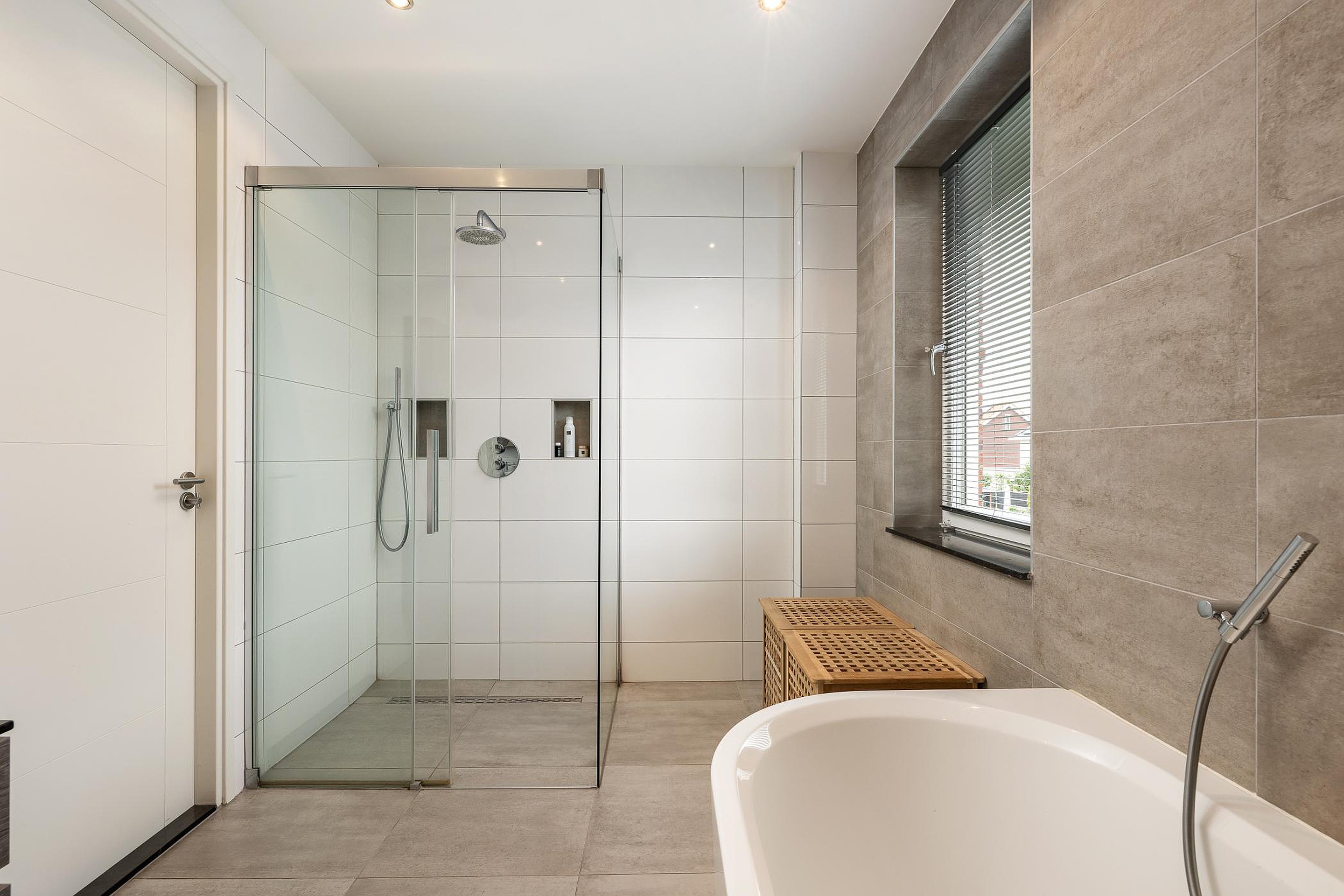 De badkamer is luxe uitgevoerd met een ligbad, inloopdouche, wastafelmeubel met een dubbele wasbak en vloerverwarming. Op de overloop bevindt zich een apart toilet.
