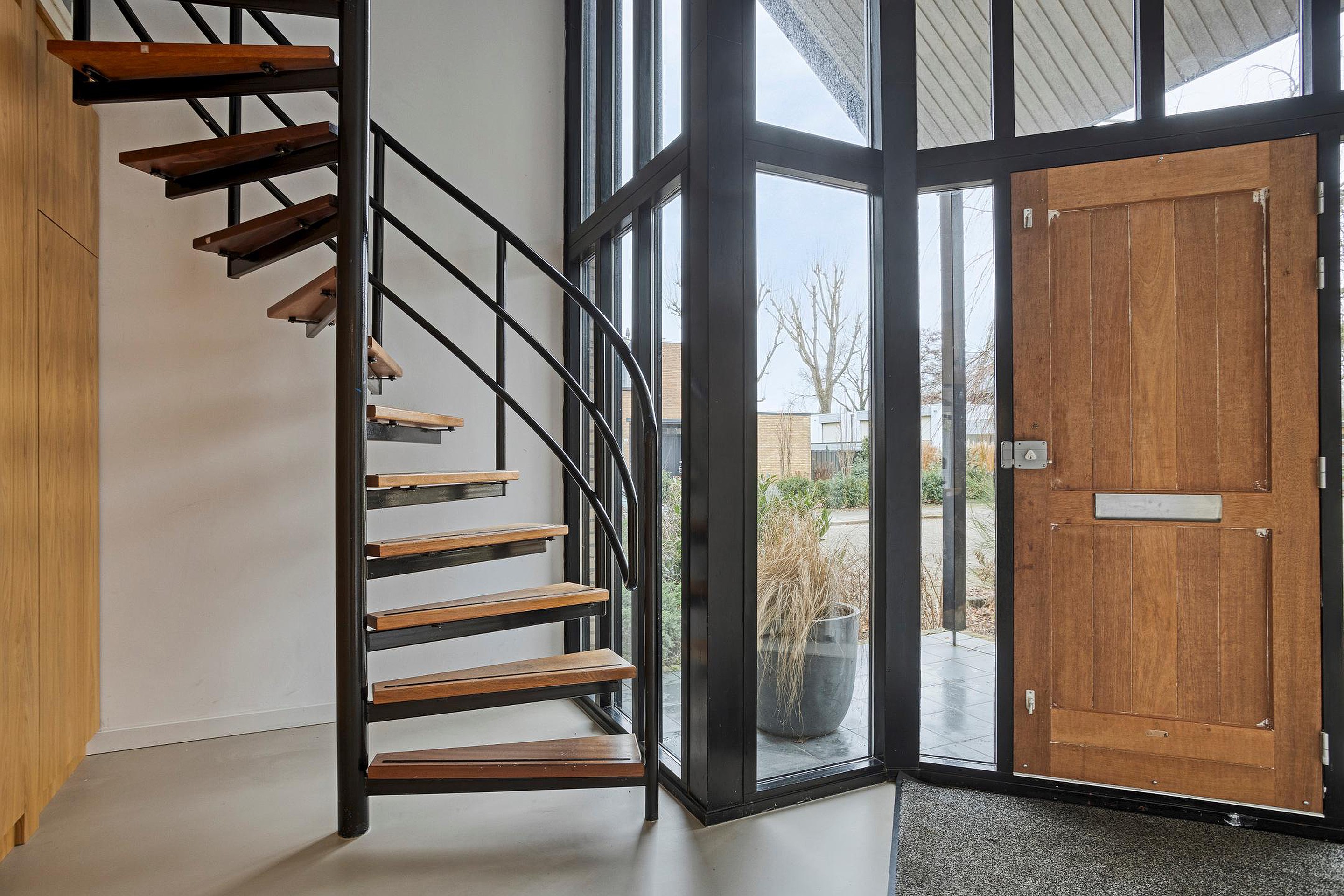 Ruime hal met modern toilet, prachtige opmaat gemaakte garderobekast en spiltrap naar de verdieping.