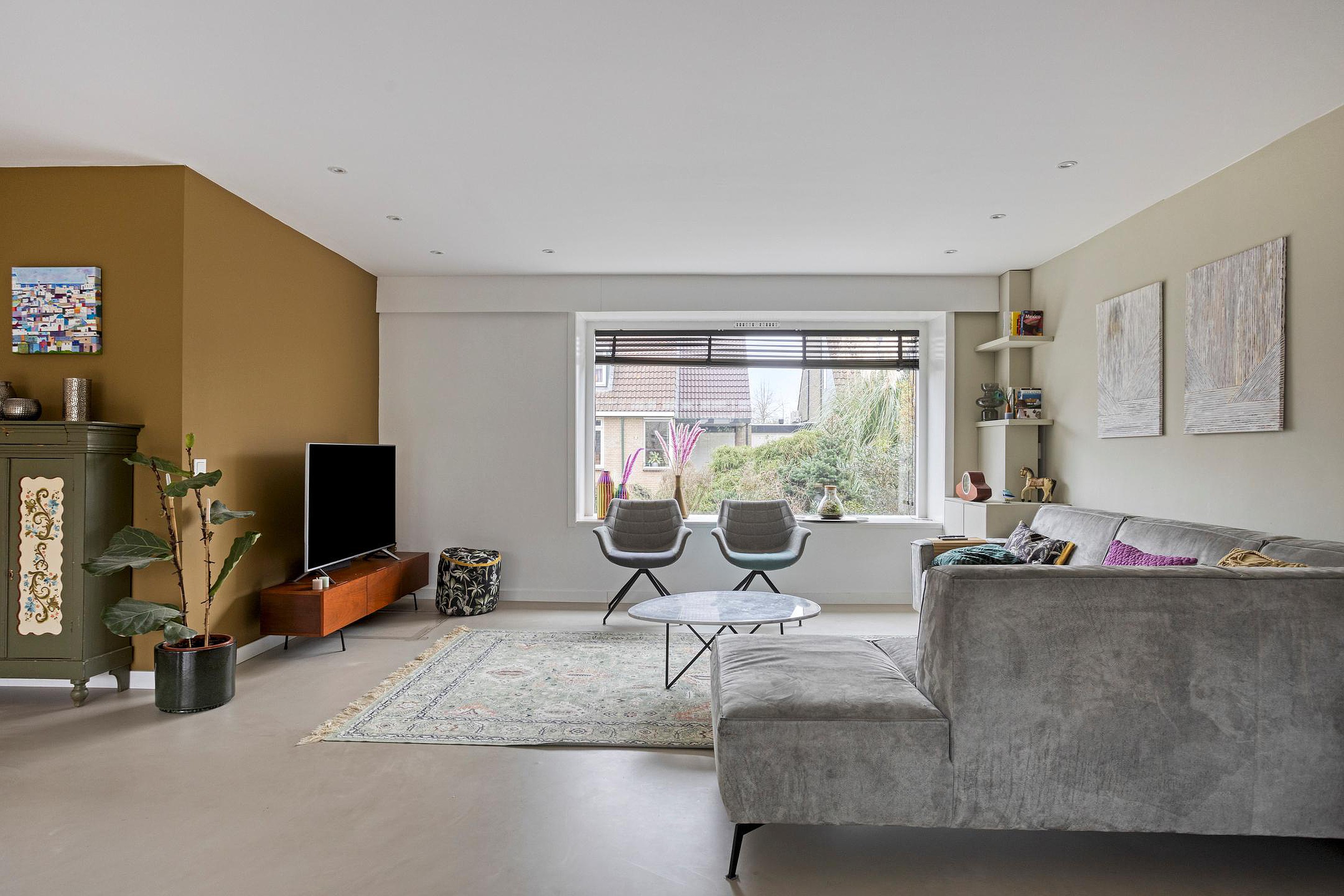 Via trendy olijfgroene deuren toegang naar de woonkamer.