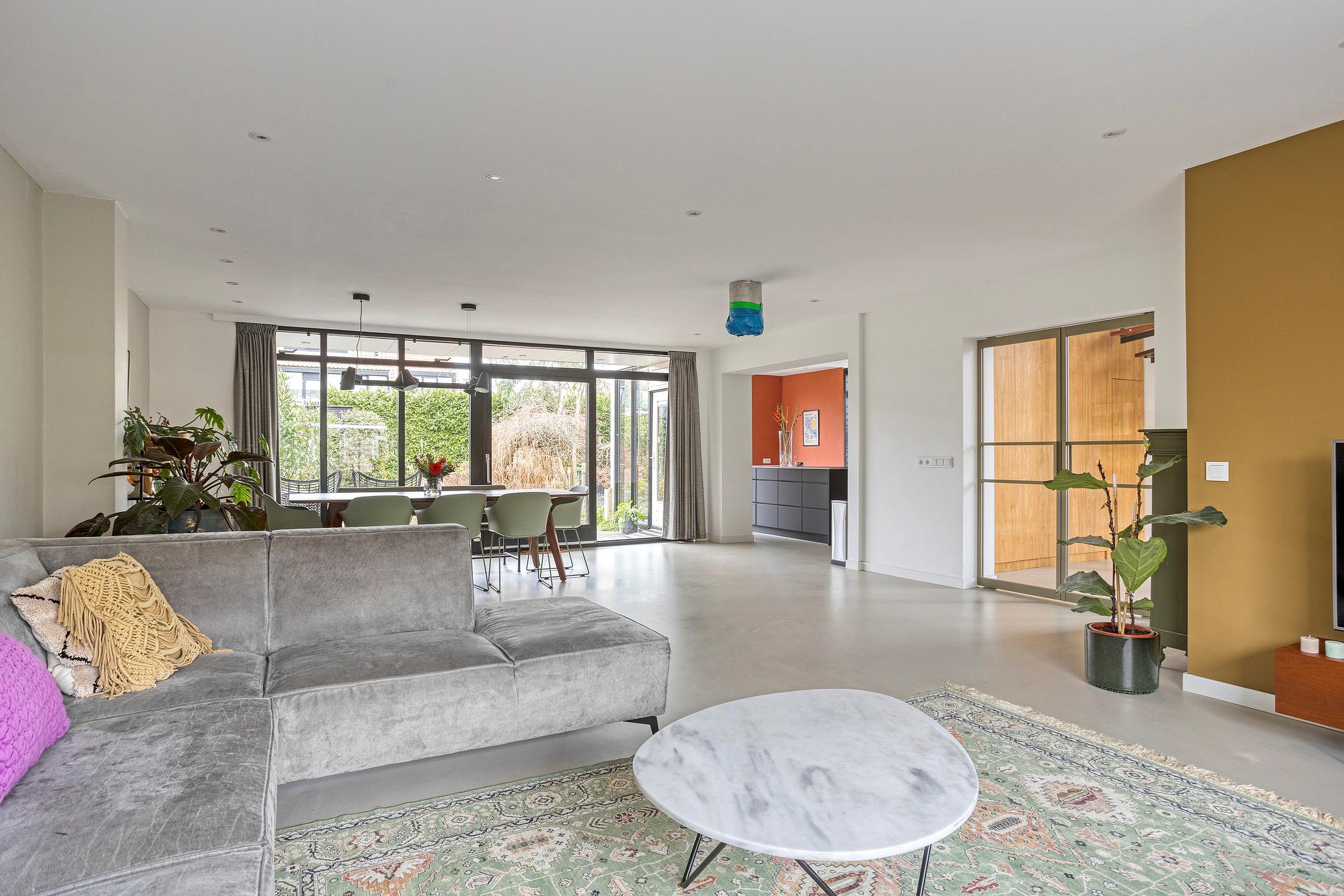 Royale en lichte woonkamer (ca. 8.48 x 6.01m) met brede schuifpui naar terras en tuin.