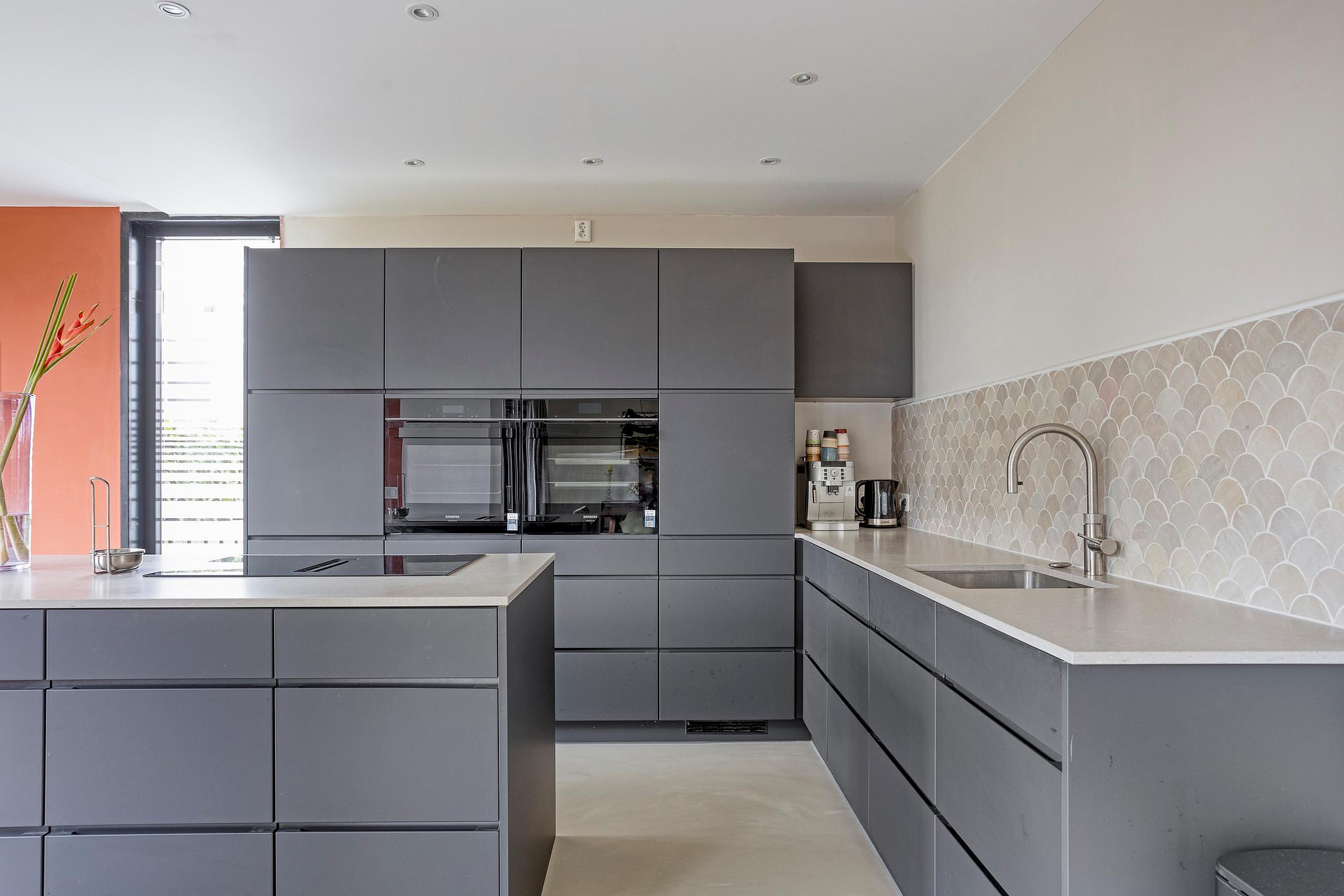 Inbouwapparatuur: Bora kookplaat, koel/vrieskast, vaatwasser, Quooker, oven en combi-oven.