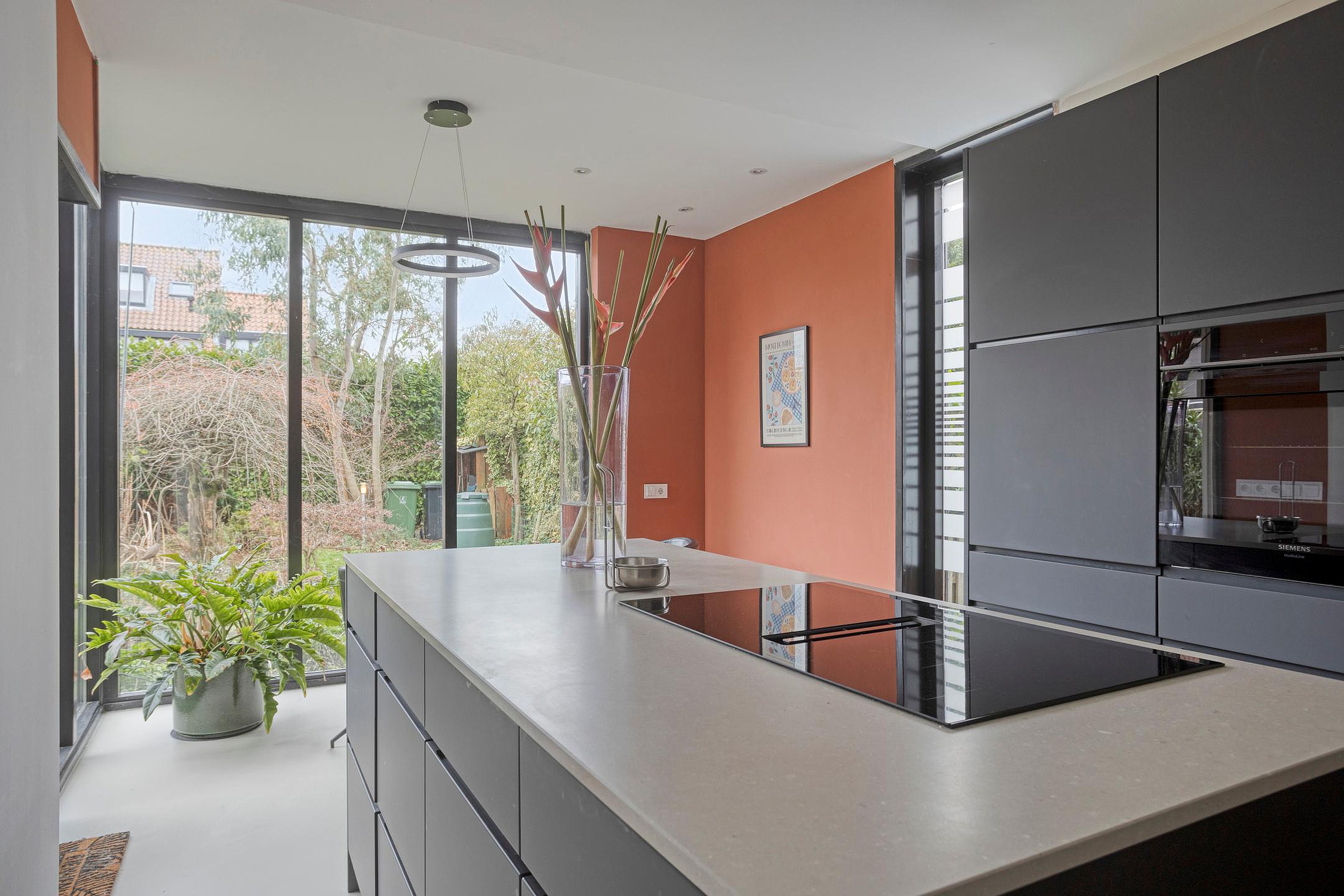 Het kookeiland vormt het hart van de ruimte. Vanuit de keuken ook leuk contact met de tuin.