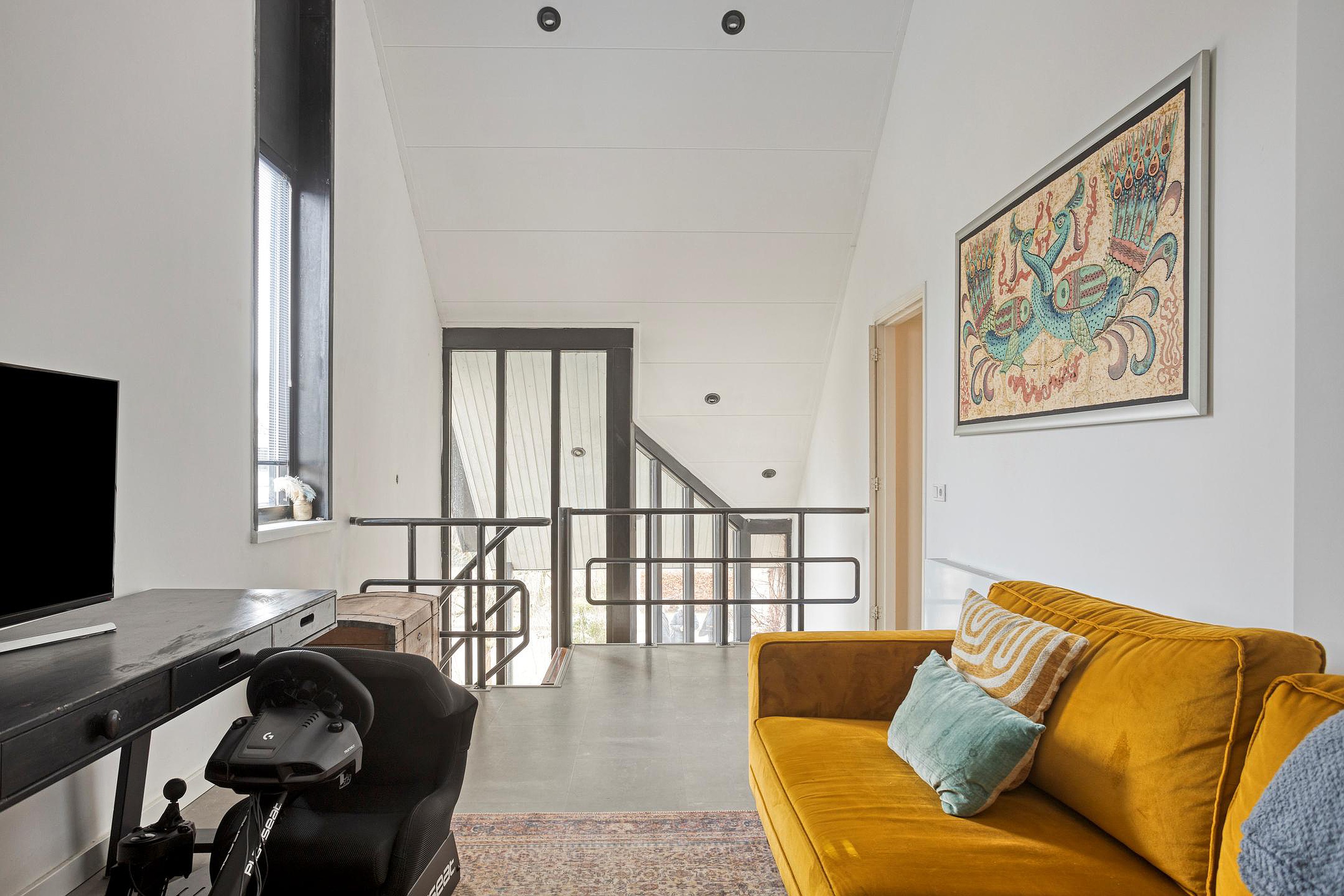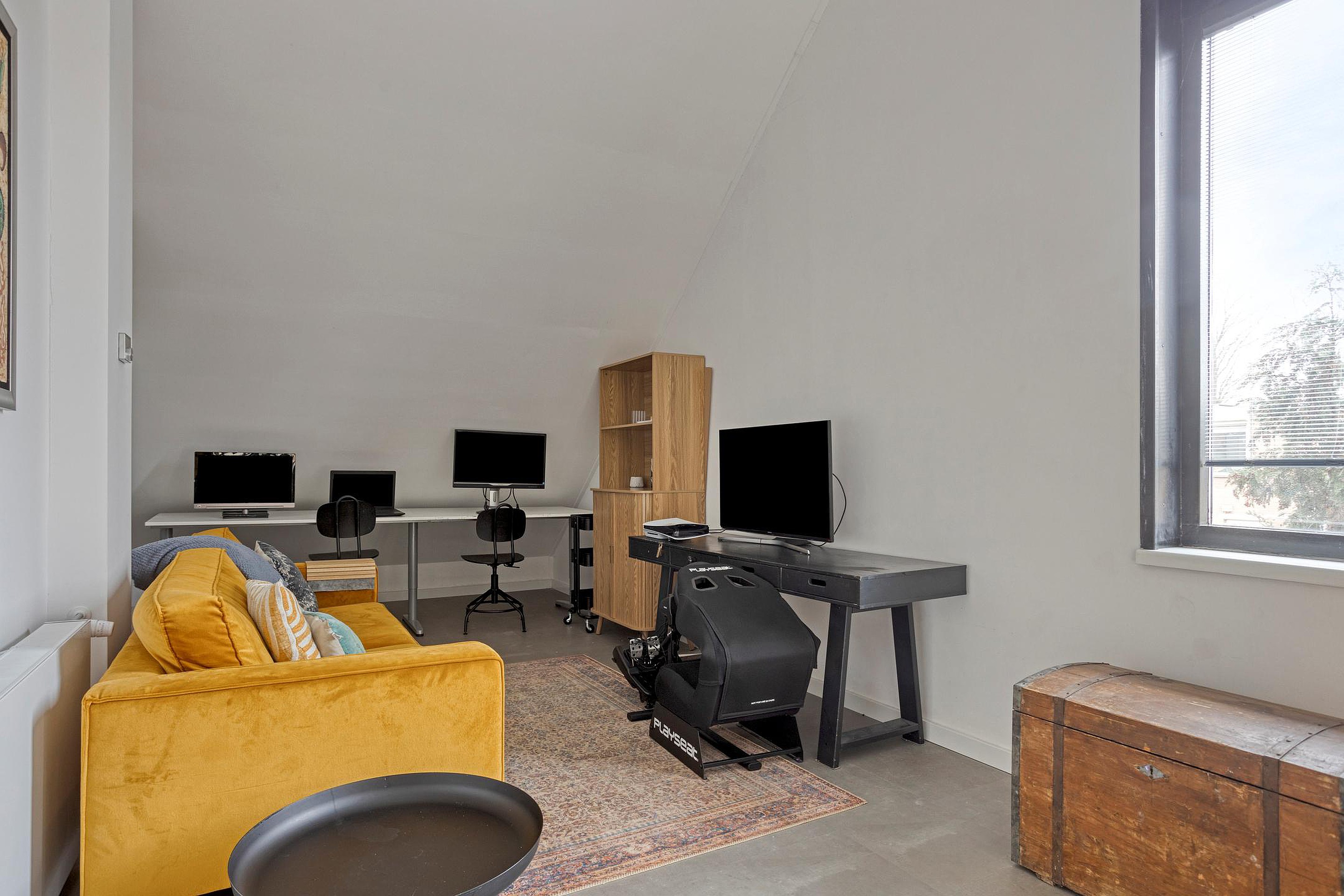 Als je via de spiltrap boven komt, ontdek je een verrassende ruime vide (ca. 5.00 x 3.26m) Deze ruimte is nu ingericht als speelkamer / chill room. Maar kan natuurlijk ook als kamer of kantoor worden ingericht.