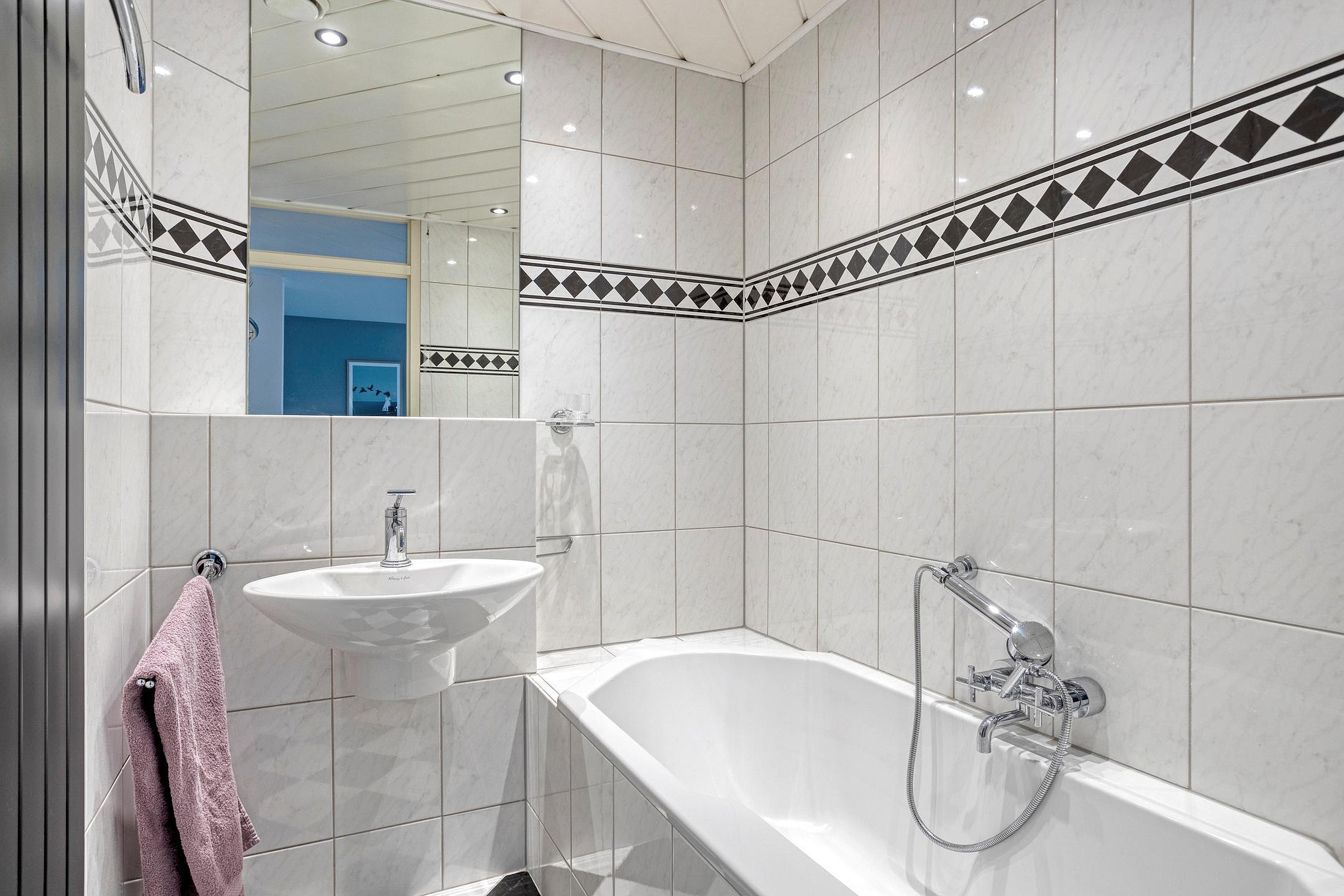 Verzorgde badkamer met ligbad en wastafel. Zwart-wit geblokte vloertegels en witte wandtegels.