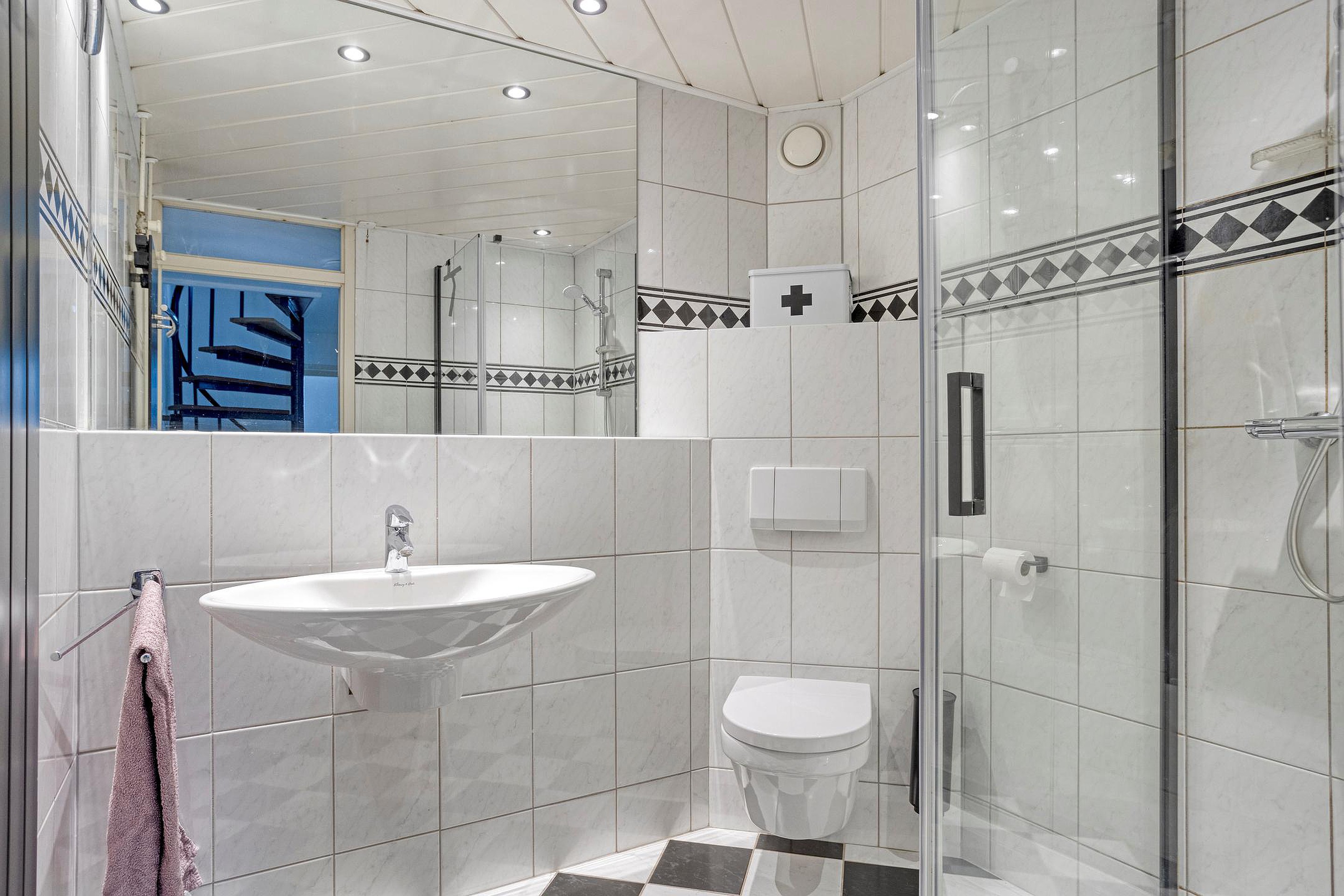 Badkamer 1, bereikbaar vanaf de overloop. Gemoderniseerde badkamer met douchecabine, wastafel en toilet. Zwart-wit geblokte vloertegels en witte wandtegels.