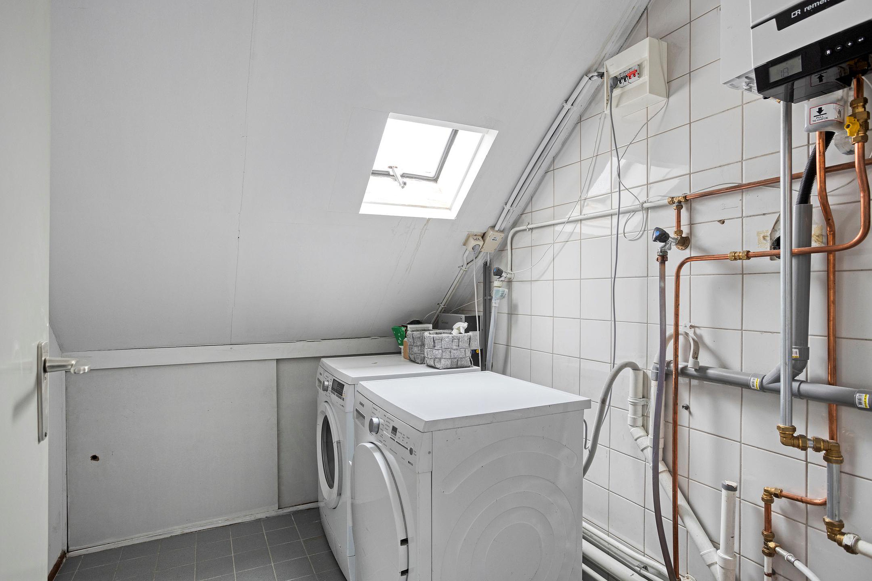 Handige, afsluitbare wasruimte met aansluitingen voor wasmachine en wasdroger. Opstelling cv combiketel.
