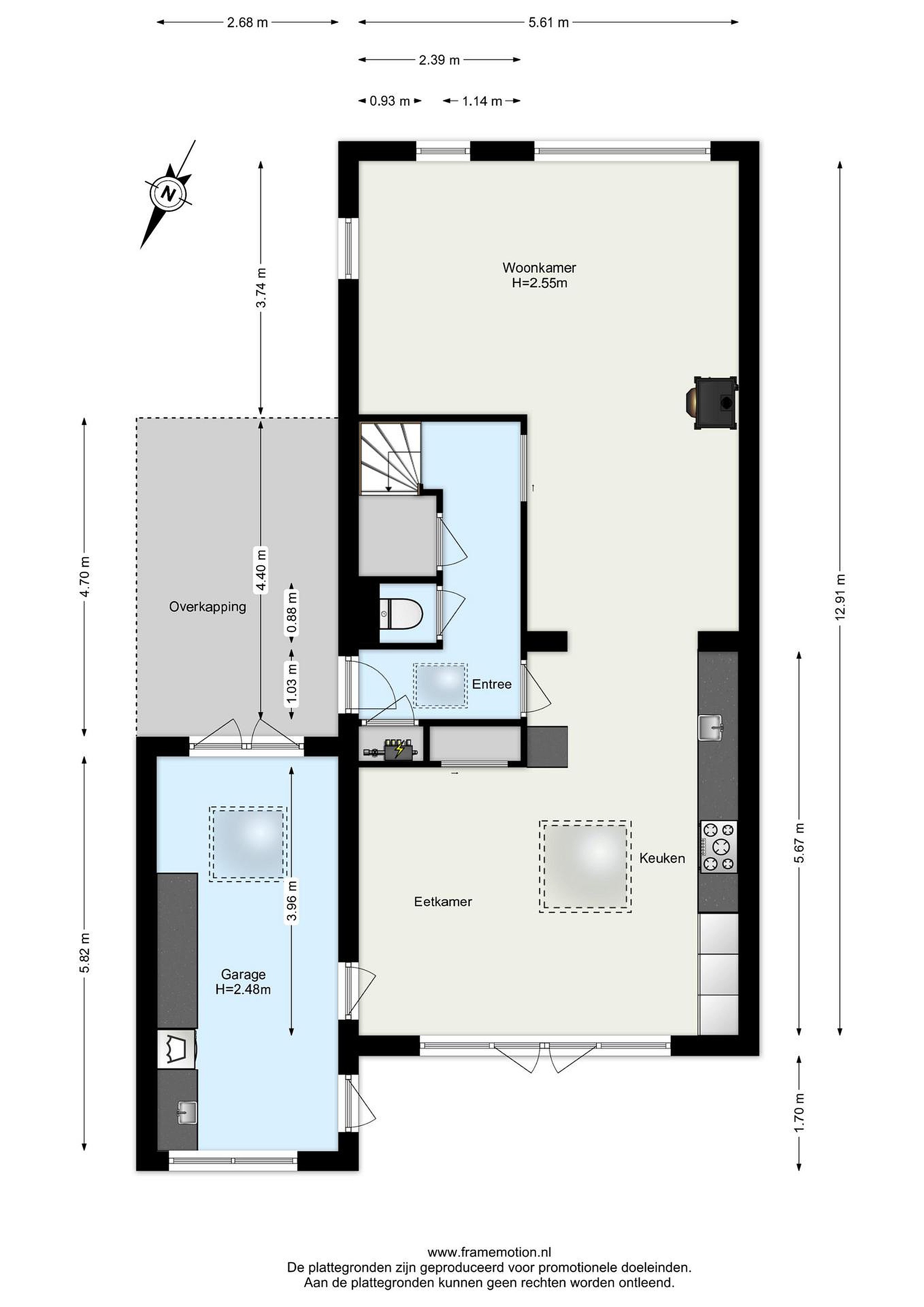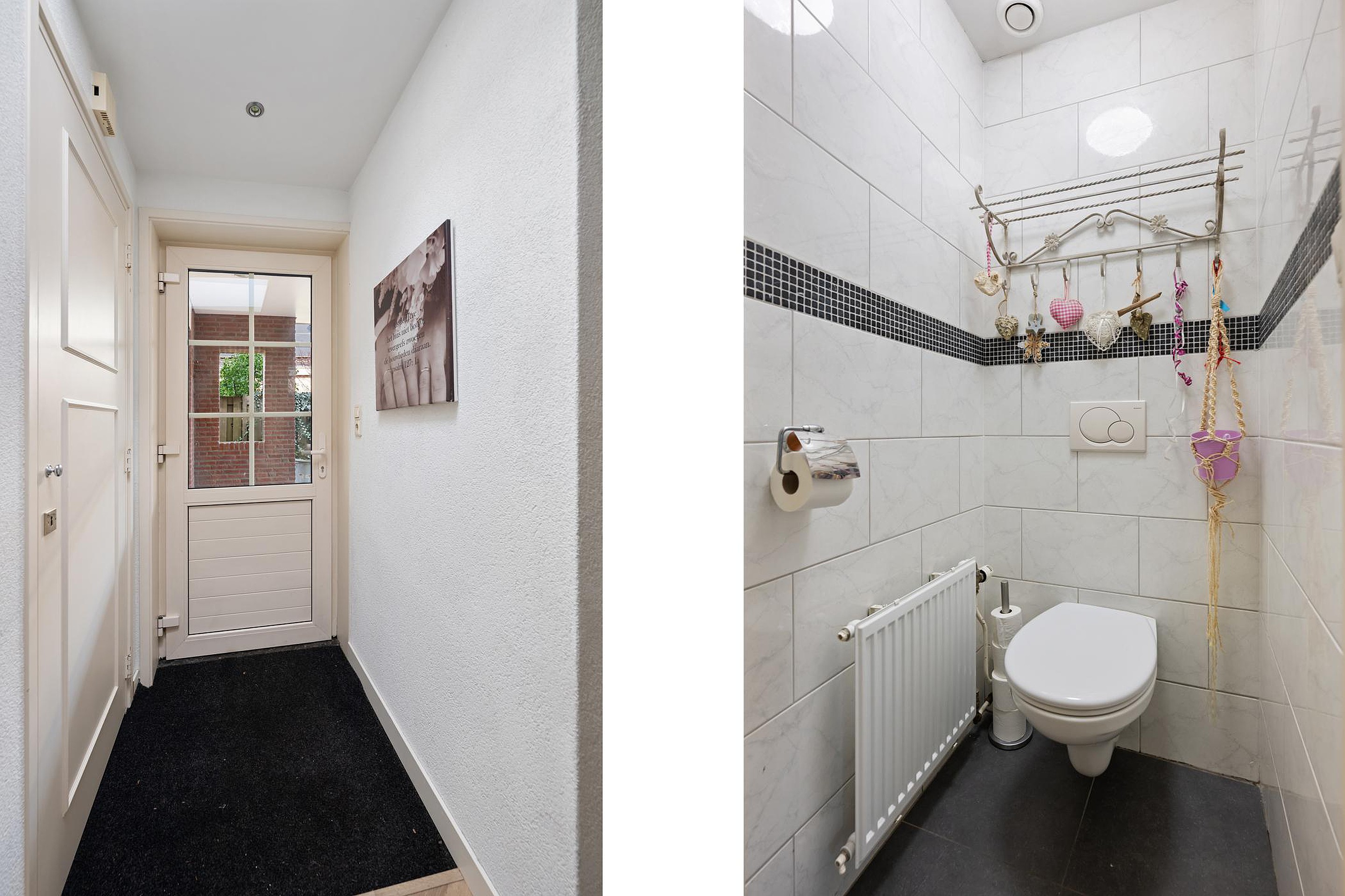Overdekte entree. Deur aan zijkant van de woning. Ruime gang met meterkast, toilet, bergkast en trap naar de verdieping; Toegang naar de woonkamer en toegang naar de woonkeuken.