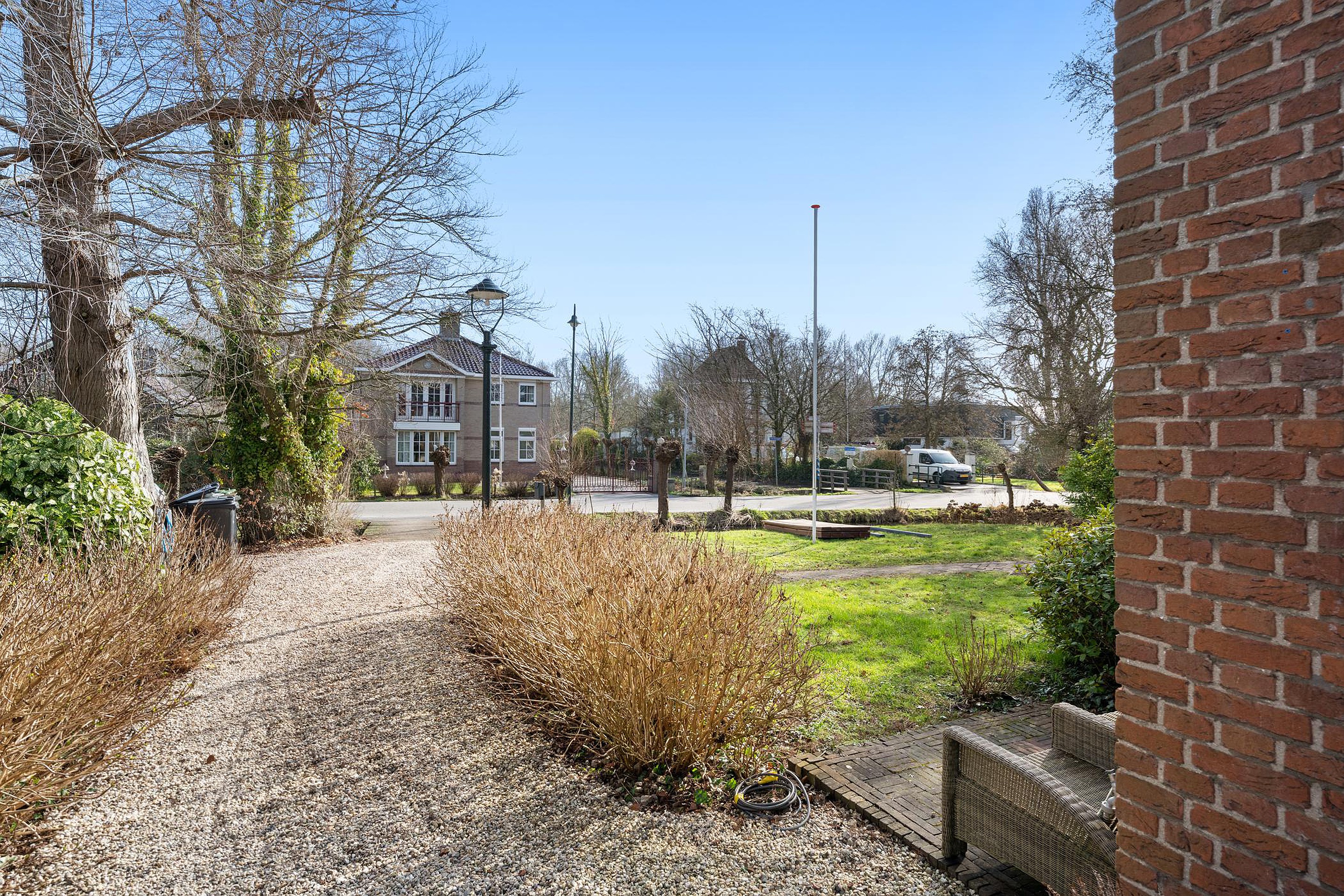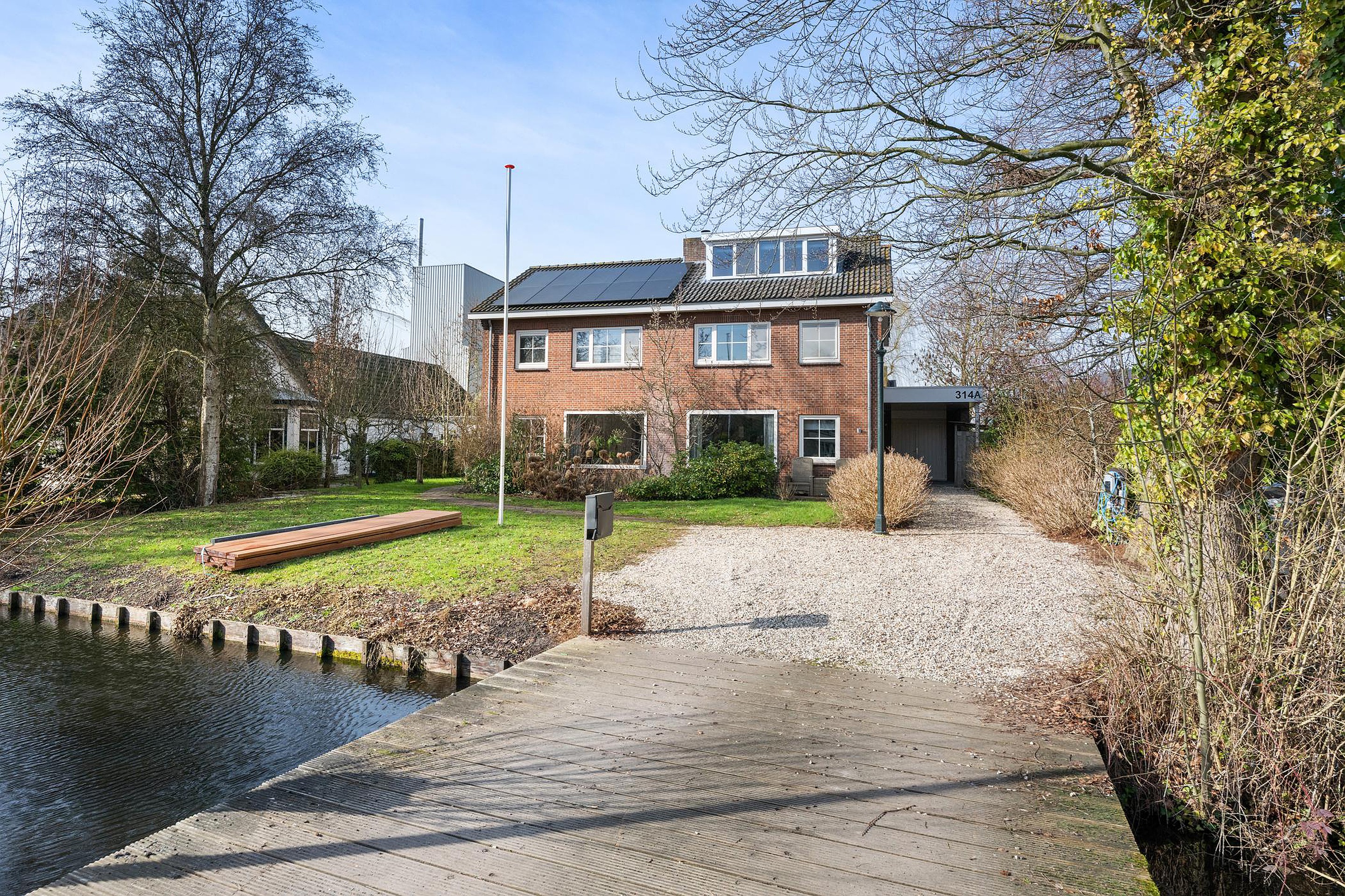Het huis ligt mooi midden op het perceel. Aan de voorzijde is er een eigen brug en voldoende ruimte voor het parkeren van 2 auto's. De voorzijde is ingericht met grind, gras en diverse struiken. Tegen de gevel is ruimte voor een gezellig zitje.