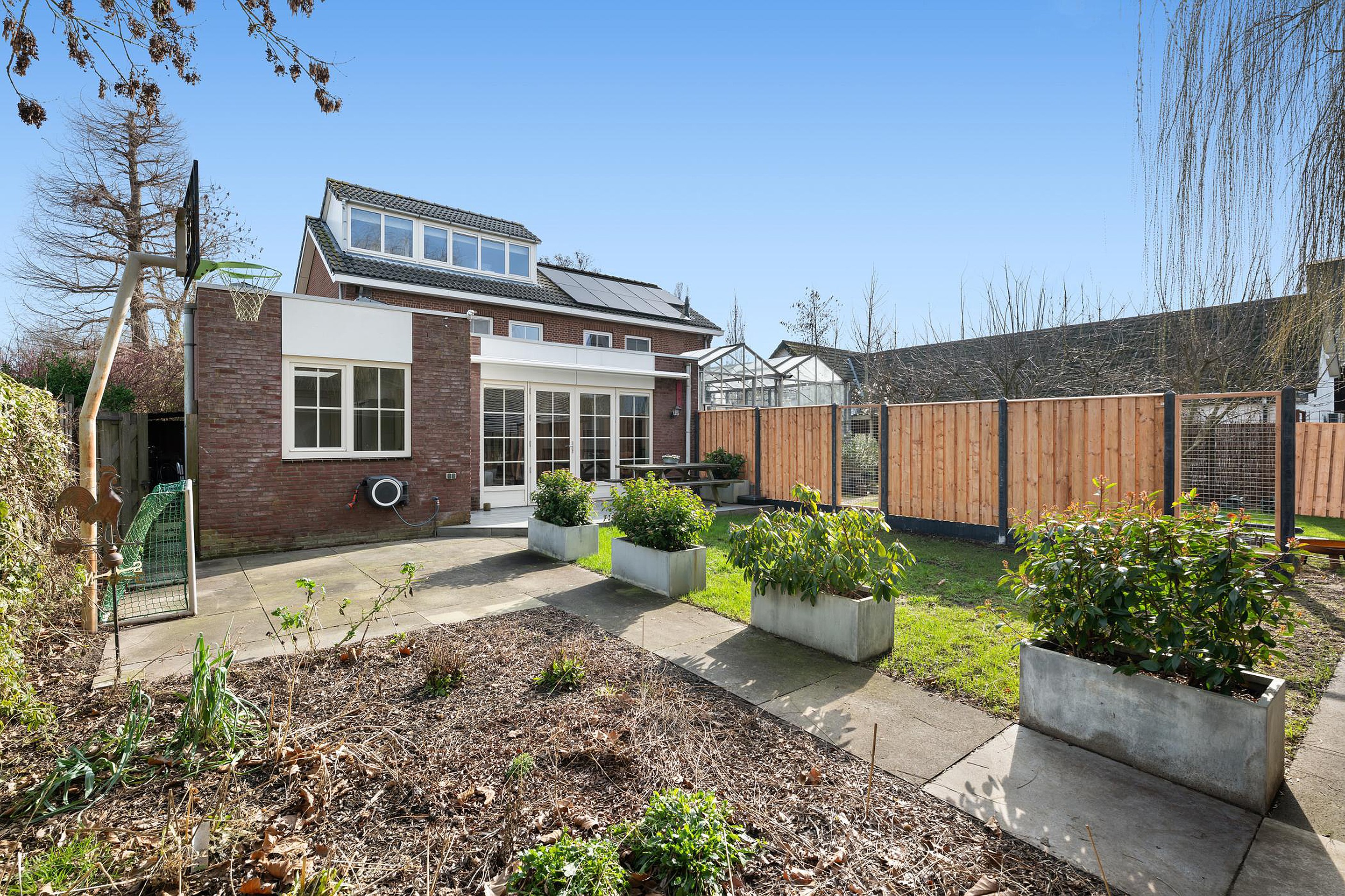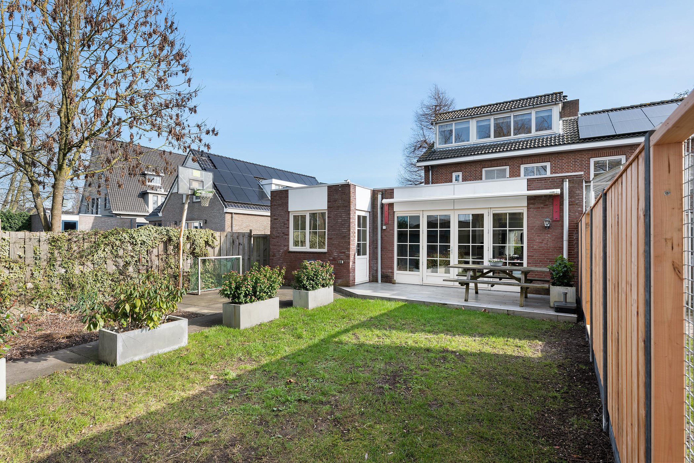Heerlijke achtertuin met véél vrijheid en privacy. De tuin heeft een goede zonligging. De houten overkapping is een fijn plekje om te genieten. In de voortuin is voldoende ruimte om 2 auto's te parkeren.