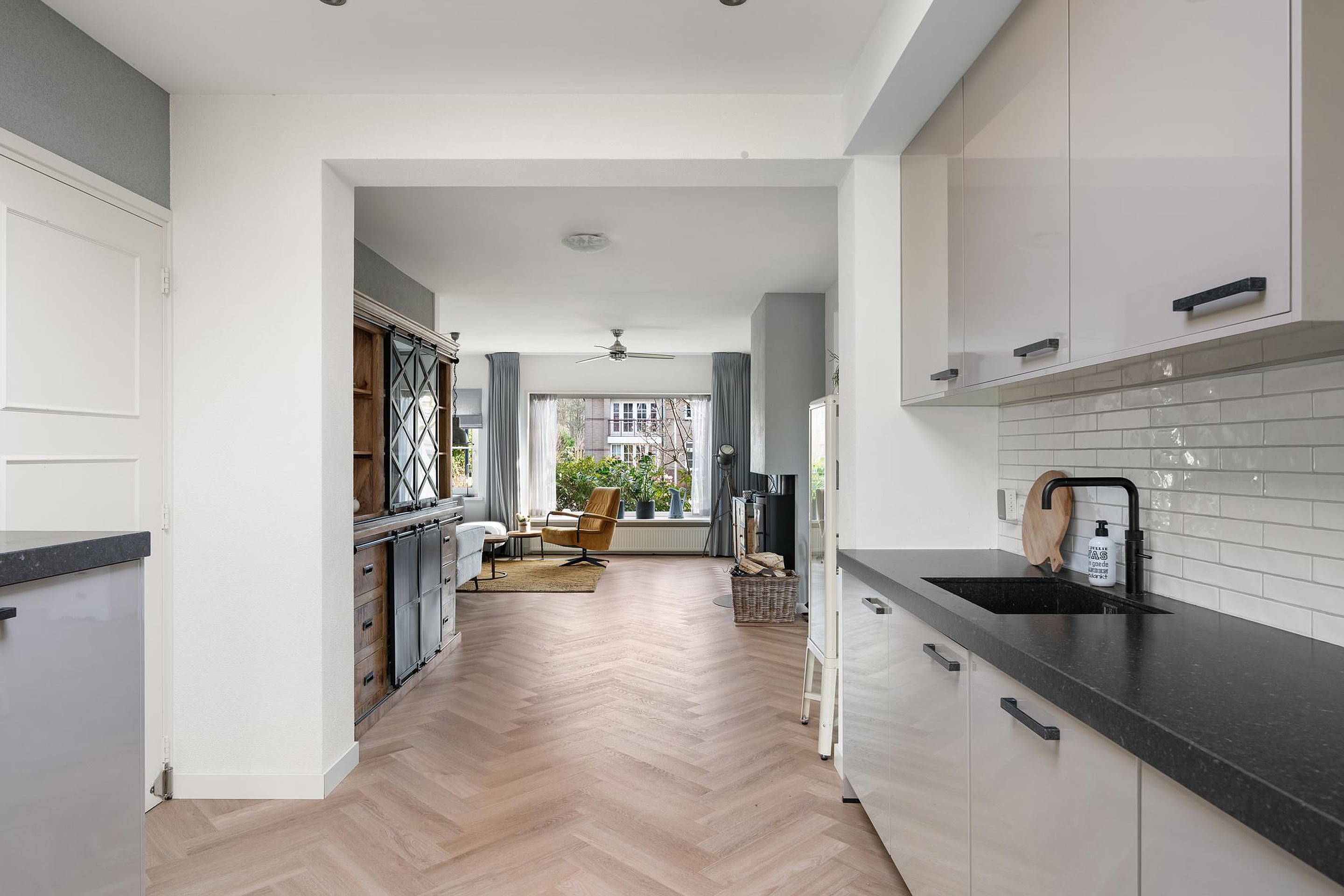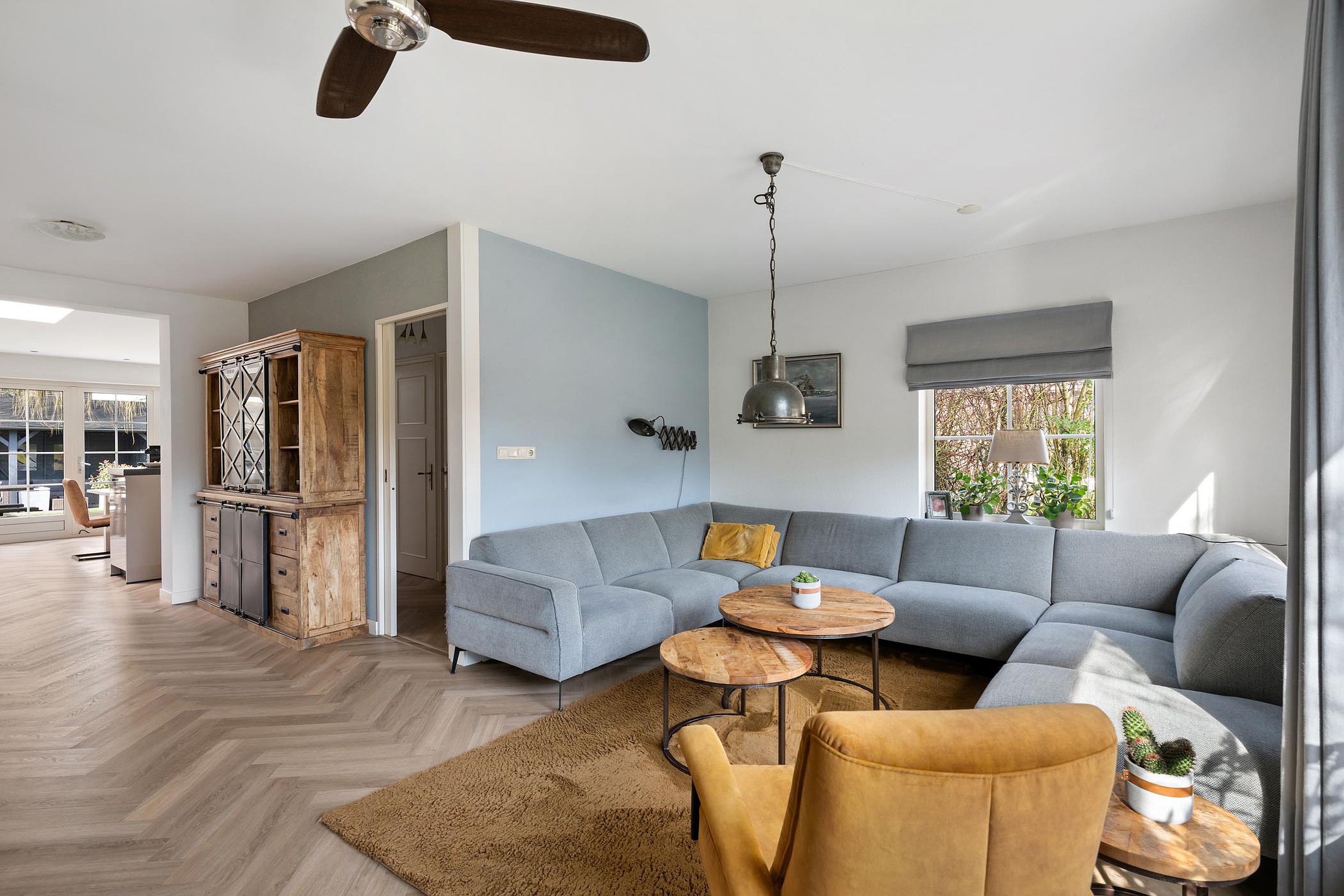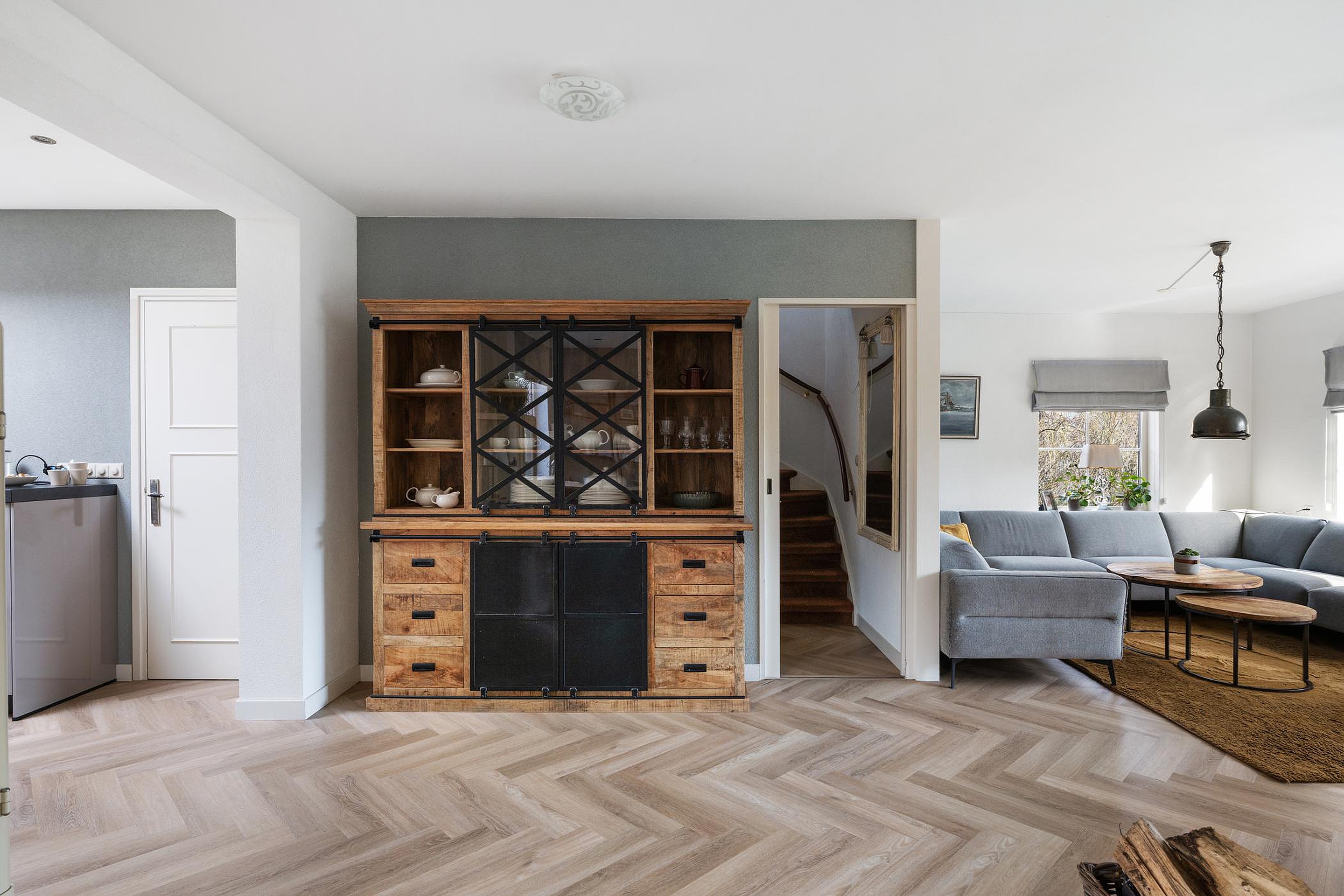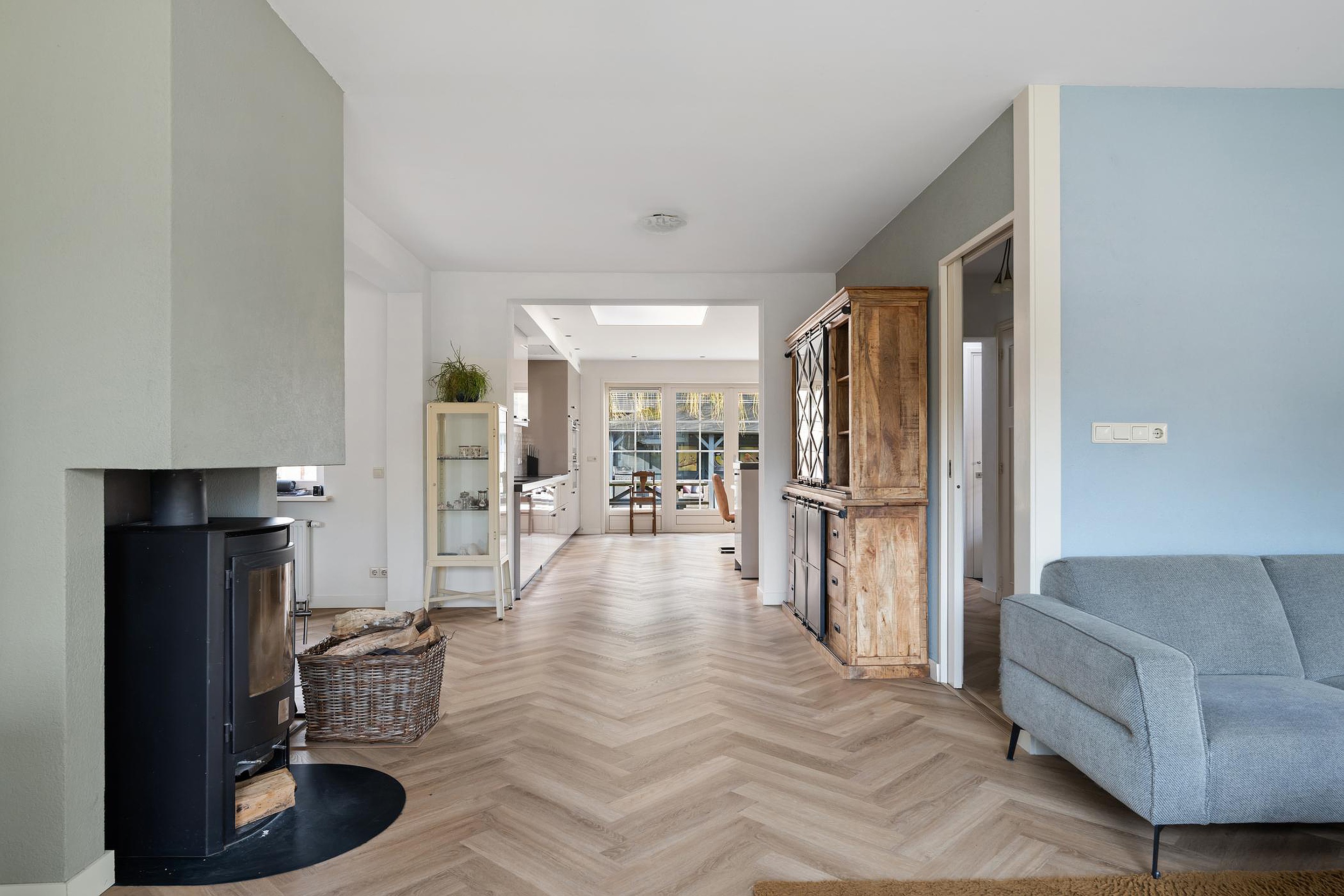 In de hal, woonkamer, woonkeuken én bijkeuken ligt een moderne eiken visgraat pvc vloer.