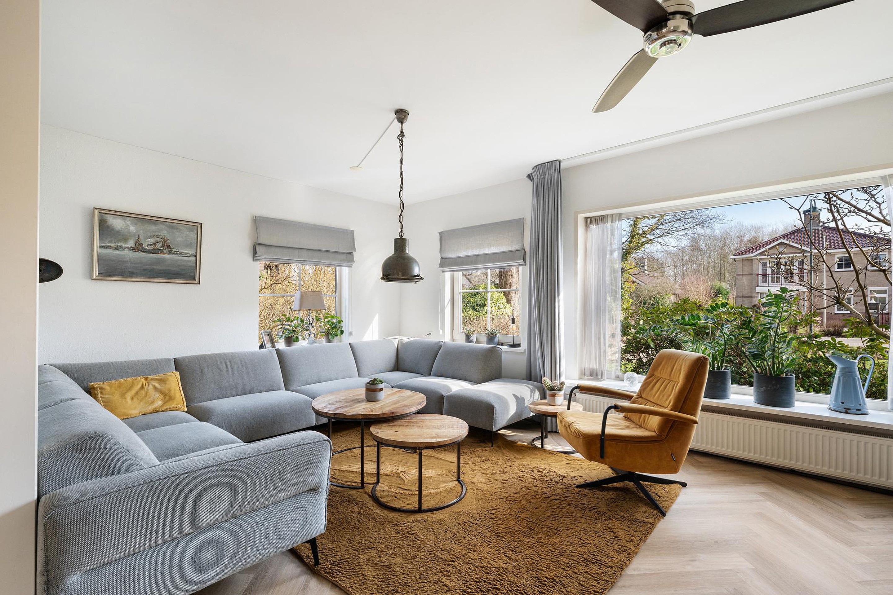 De brede kunststof pui zorgt ervoor dat je veel contact met 'buiten' ervaart. Openslaande deuren naar terras en tuin.