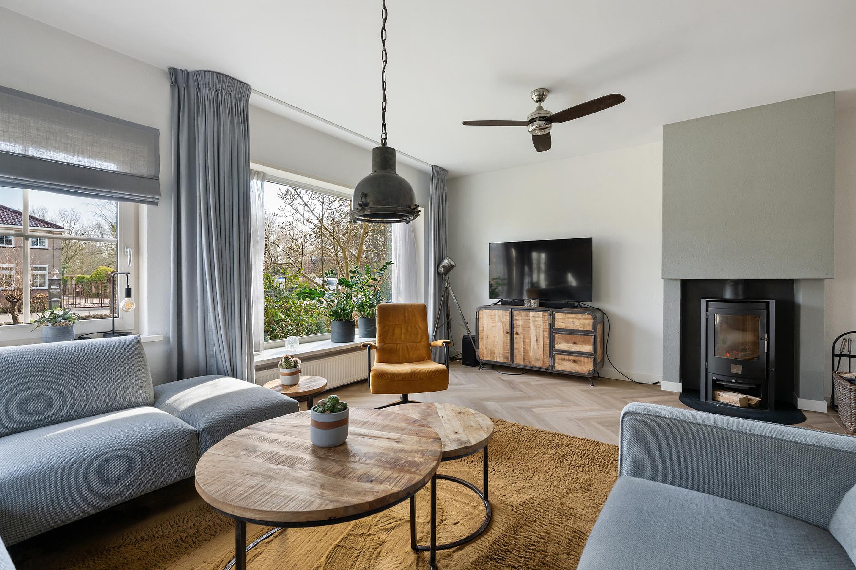 De gezellige houtkachel vormt het middelpunt van de lichte woonkamer. Vanuit de woonkamer leuk uitzicht!