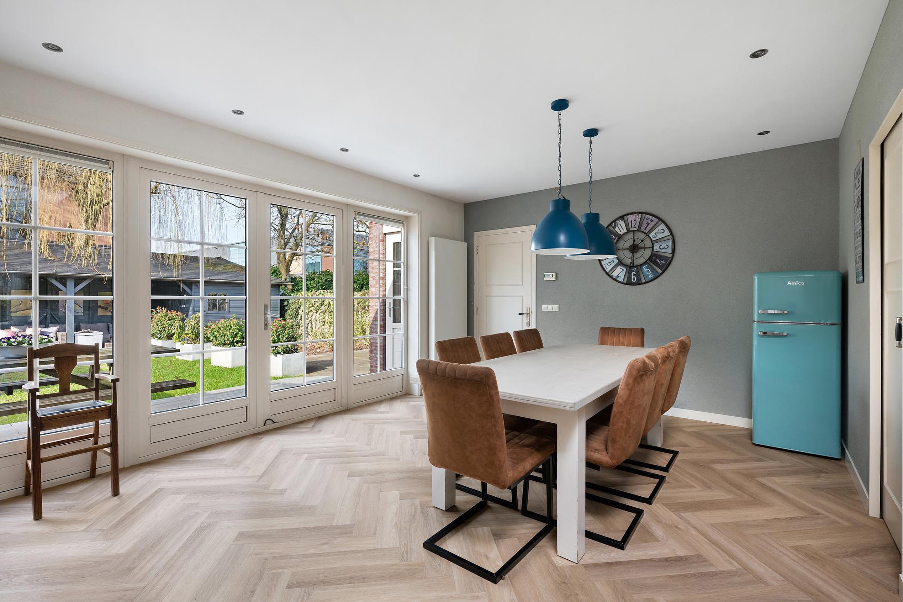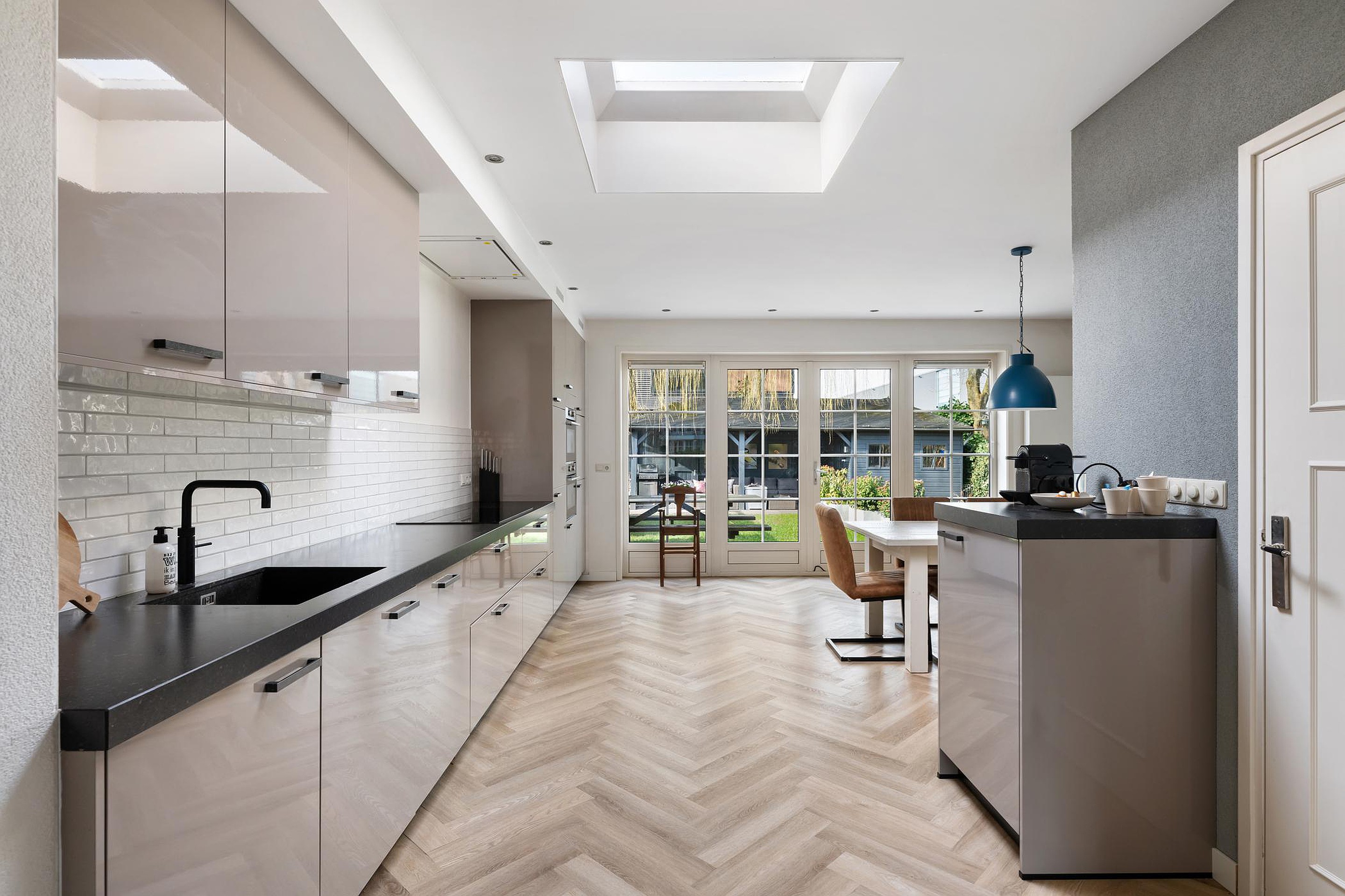 Als je woonkeuken binnenstapt, word je aangenaam verrast door de fijne lichtinval en de mooie ruimte die je krijgt. In 2002 is het huis namelijk vergroot met een aanbouw van 6 meter over de gehele breedte.