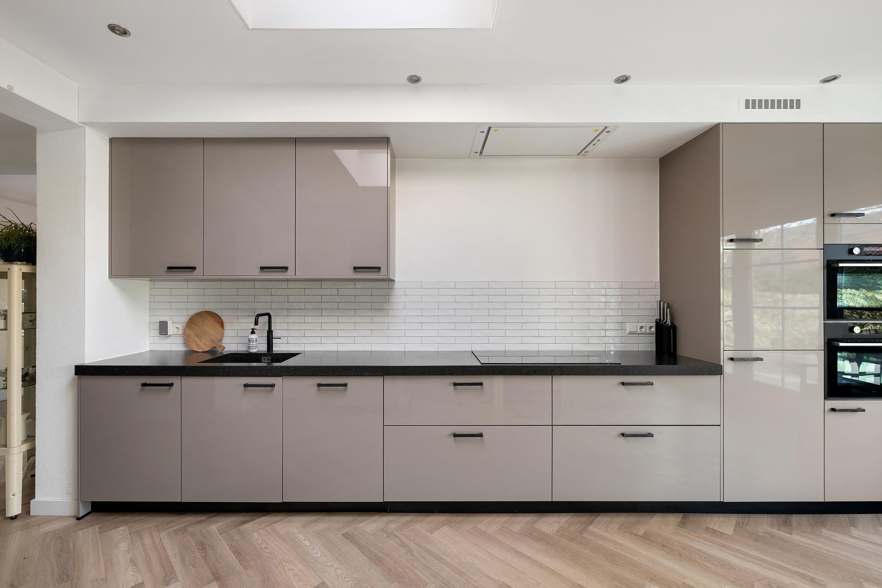 Luxe en compleet uitgevoerde keuken in rechte wandopstelling. Natuurstenen aanrechtblad.