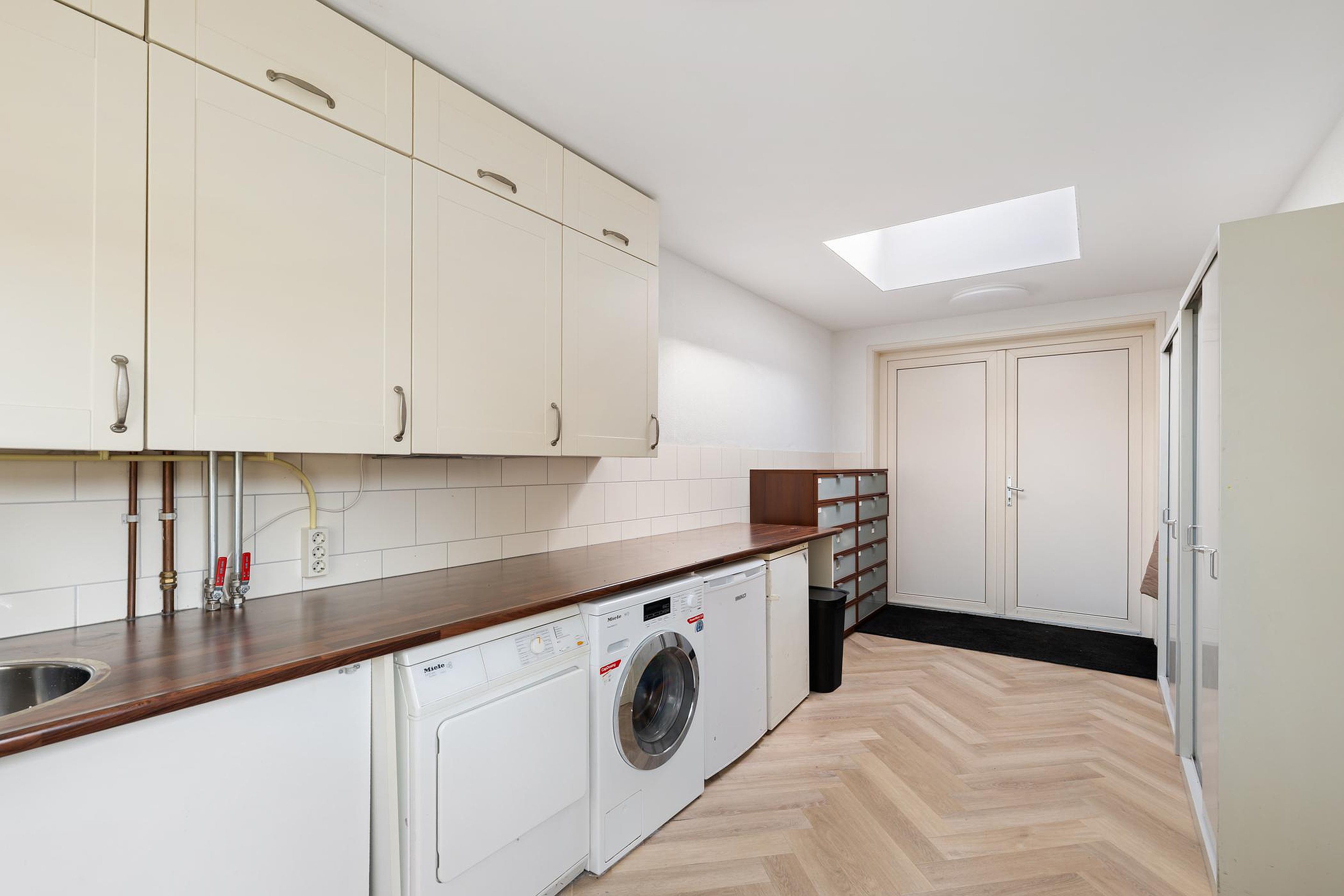 De ruimte is in gebruik als wasruimte met aansluitingen voor wasmachine en droger, bergruimte en stalling.
