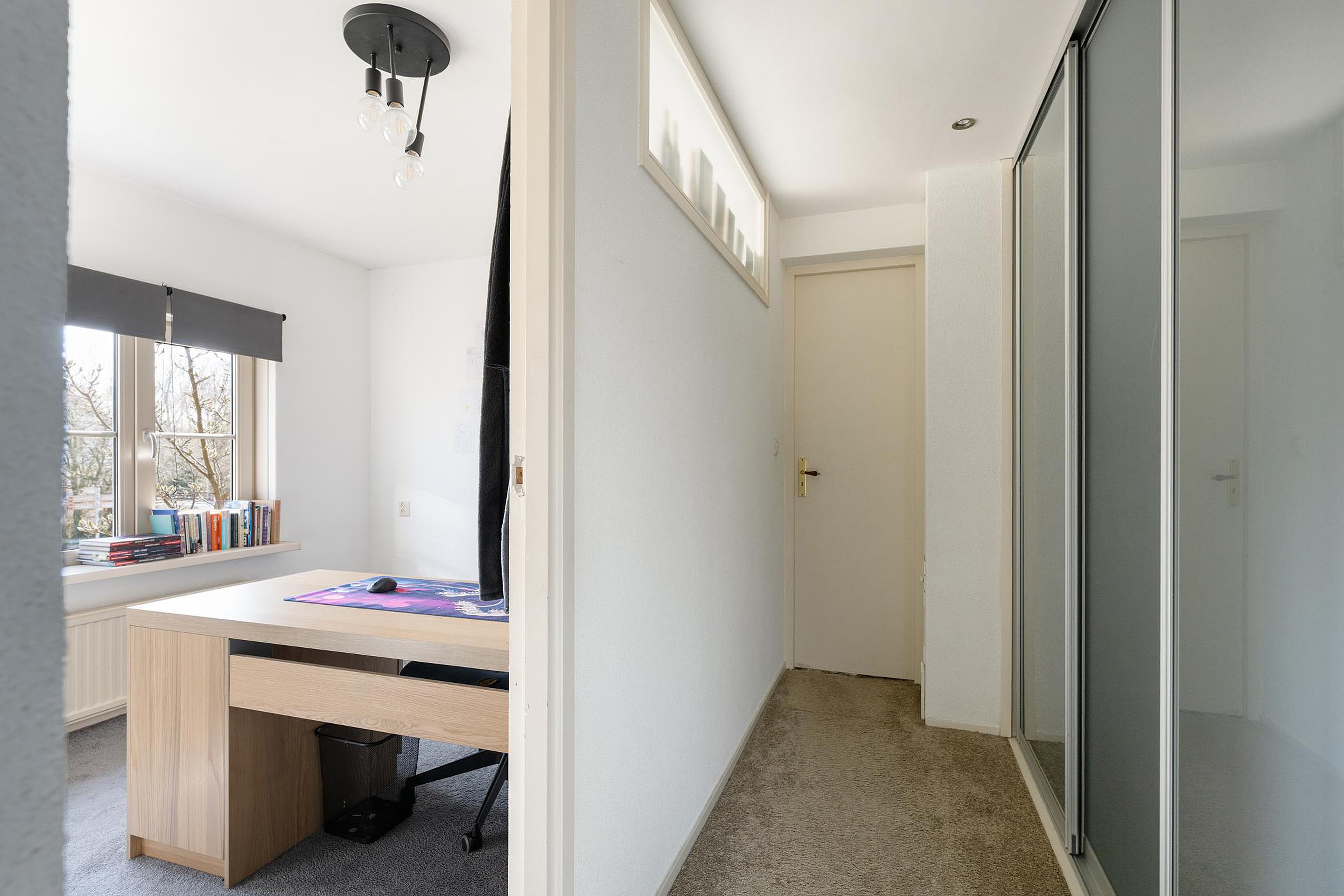 Op de overloop en in de slaapkamers ligt tapijt als vloerbedekking.