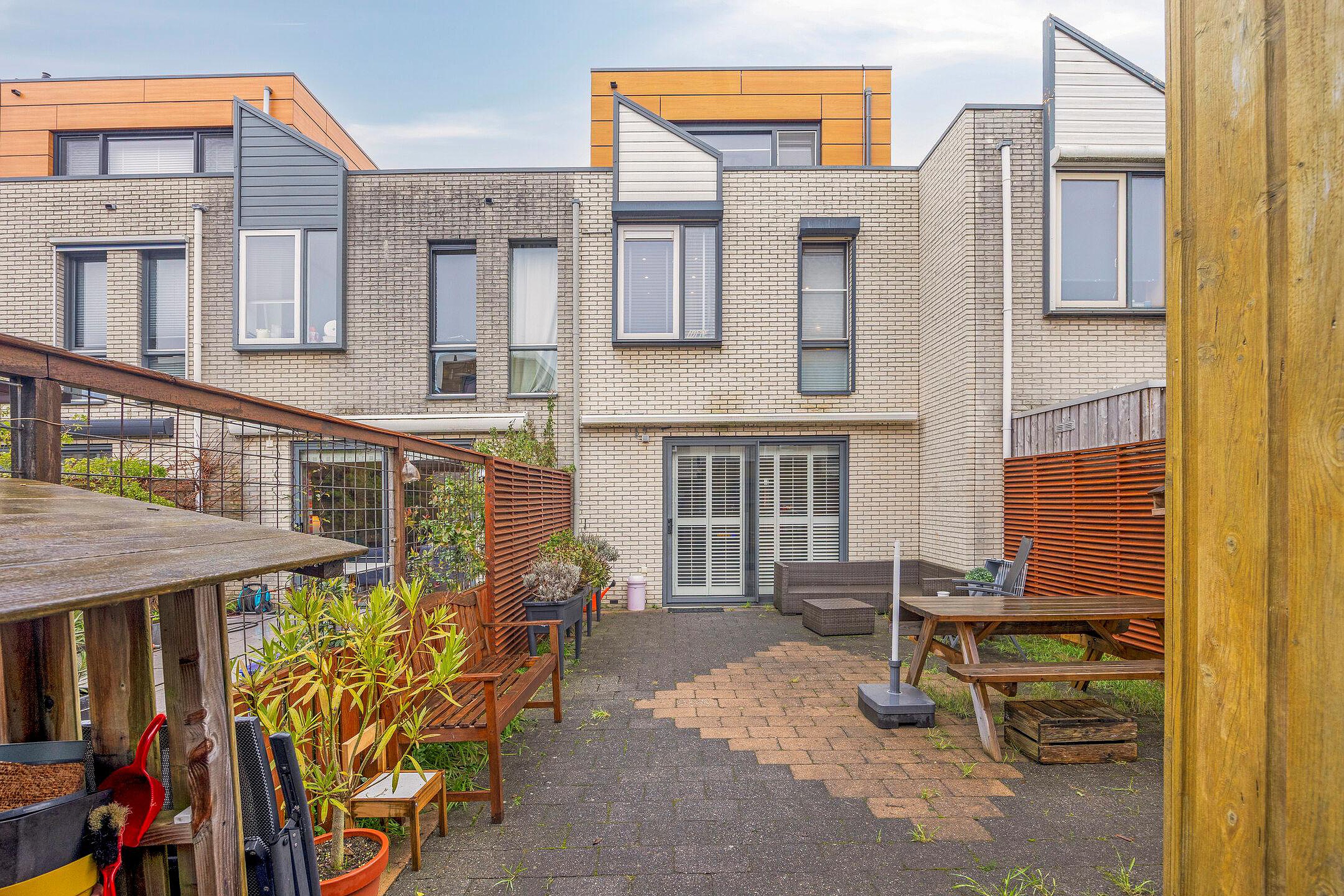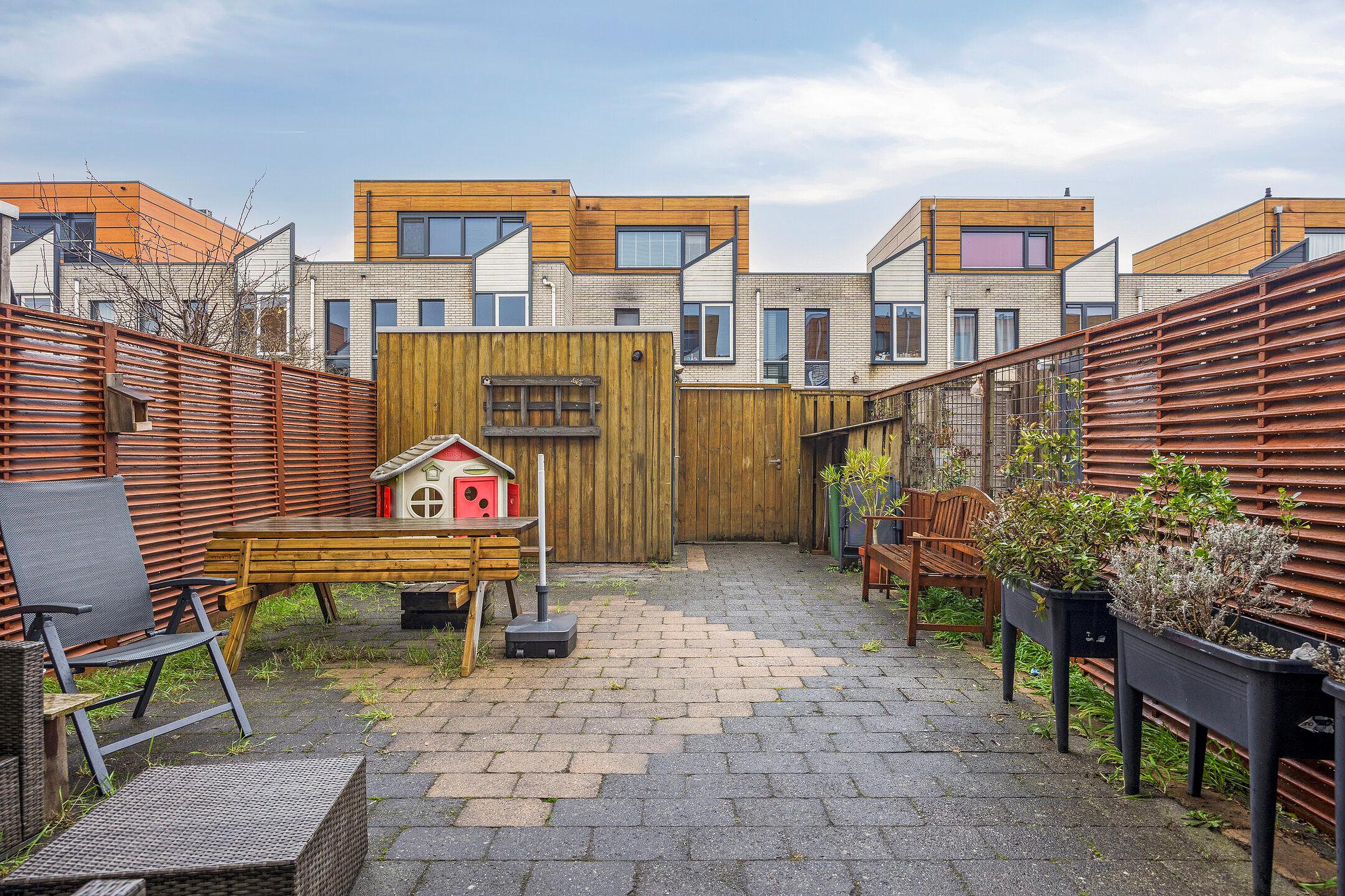 De achtertuin is gelegen op het zuidwesten, waardoor je tot in de avond van de zon kunt genieten. De tuin is voorzien van een elektrisch zonnescherm, een houten berging en een achterom. Een heerlijke plek om te ontspannen, spelen of gezellig te dineren.