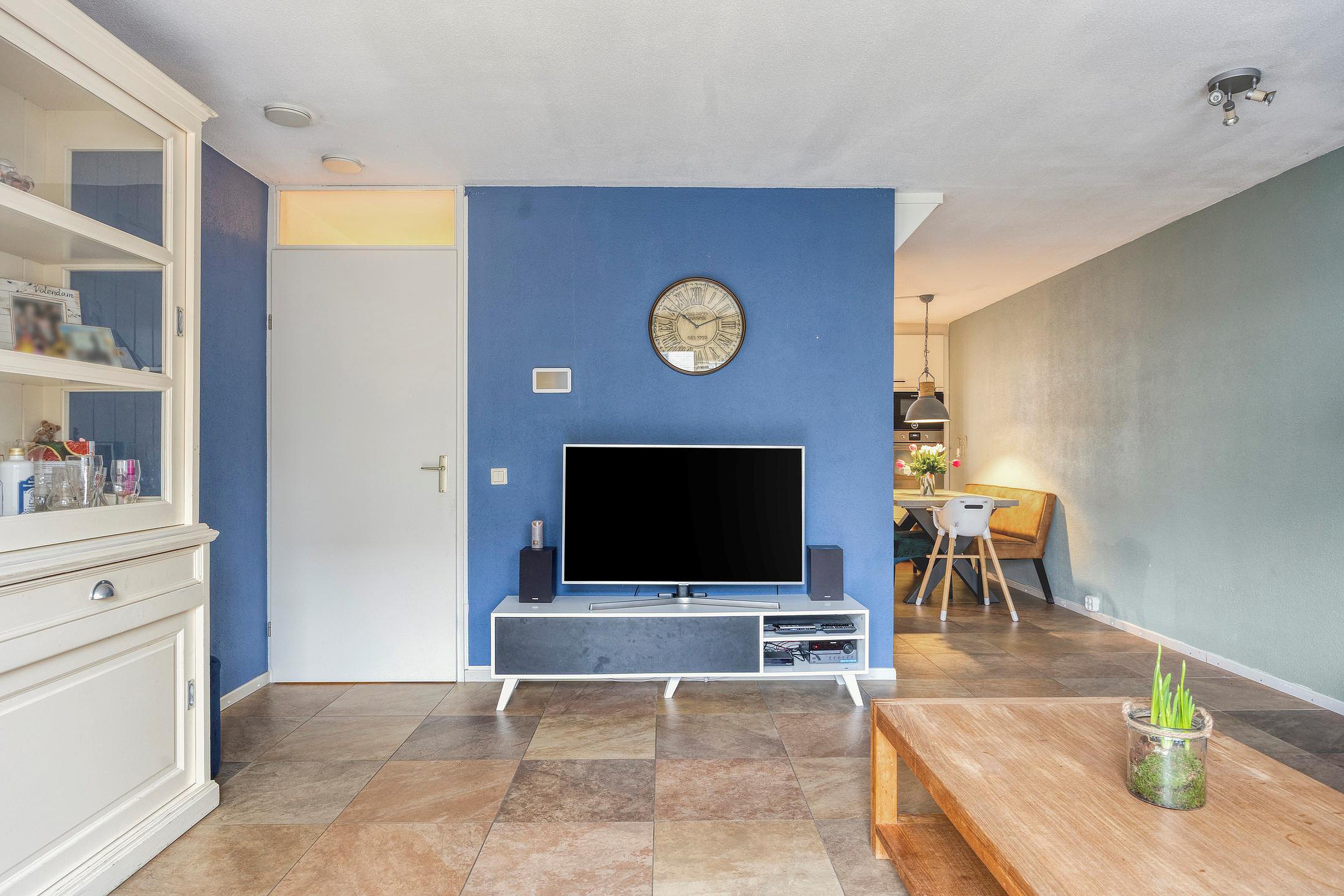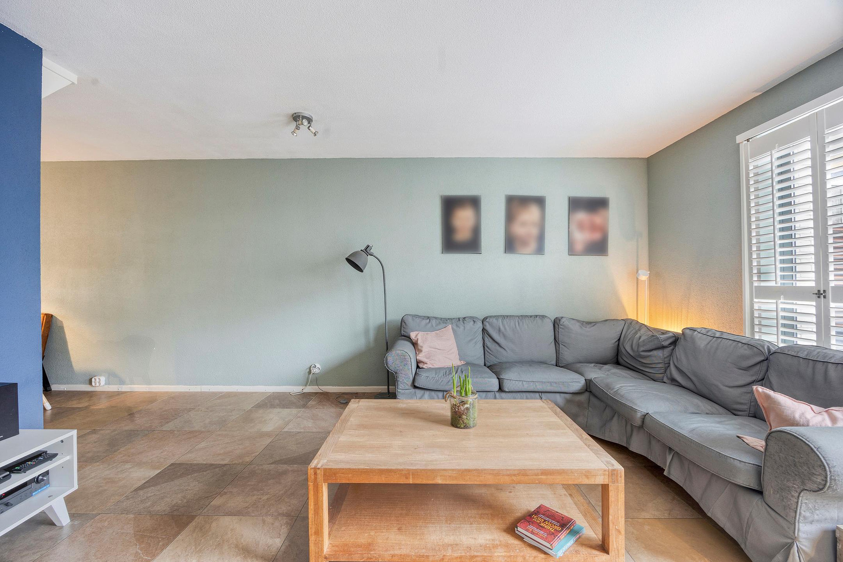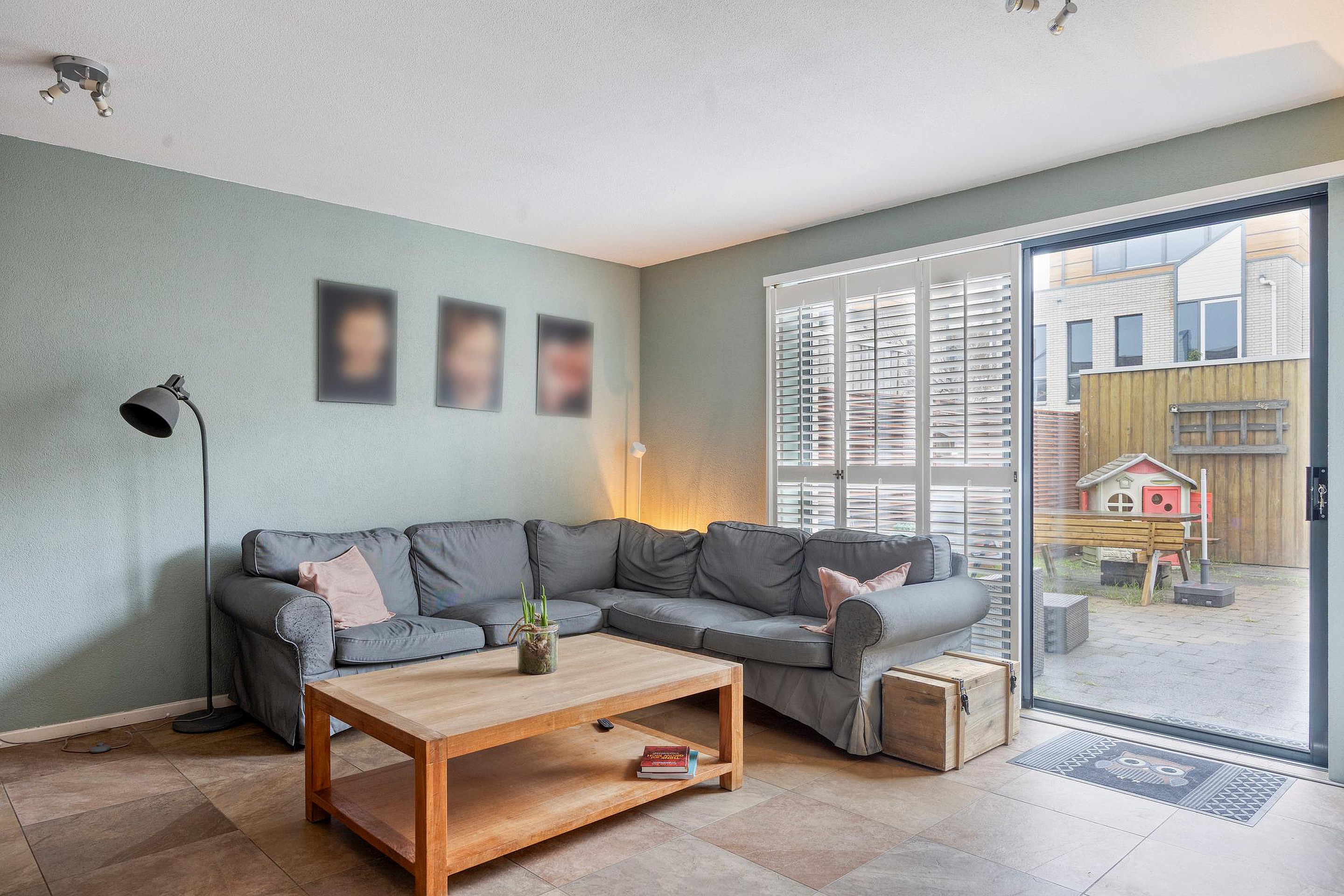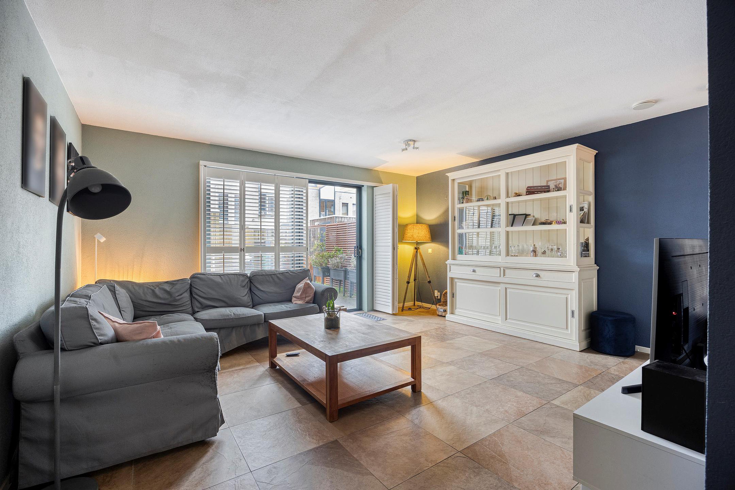 De woonkamer is gesitueerd aan de tuinzijde. De plavuizen vloer is voorzien van vloerverwarming en via de grote schuifpui sta je direct in de zonnige achtertuin. Een fijne leefruimte met een prettige verbinding tussen binnen en buiten.