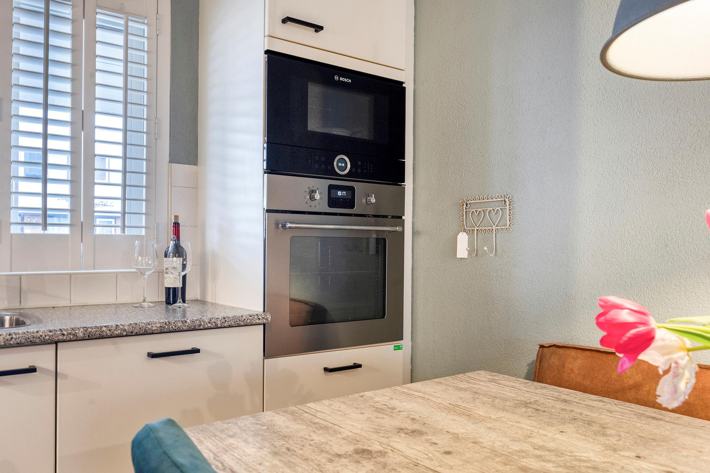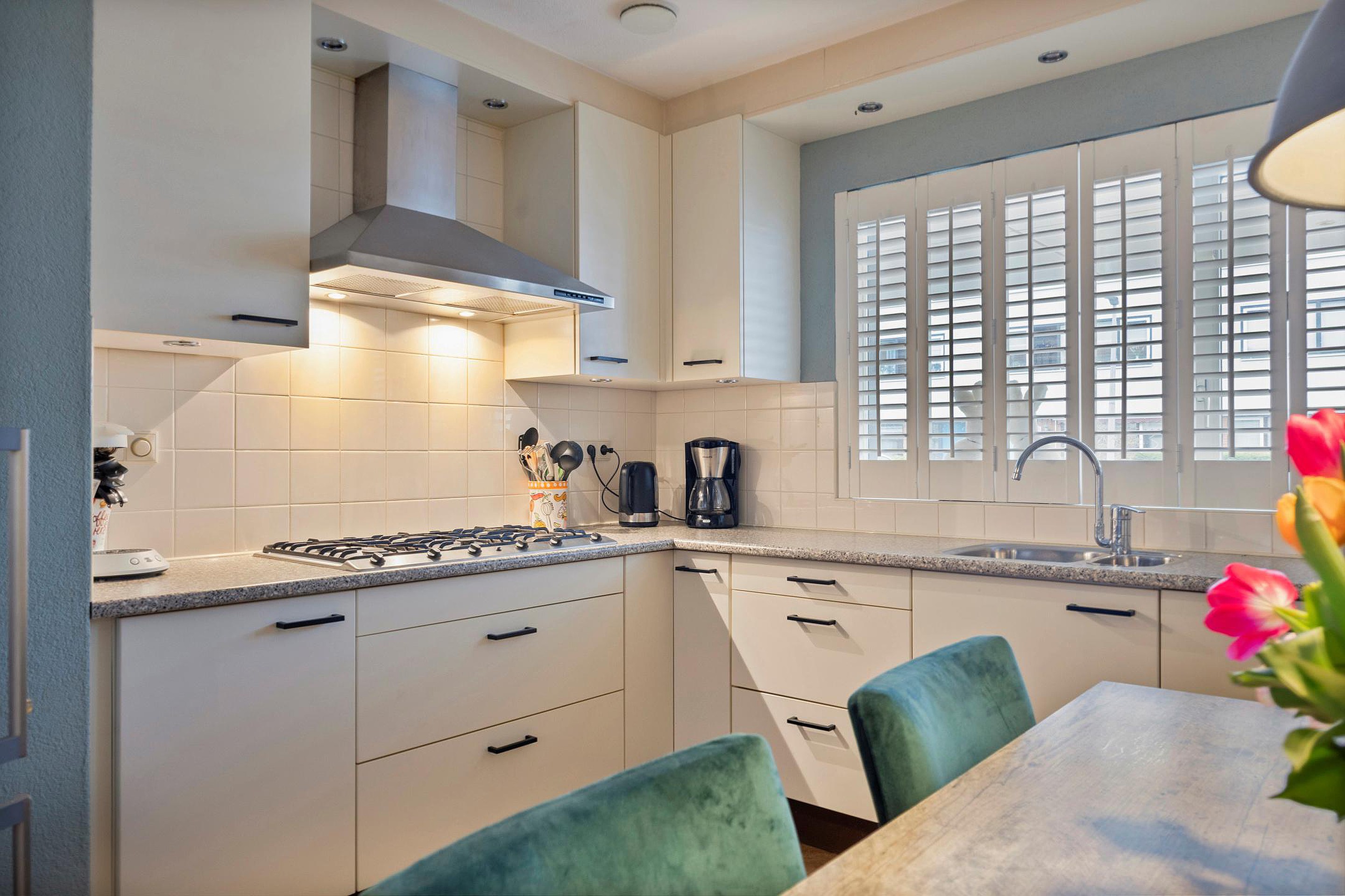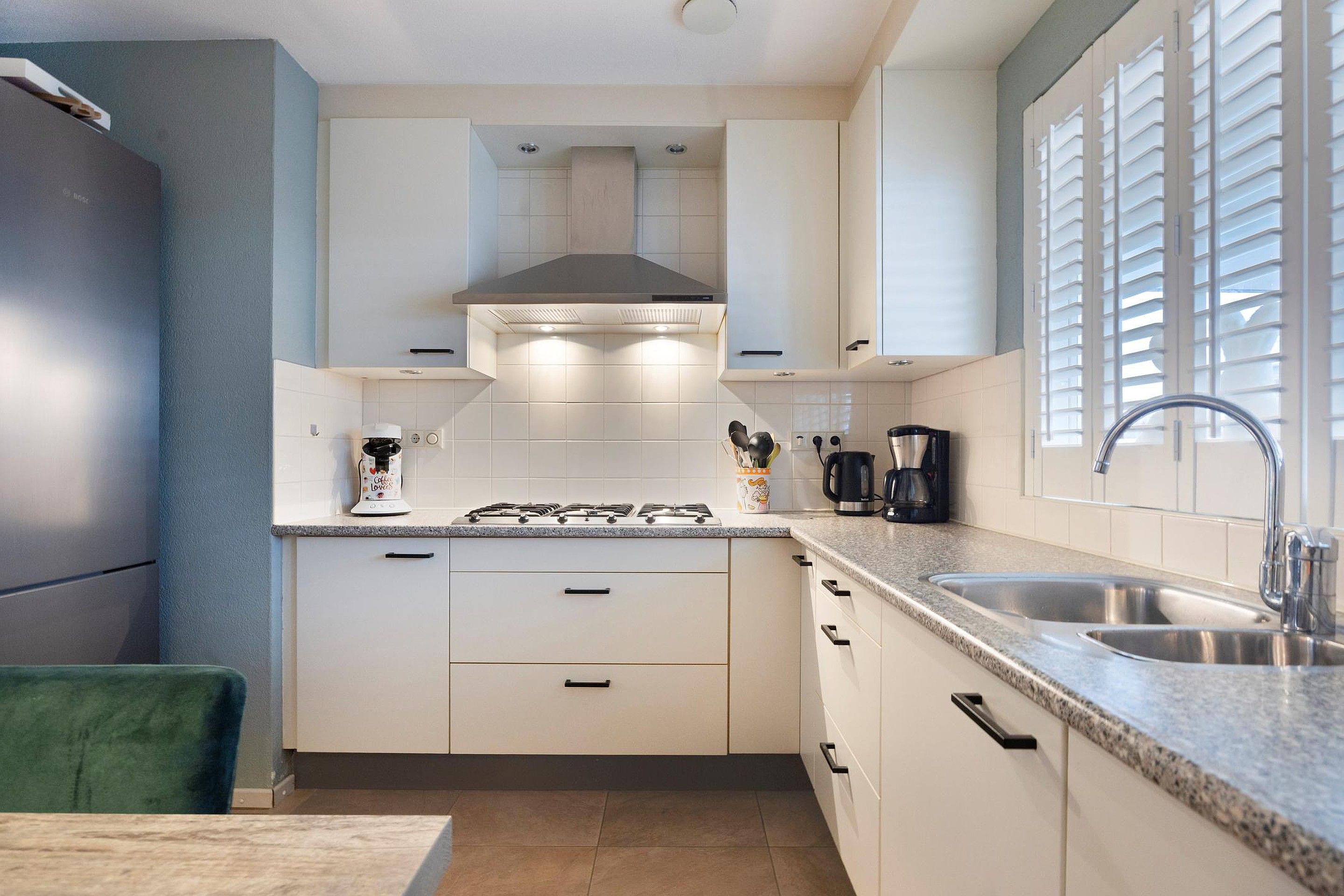 Aan de voorzijde van de woning bevindt zich de keuken, uitgerust met een oven, magnetron, vaatwasser, 6-pits gasfornuis met afzuigkap en volop kastruimte. Extra praktisch is de voorraadkast onder de trap, ideaal voor provisie en keukenapparatuur.