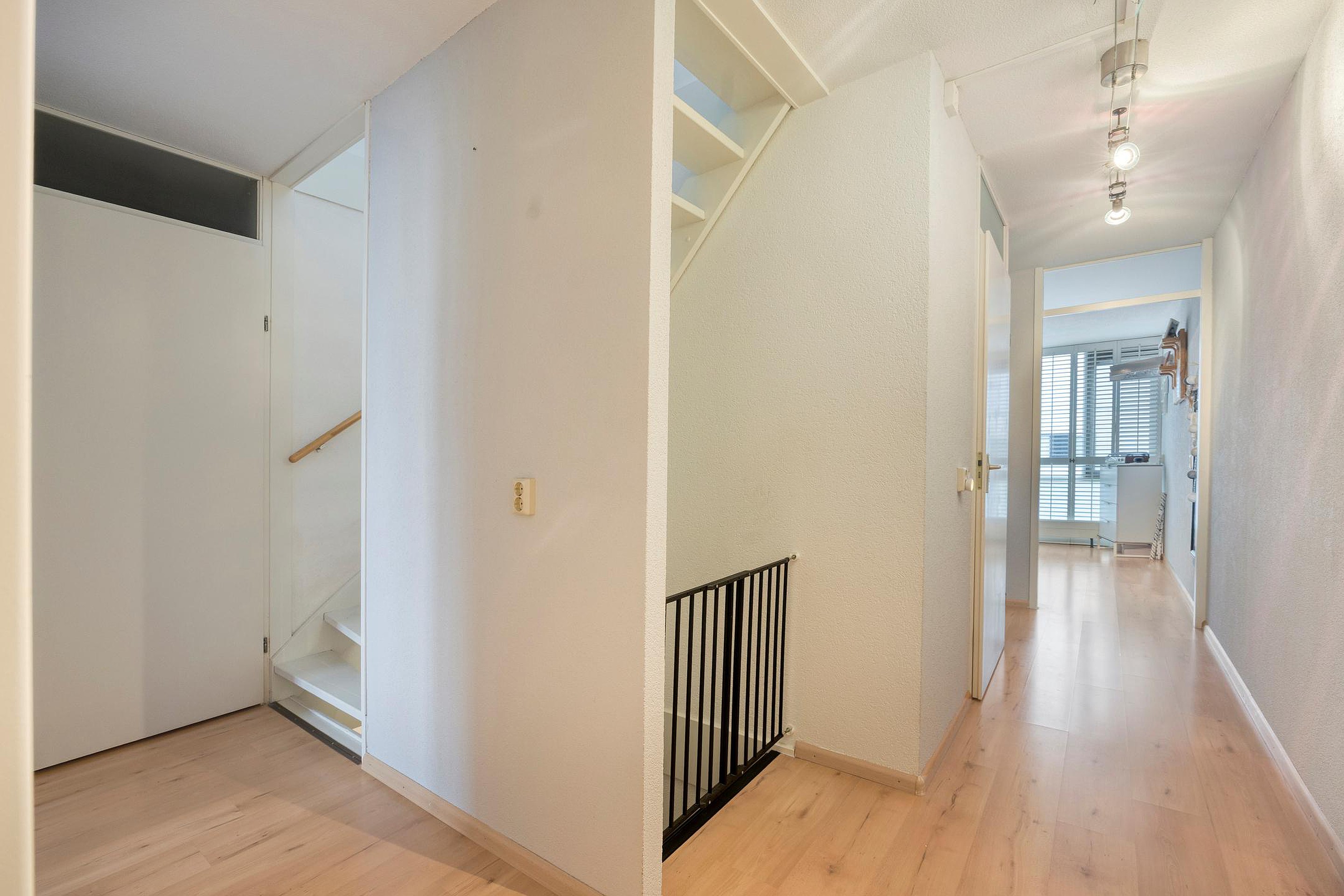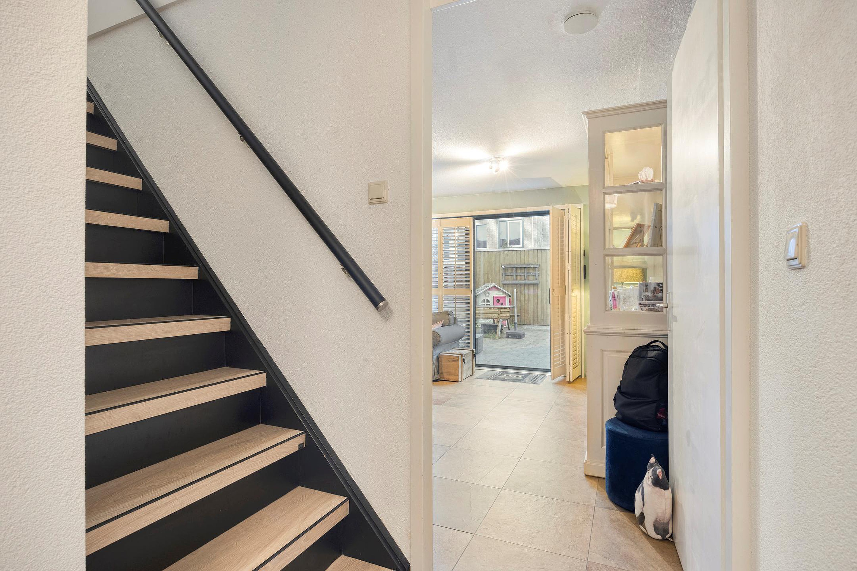 Via de ruime hal met meterkast, praktische schoenenkast en toiletruimte bereik je de woonkamer. De hal geeft tevens toegang tot de trap naar de verdiepingen.